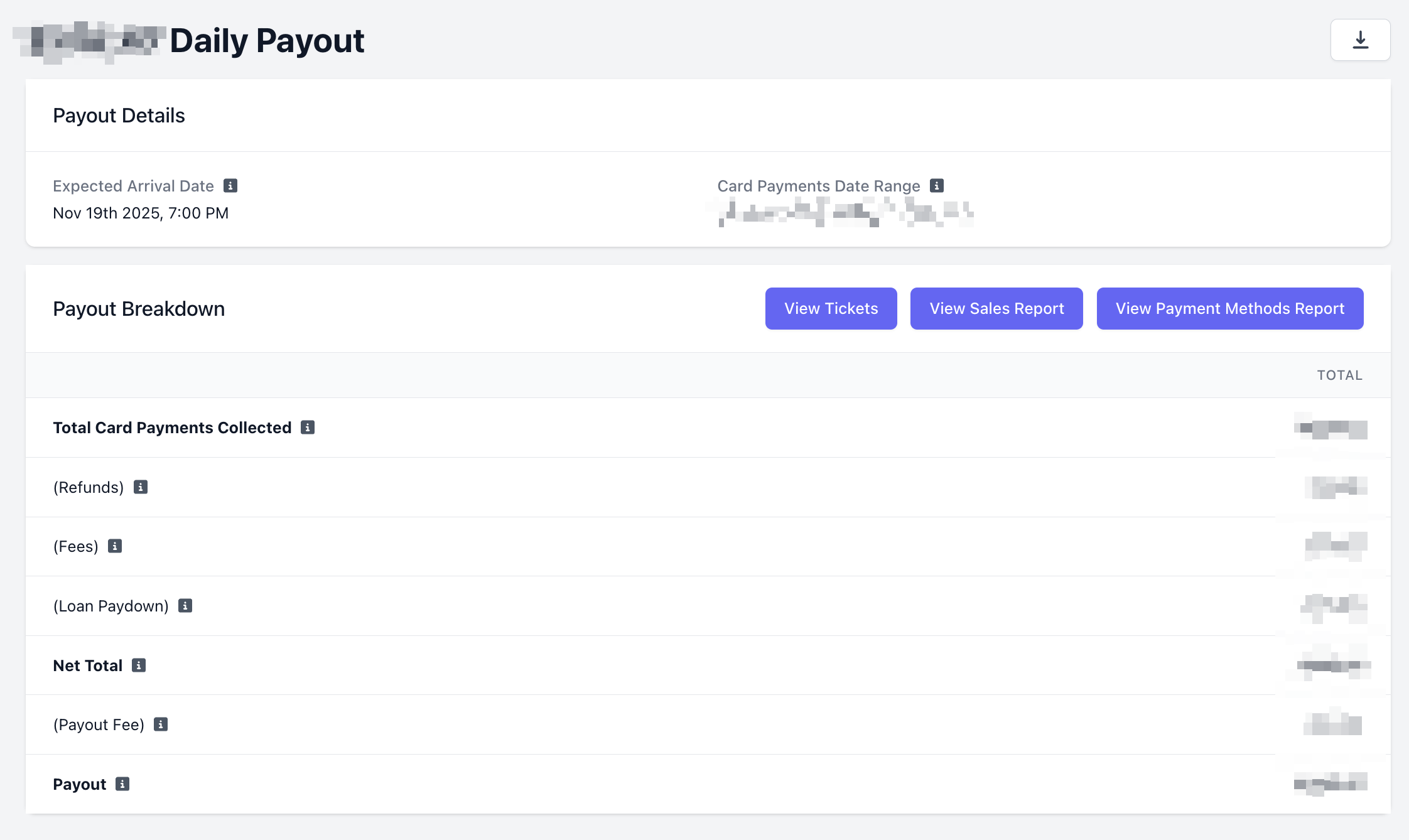 The CSV file will automatically download to your device, where it will break down the following metrics for your payouts: Arrival Date, Card Payments Date Range, Descriptor, Status, Net Payout, Card Payments Start Date, Card Payments End Date, Total Card Payments Collected, Refunds, Fees, Loan Paydown, Payout Fee, Payout, Receiving Account.