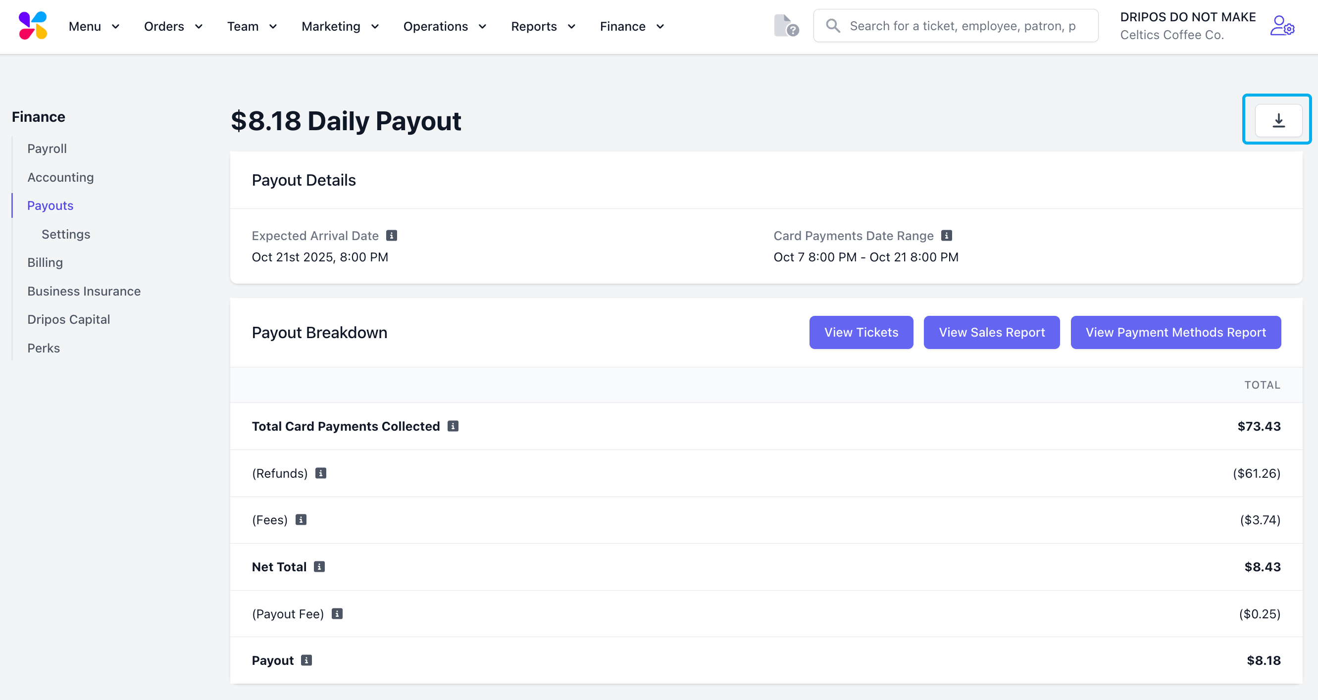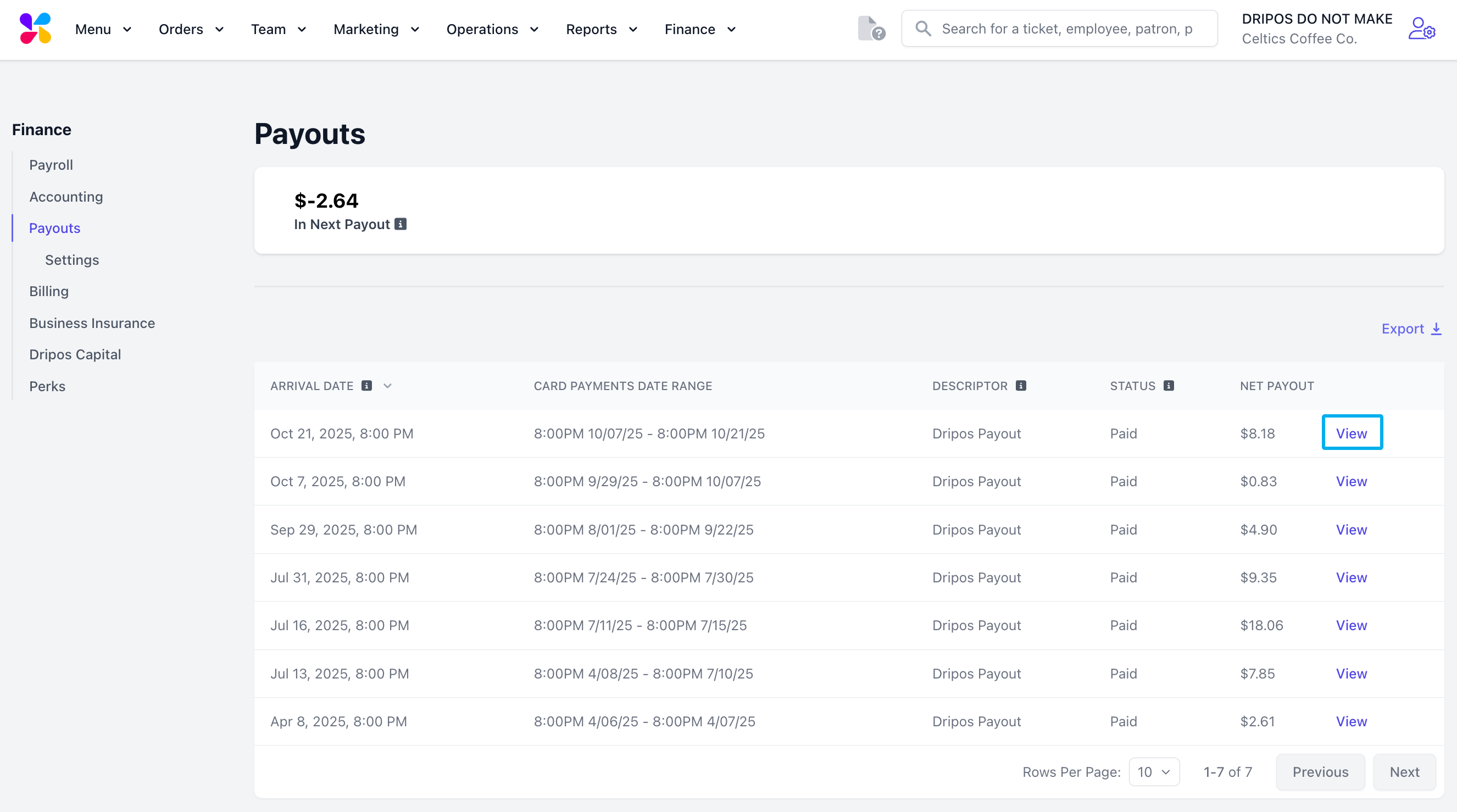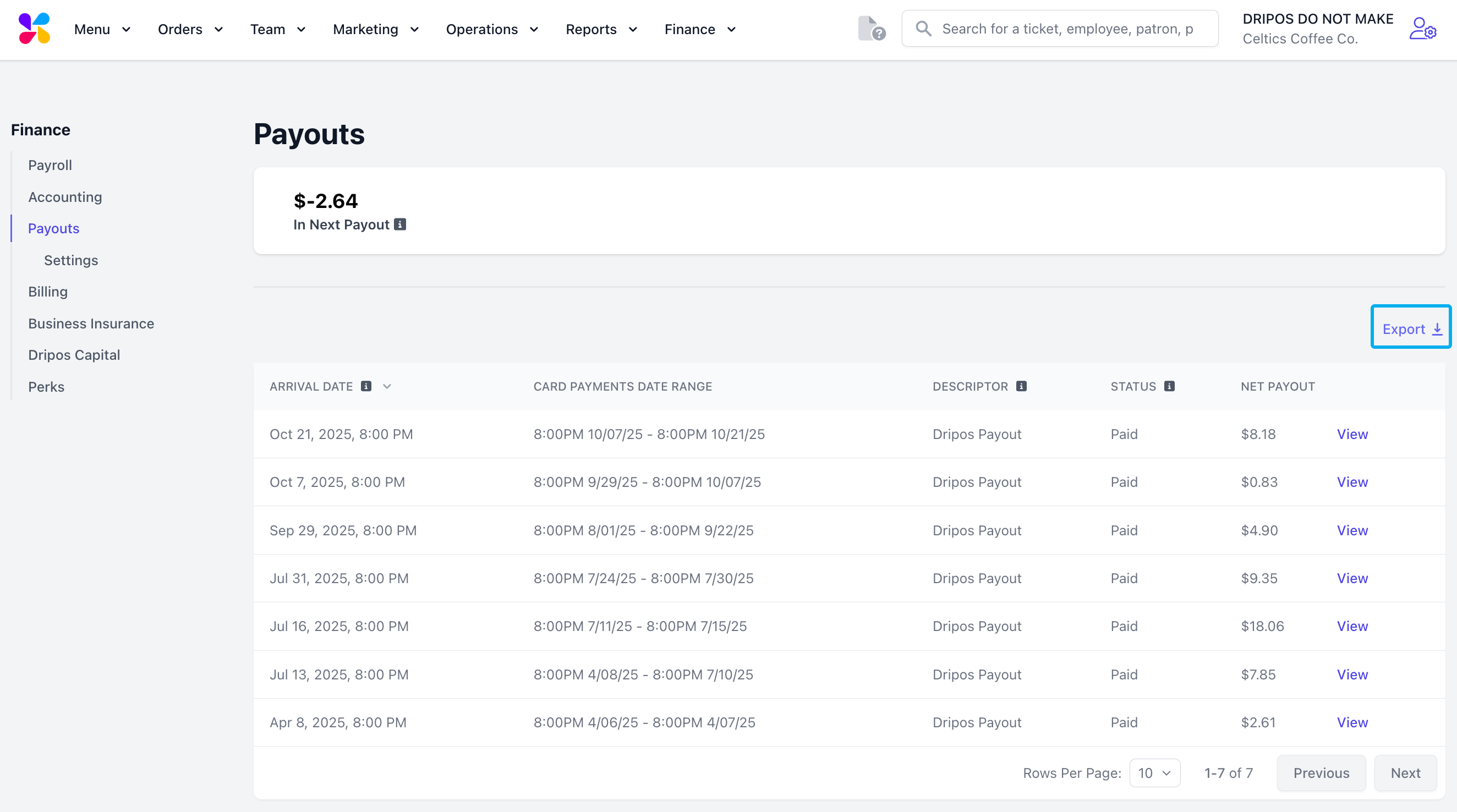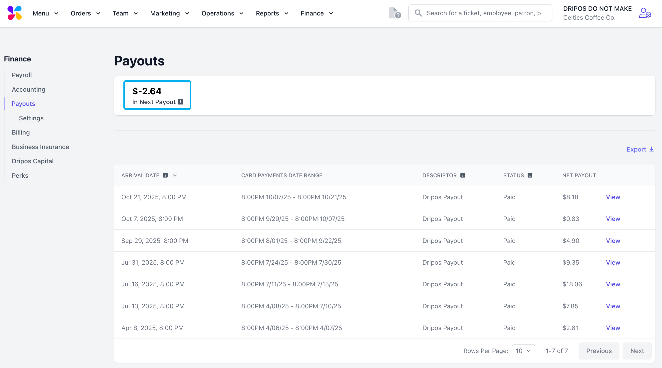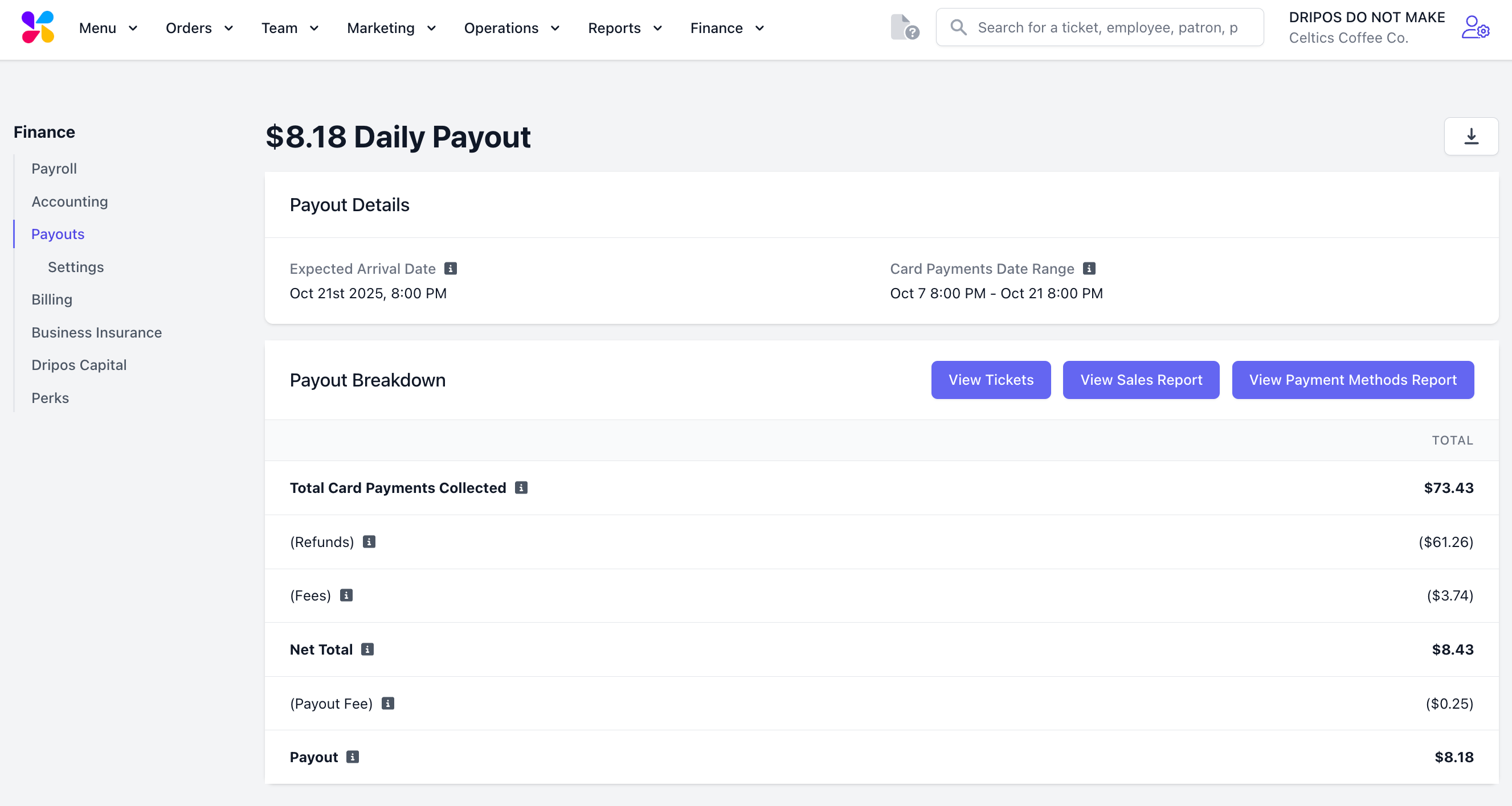 • Loan Paydown (for Dripos Capital users): Amount automatically applied toward repaying your outstanding loan, if applicable. To view your loan terms, navigate to the Dashboard > Finance > Dripos Capital.