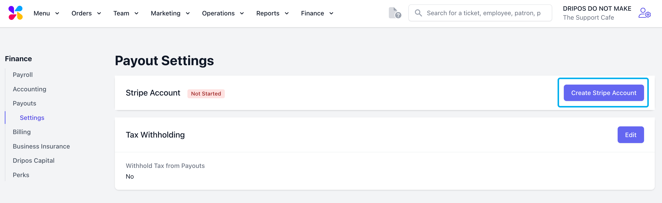 Create a Stripe account through Dripos to activate your sales payouts. On the Dashboard, navigate to Finance > Payouts > Settings > Create Stripe Account