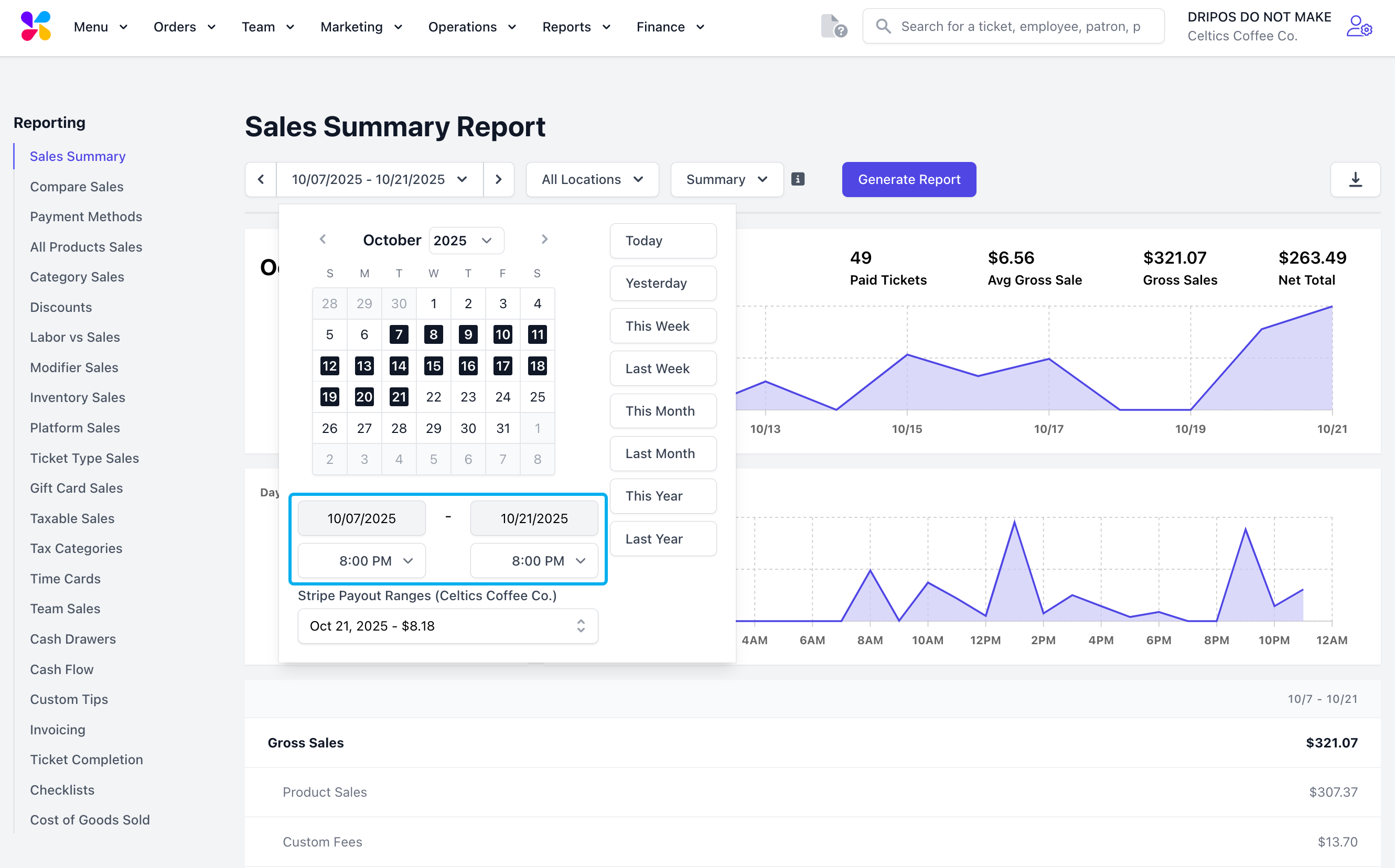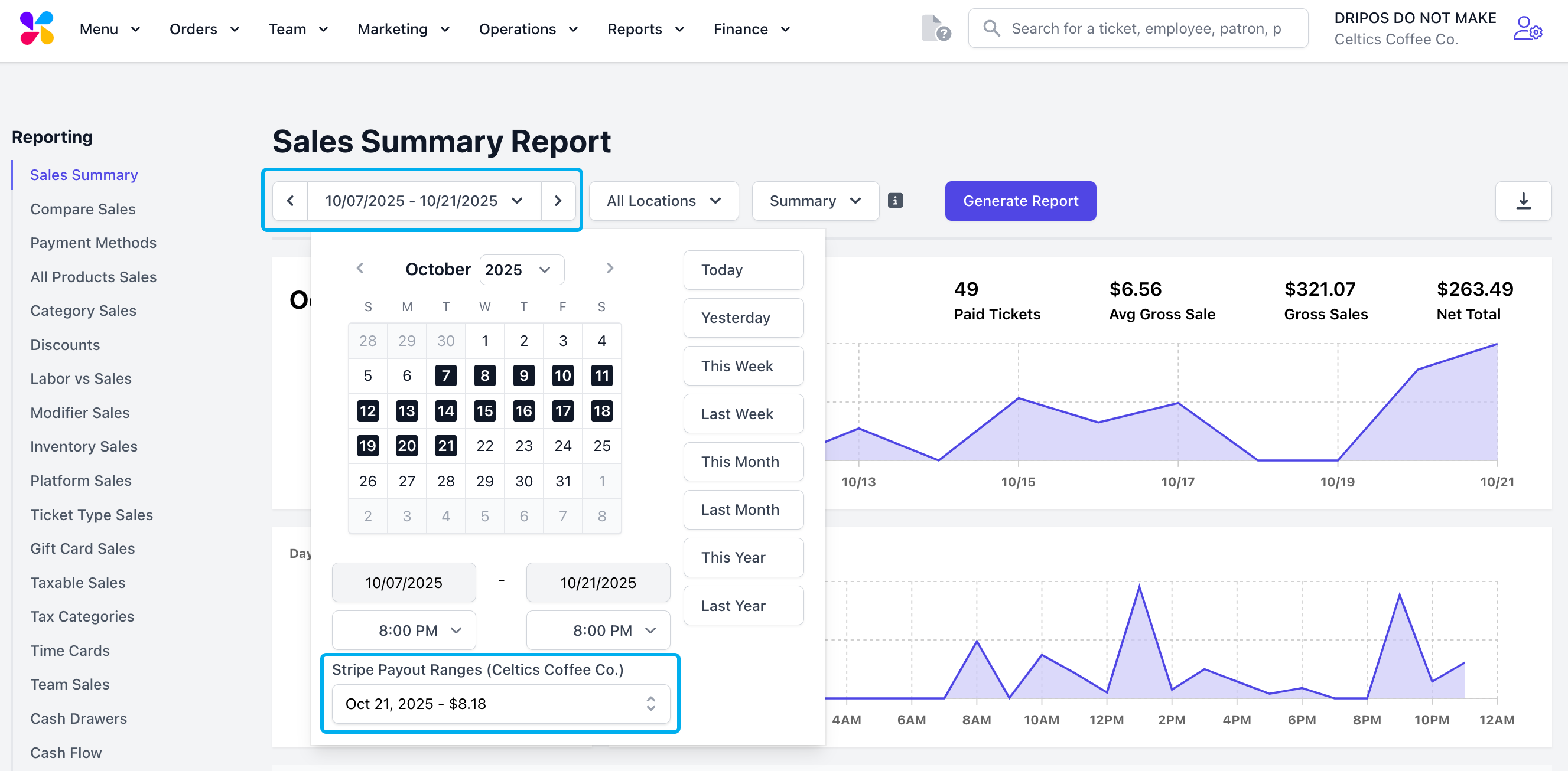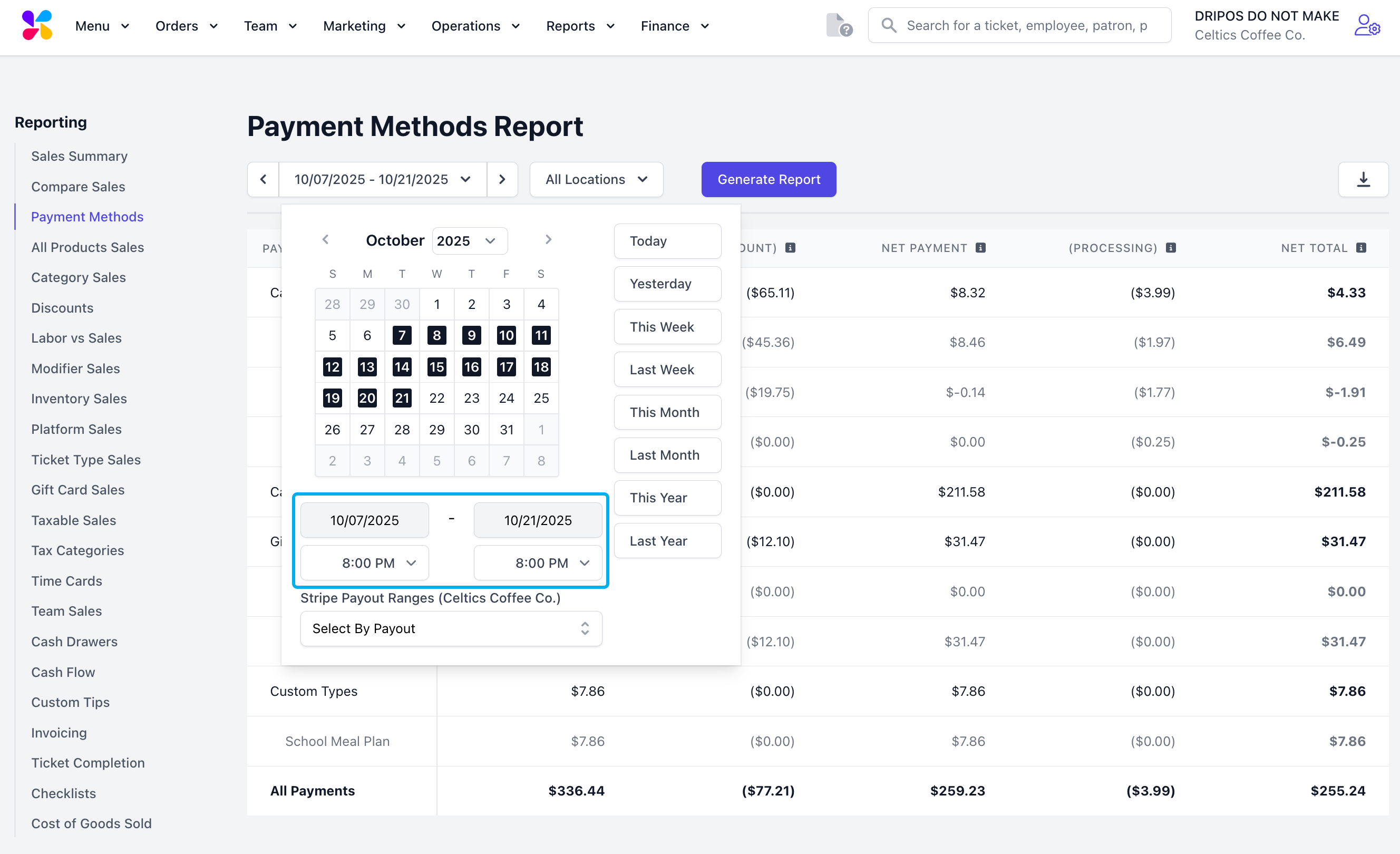 Select the desired payout, and the corresponding sales dates and times will auto-fill. Finally, click Generate Report to see the breakdown. The date and time range of the payout will automatically select on the calendar. The payout amount will match the Net Total of Card payments.