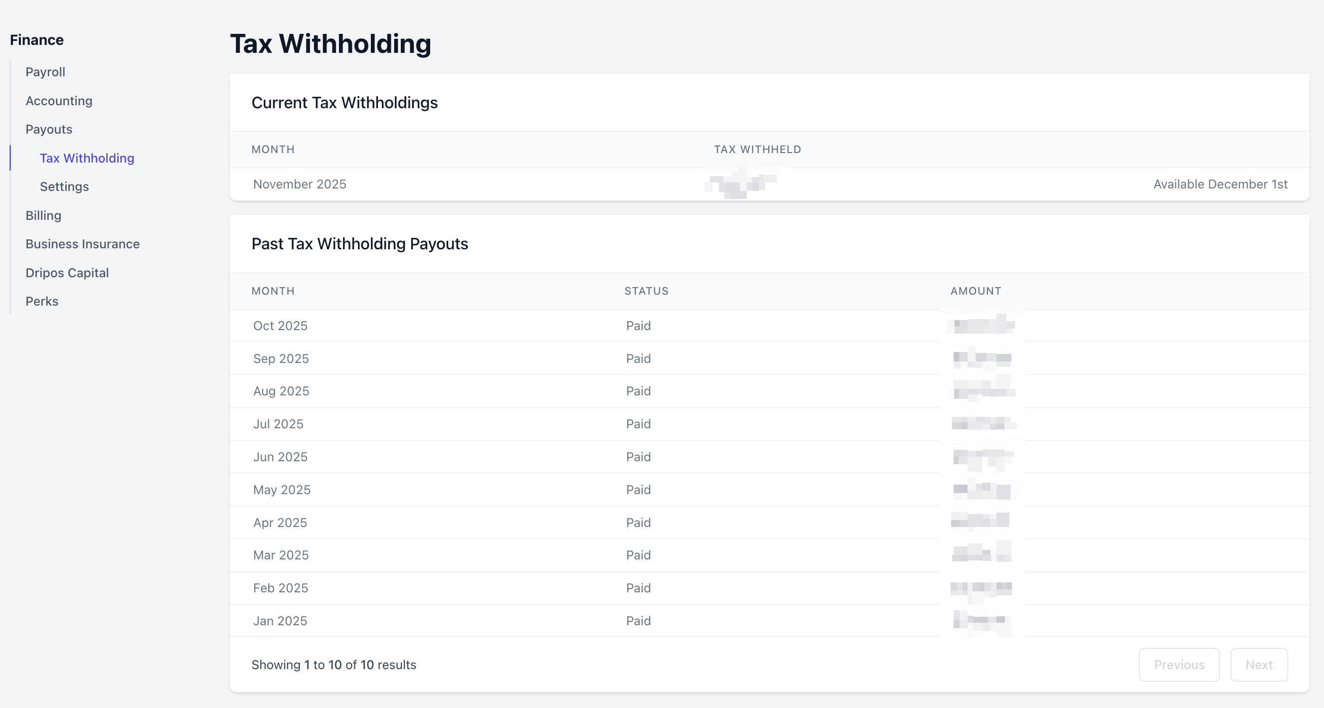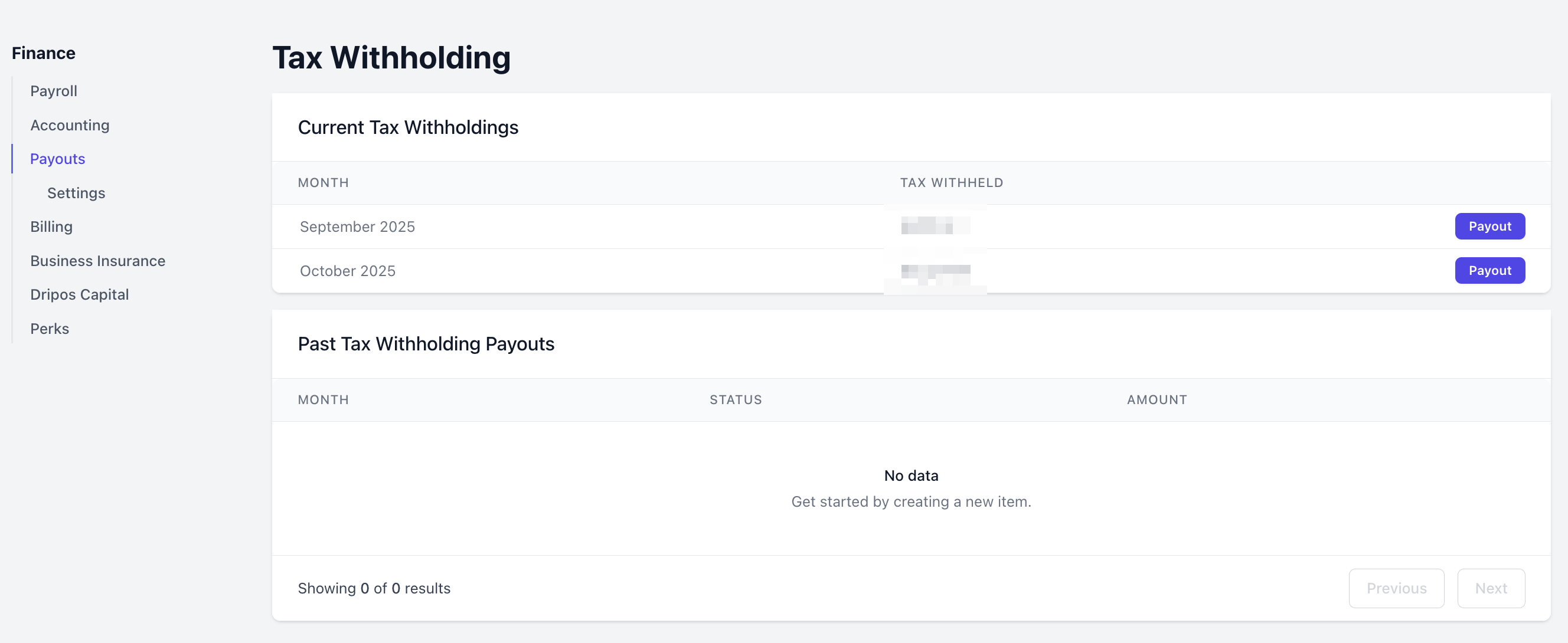 View all taxes currently withheld and past tax withholding payouts under Finance > Payouts > Tax Withholding