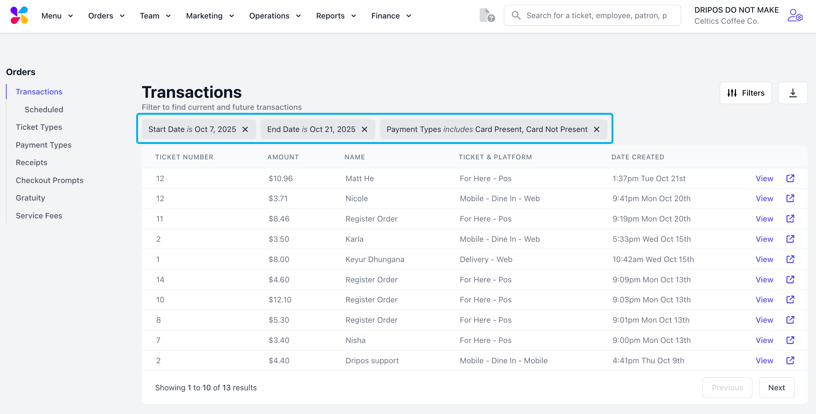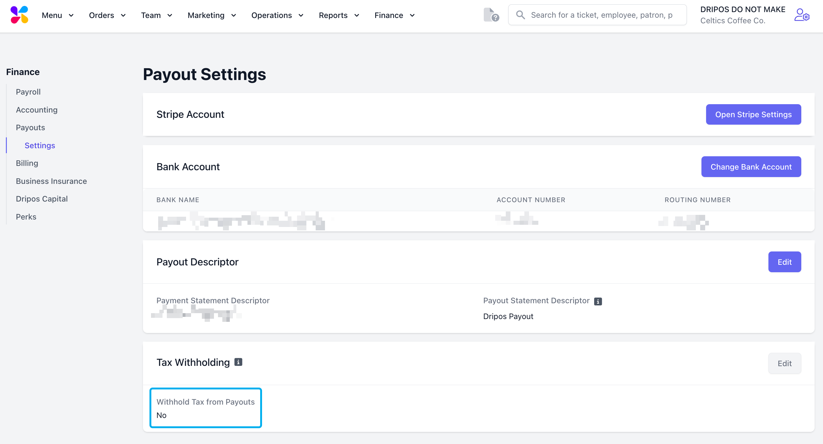 For customers utilizing Dripos’ tax withholding feature, payouts will deposit into your bank account 2-3 business days after the day of sale. To turn off tax withholding and receive faster payouts, reach out to Dripos Support.