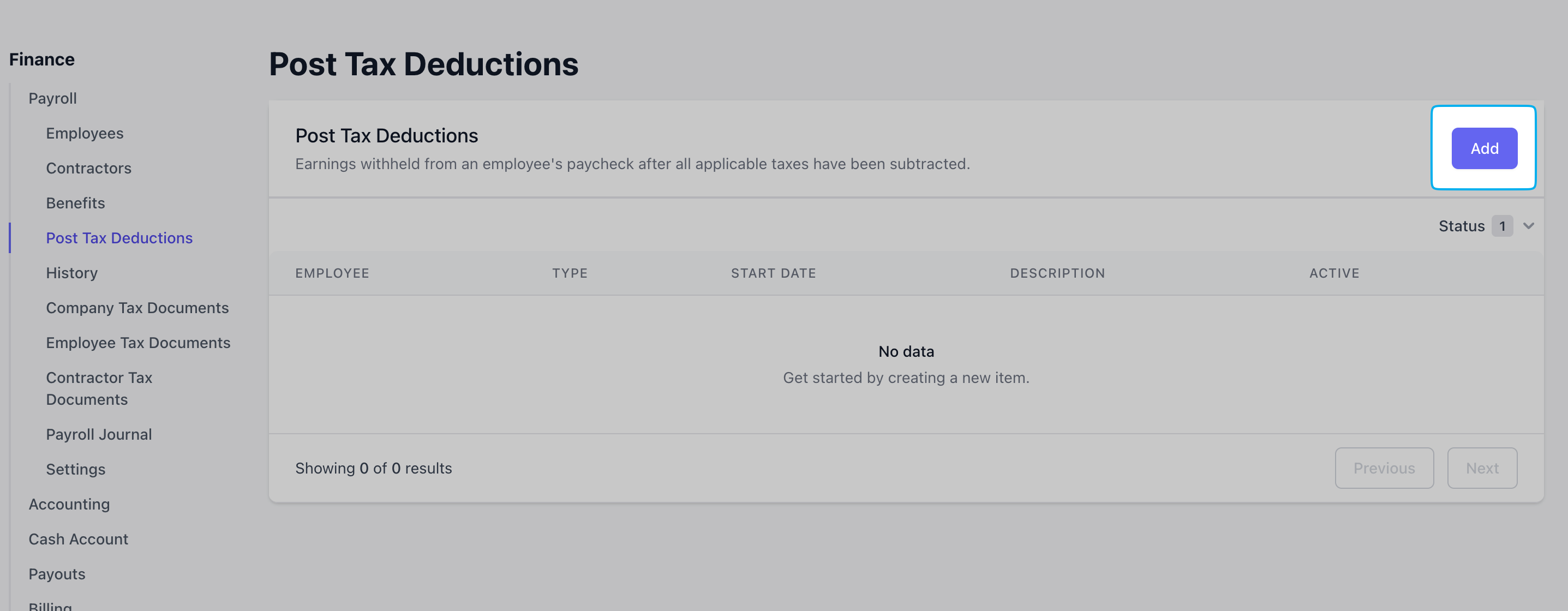 Navigate to Dashboard > Finance > Payroll > Post-Tax Deductions > Add