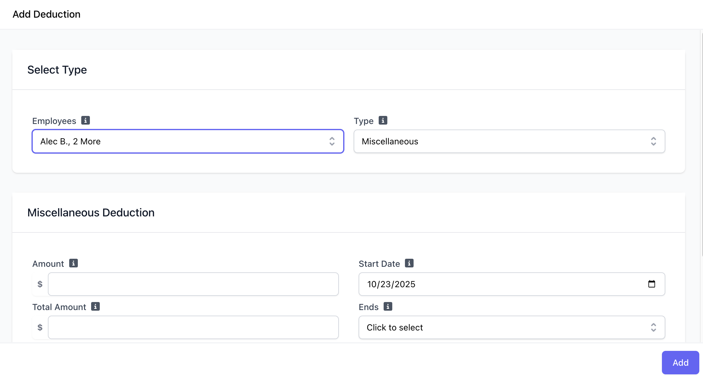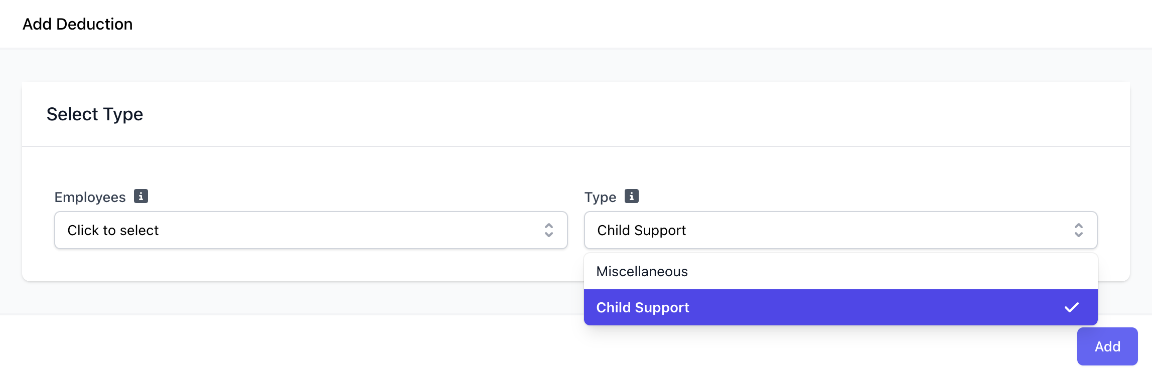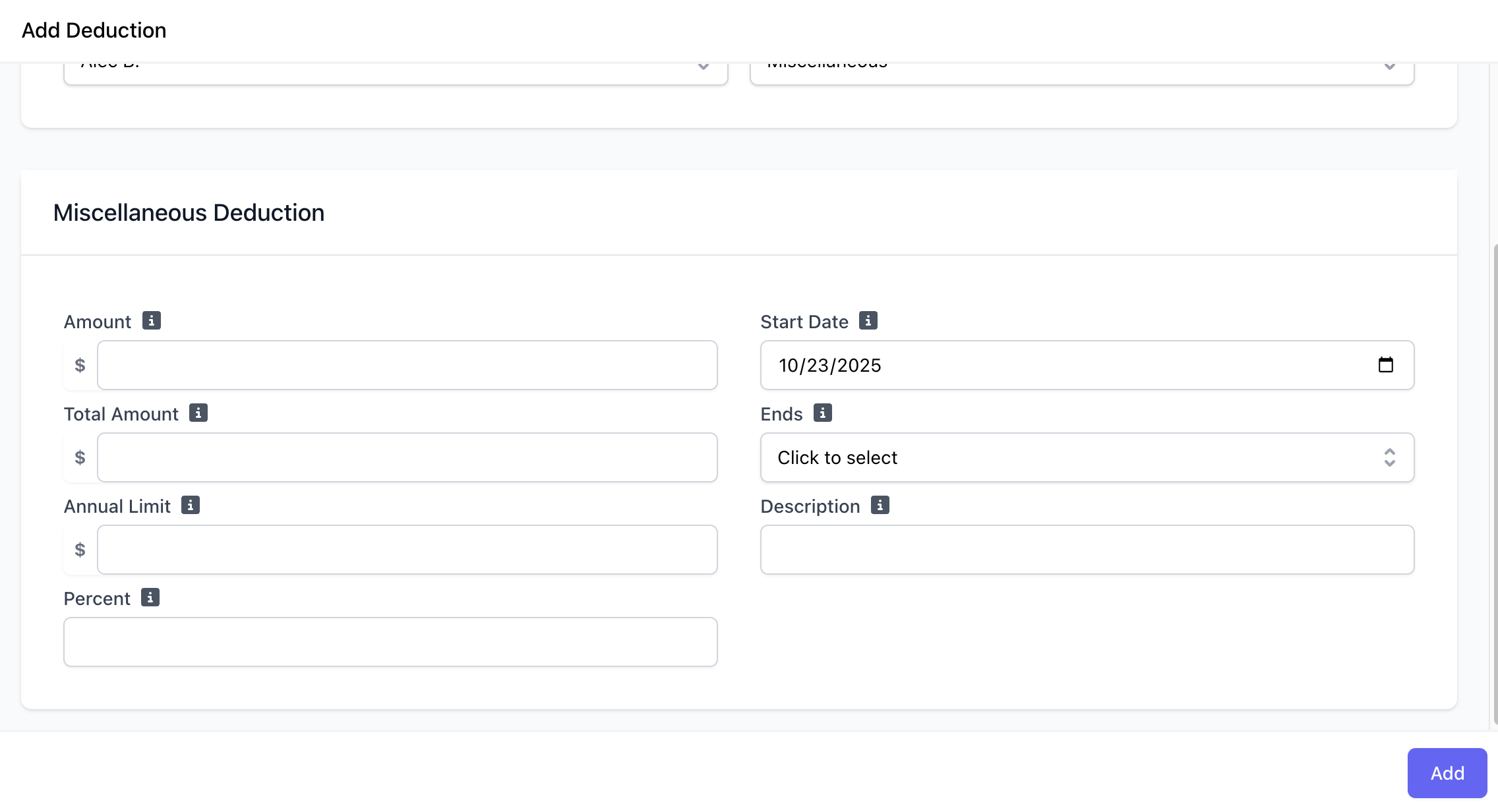 Click Add once complete. This post-tax deduction will go into effect in the employee’s next payrun.