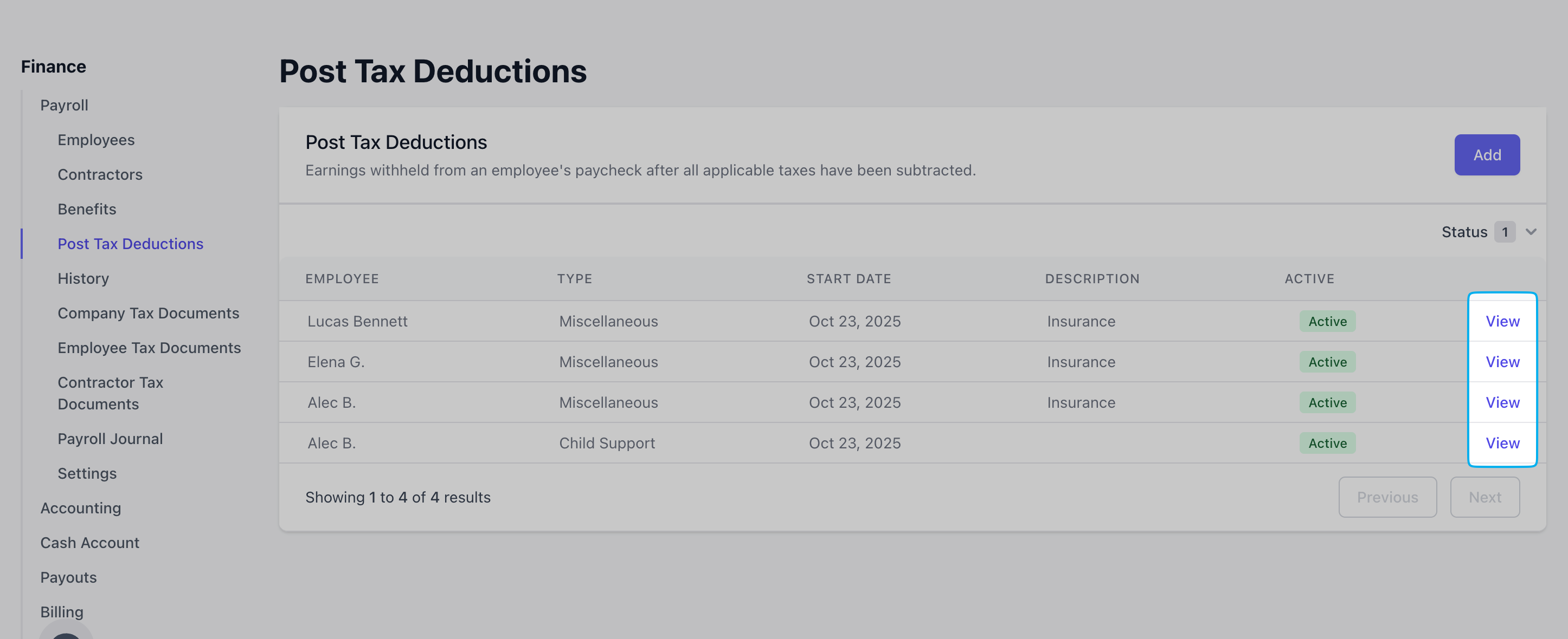 Edit or delete any post-tax deduction by clicking View on an employee’s deduction.