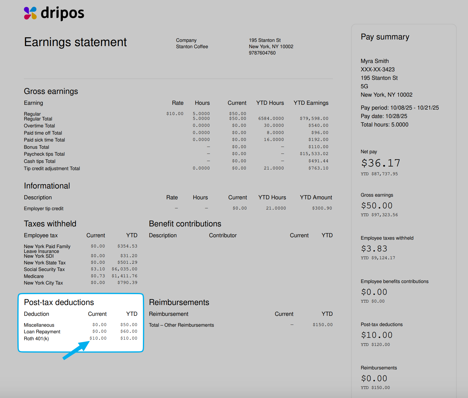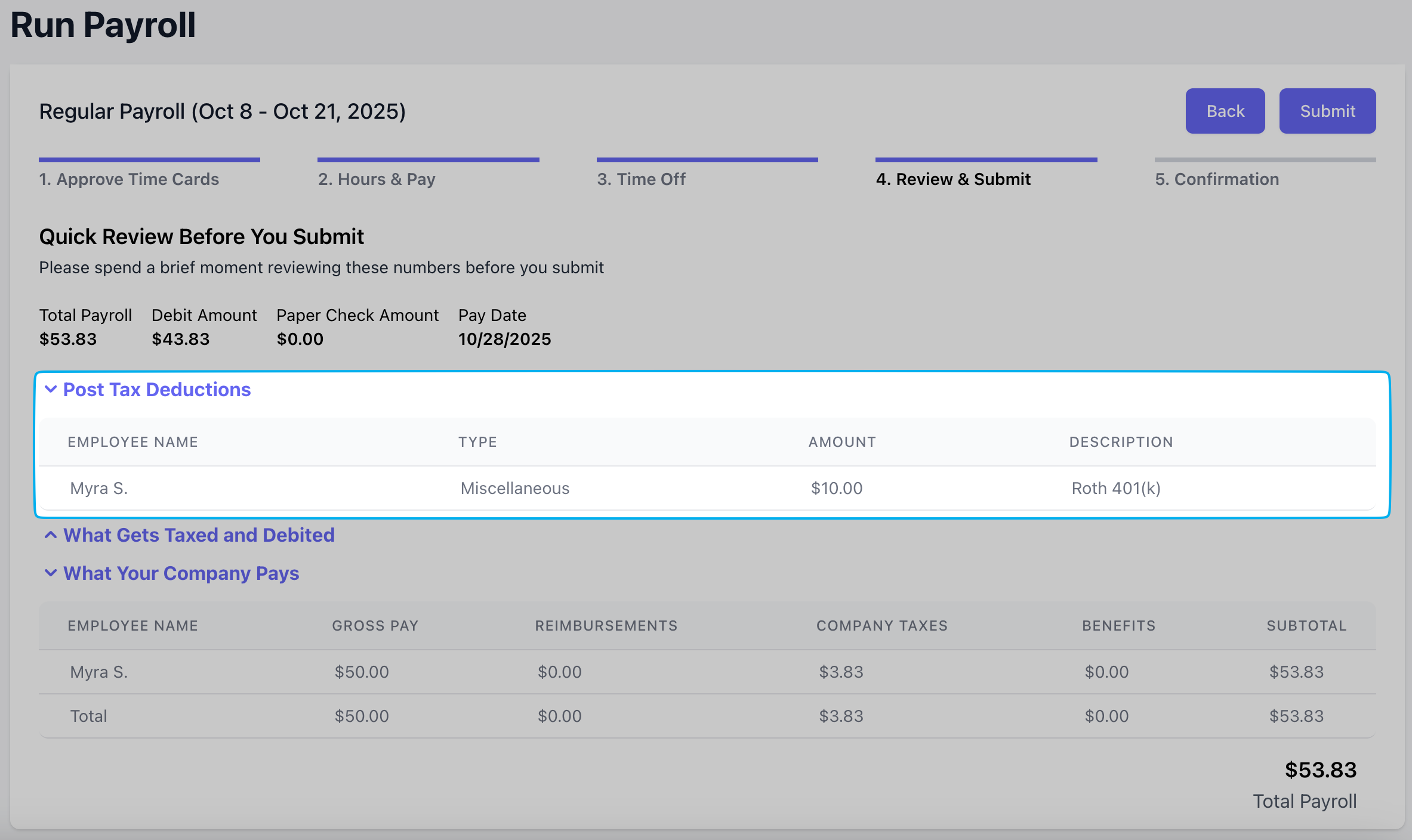 All post-tax deductions to be applied during a payrun will appear on page 4 for review. Once payroll is completed, page 5 will also show the post-tax deduction applied.