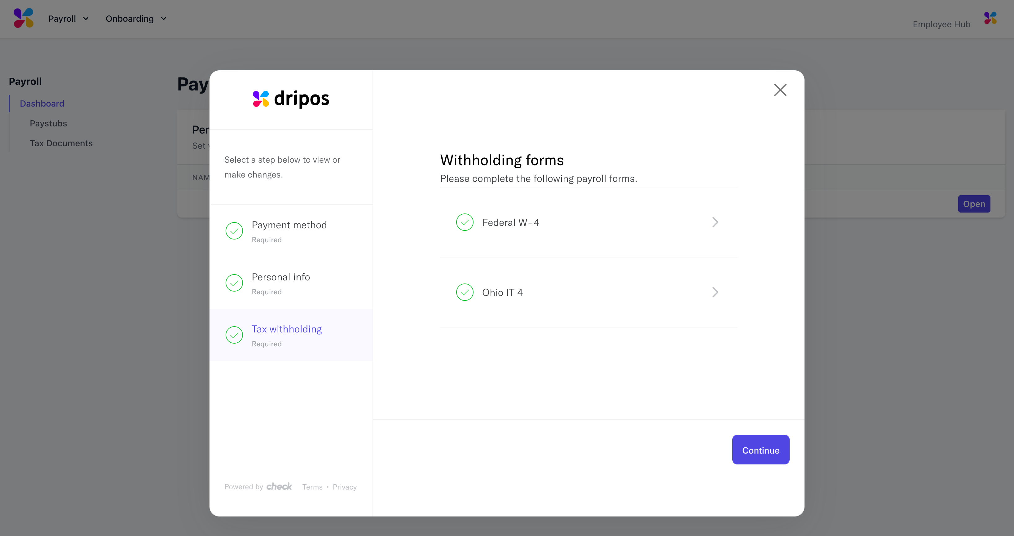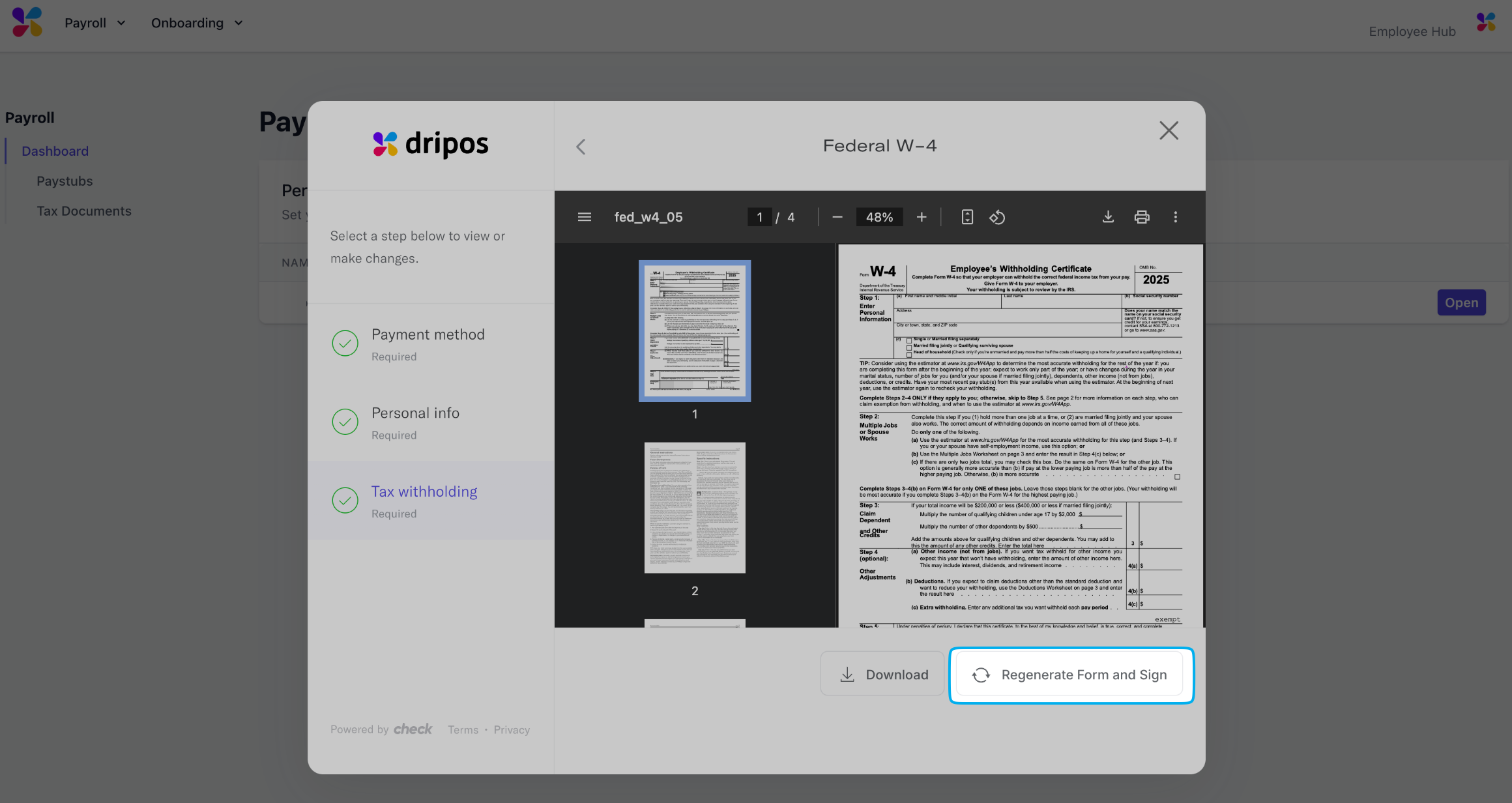 Need to make changes to your already-submitted W-4? Regenerate a new version and instantly submit your changes to the IRS on the Dripos Payroll Hub.1