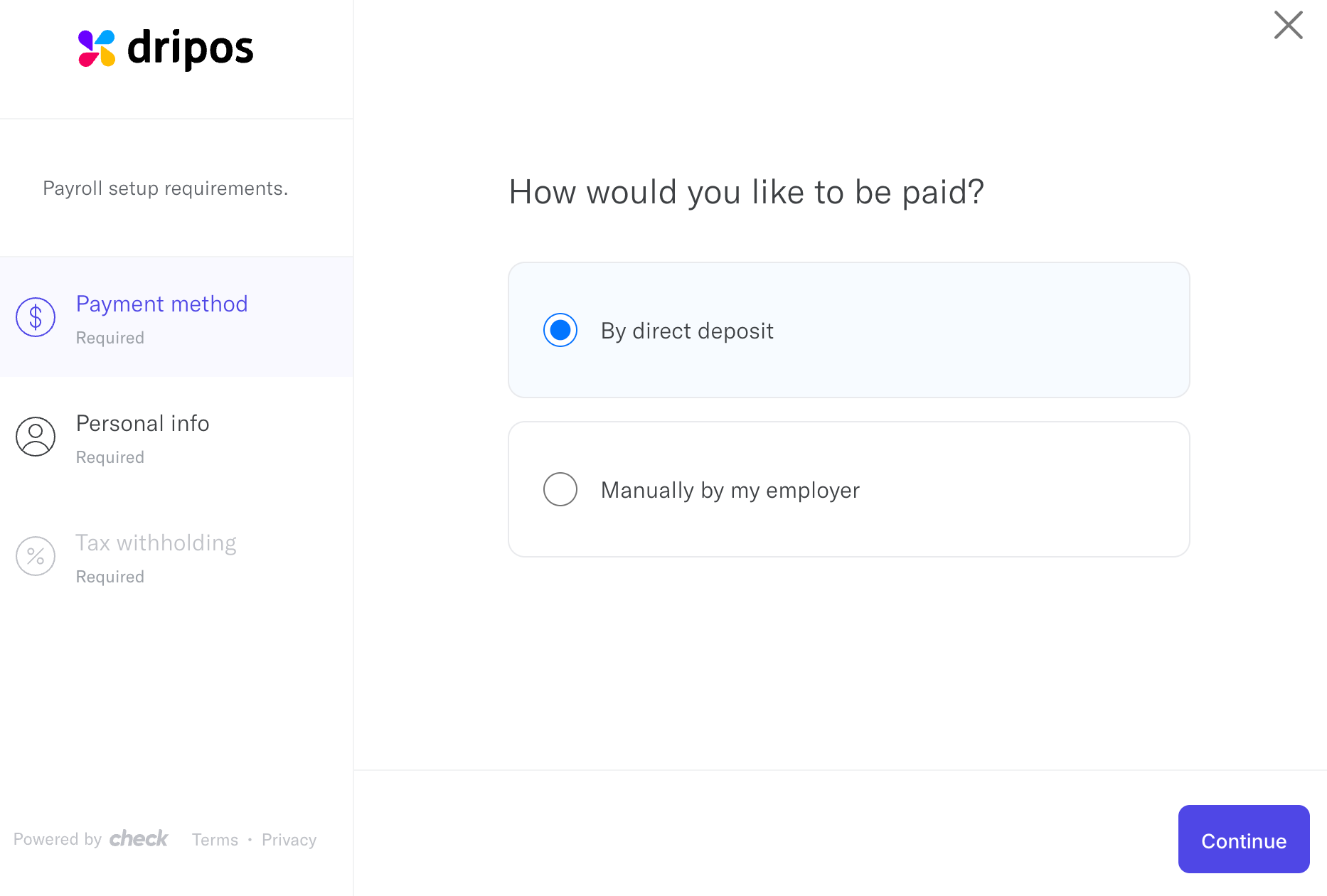 Determine preferred payment method: direct deposit or manual check.Ensure direct deposit information is accurate. If opting for manual check, confirm this payment method with the employer.