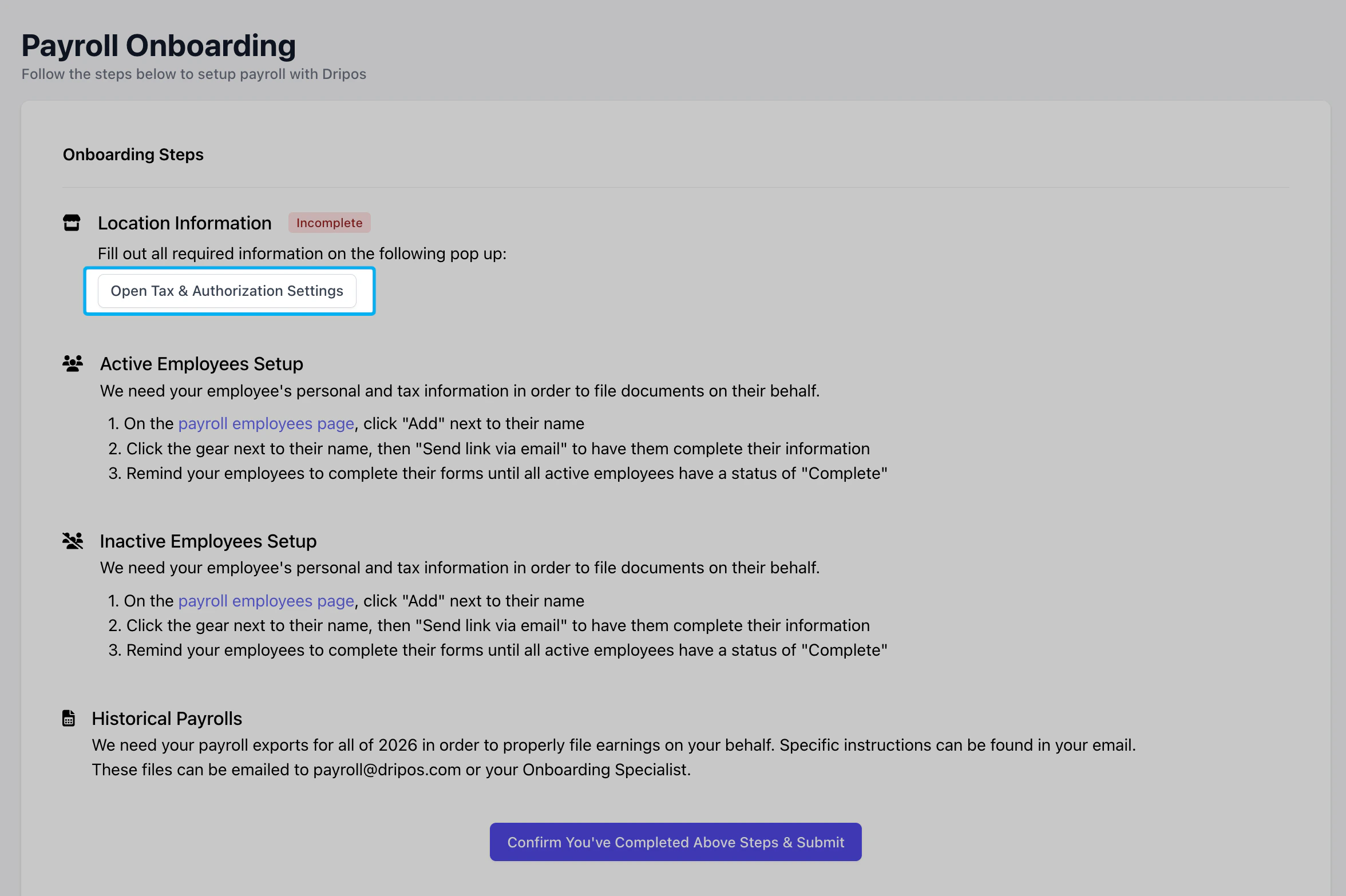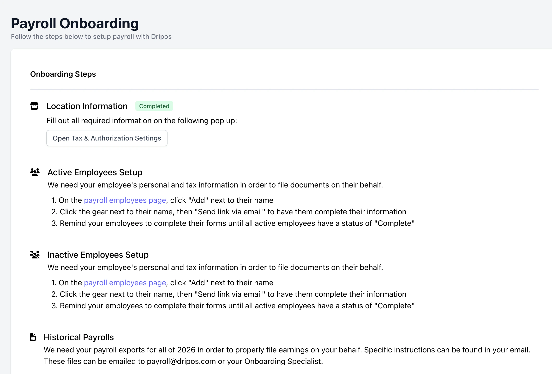 Reach out to your onboarding specialist or Dripos Support to kickstart the payroll process.