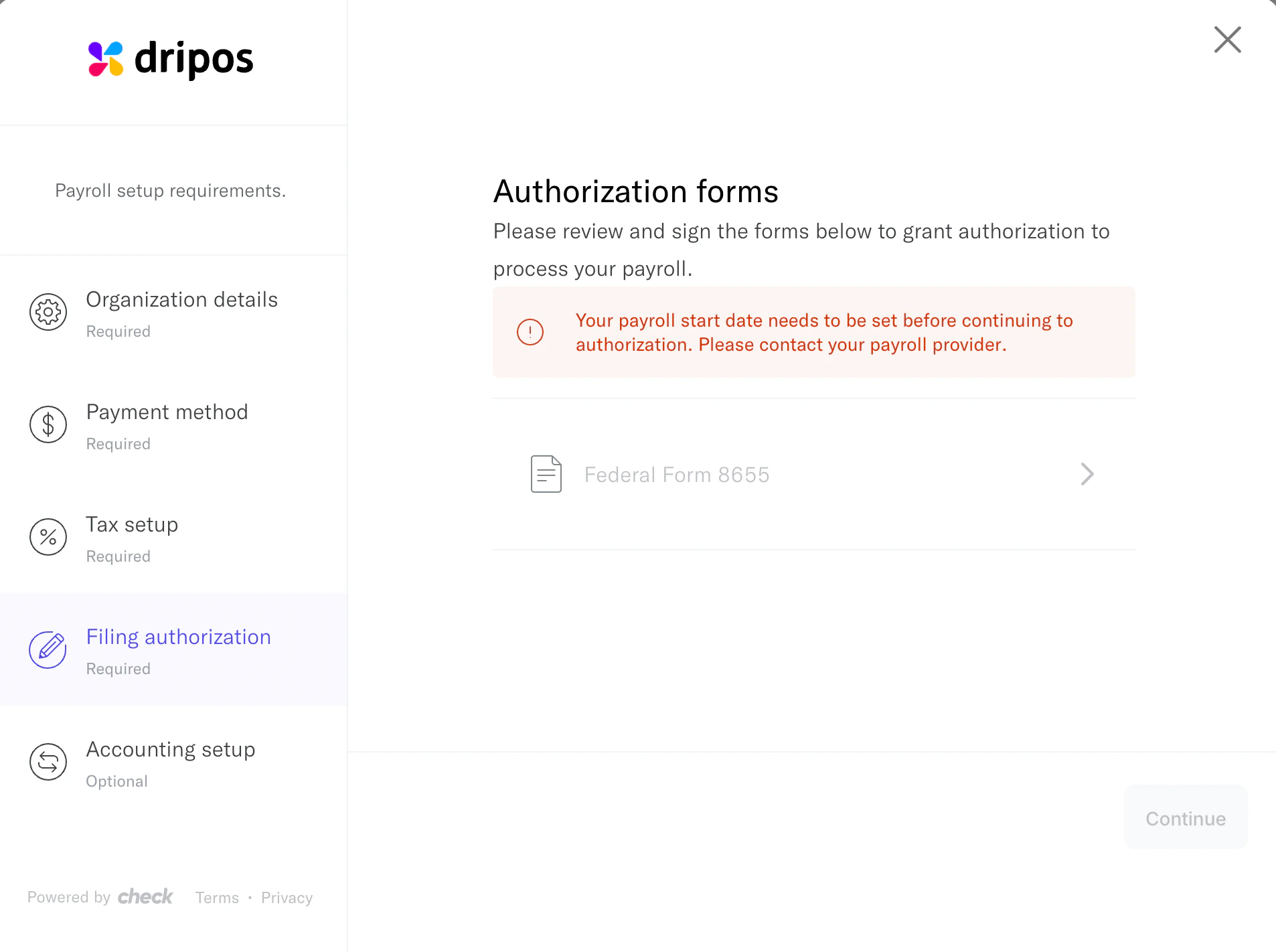 After meeting with your onboarding specialist, continue setting up your payroll account on the Payroll Dashboard.Open Tax & Authorization Settings