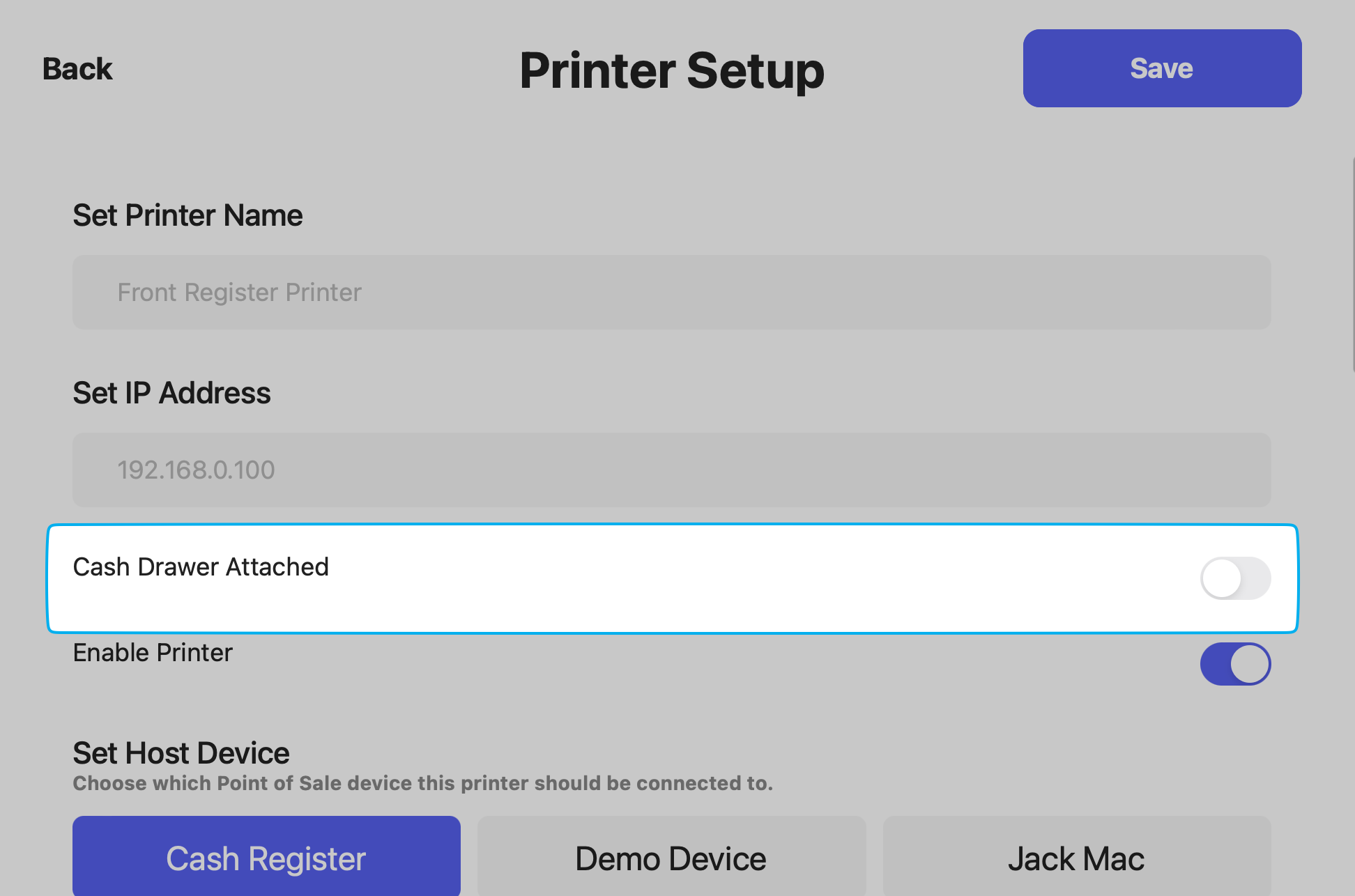 Enable the toggle Cash Drawer Attached > press Save