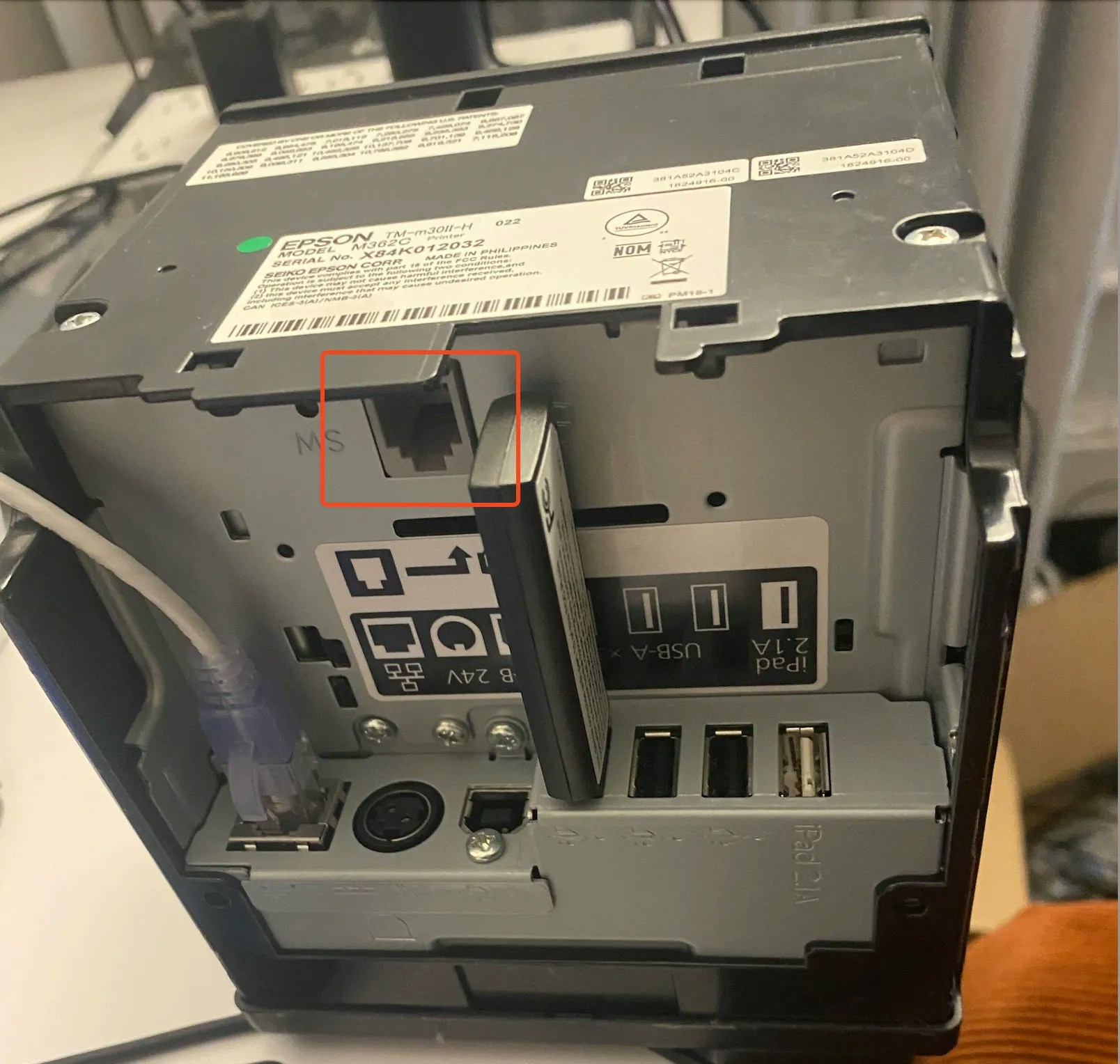 Plug the RJ11/RJ12 network cable into the back of the cash drawer and into the Epson printer.