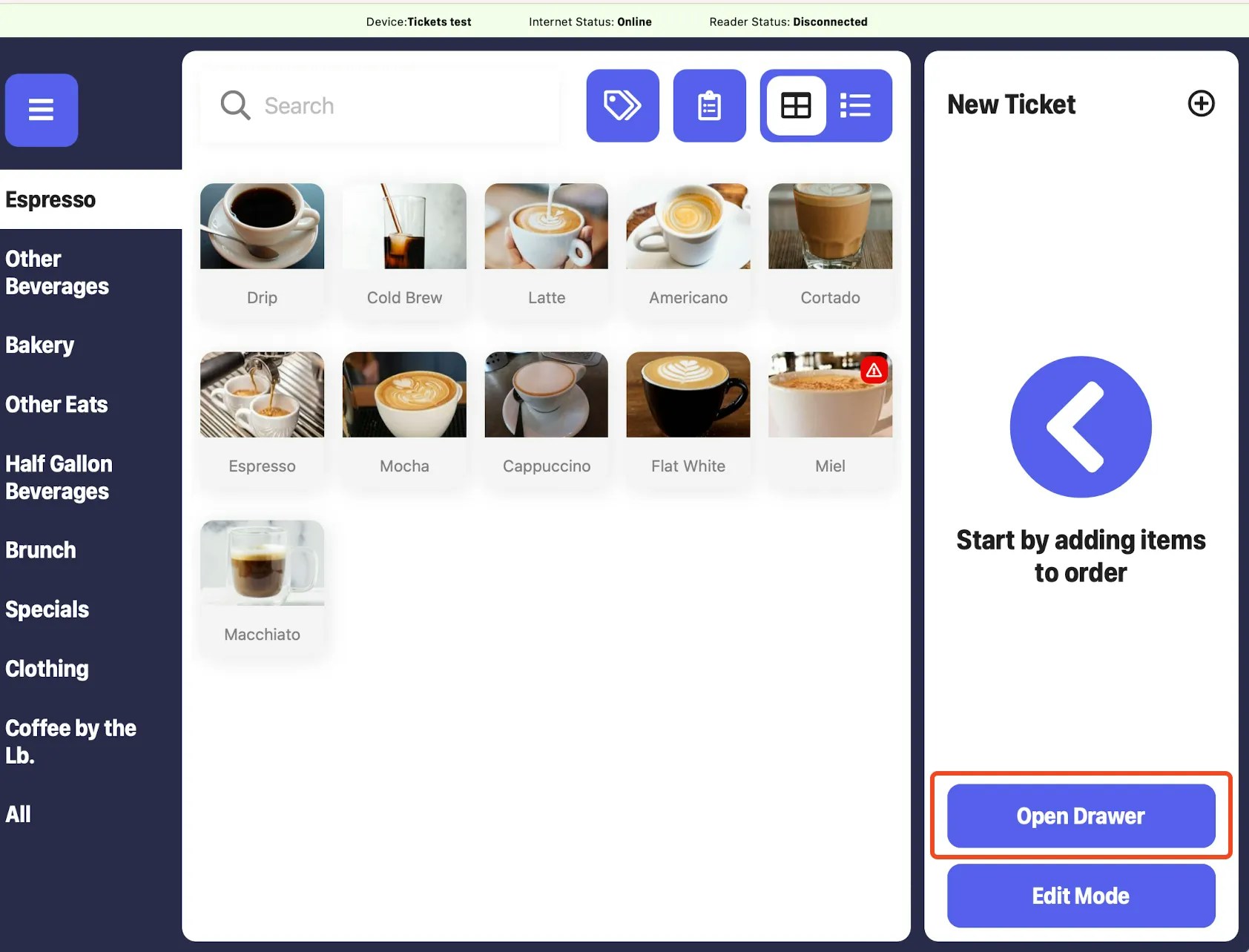 On the register screen, the Open Drawer button will appear for Use