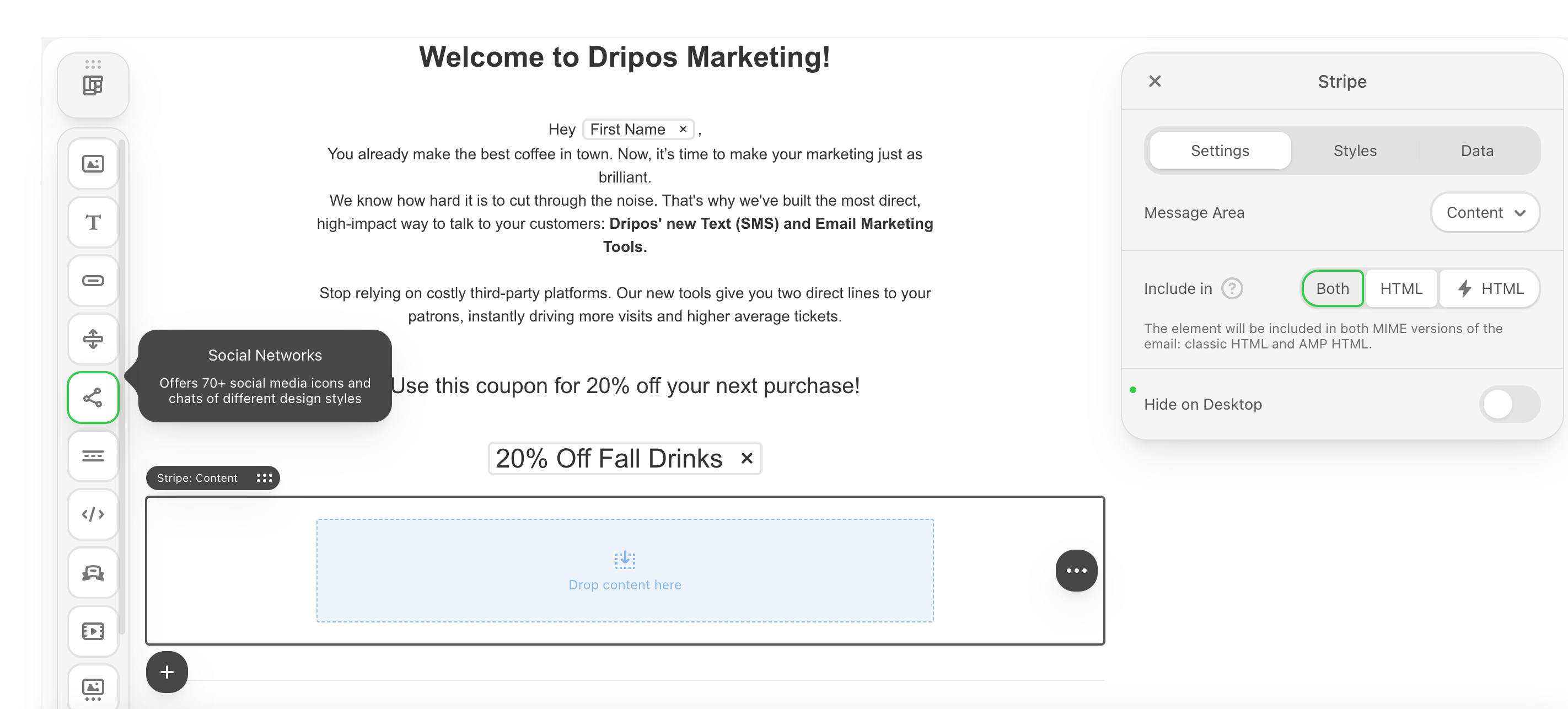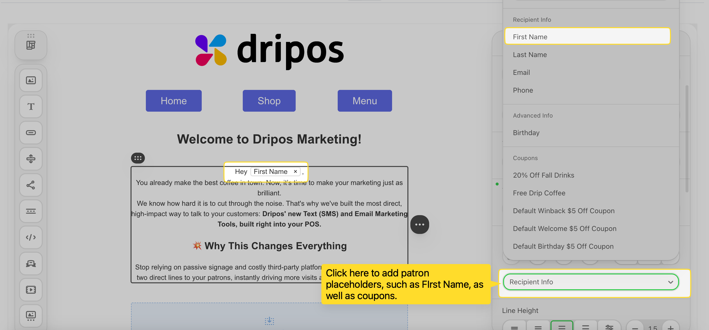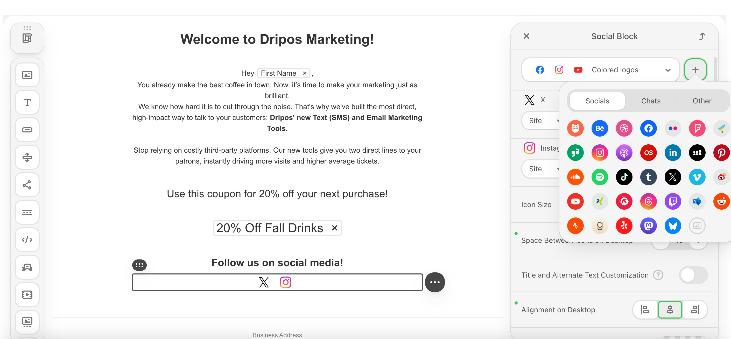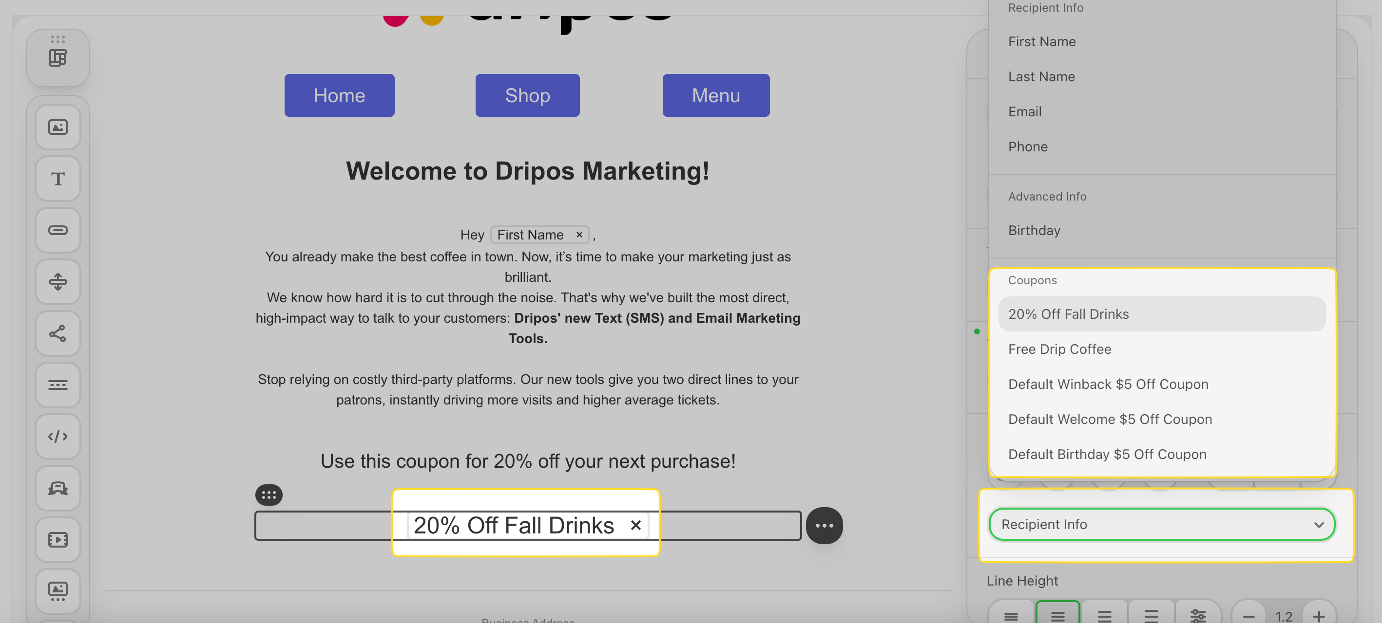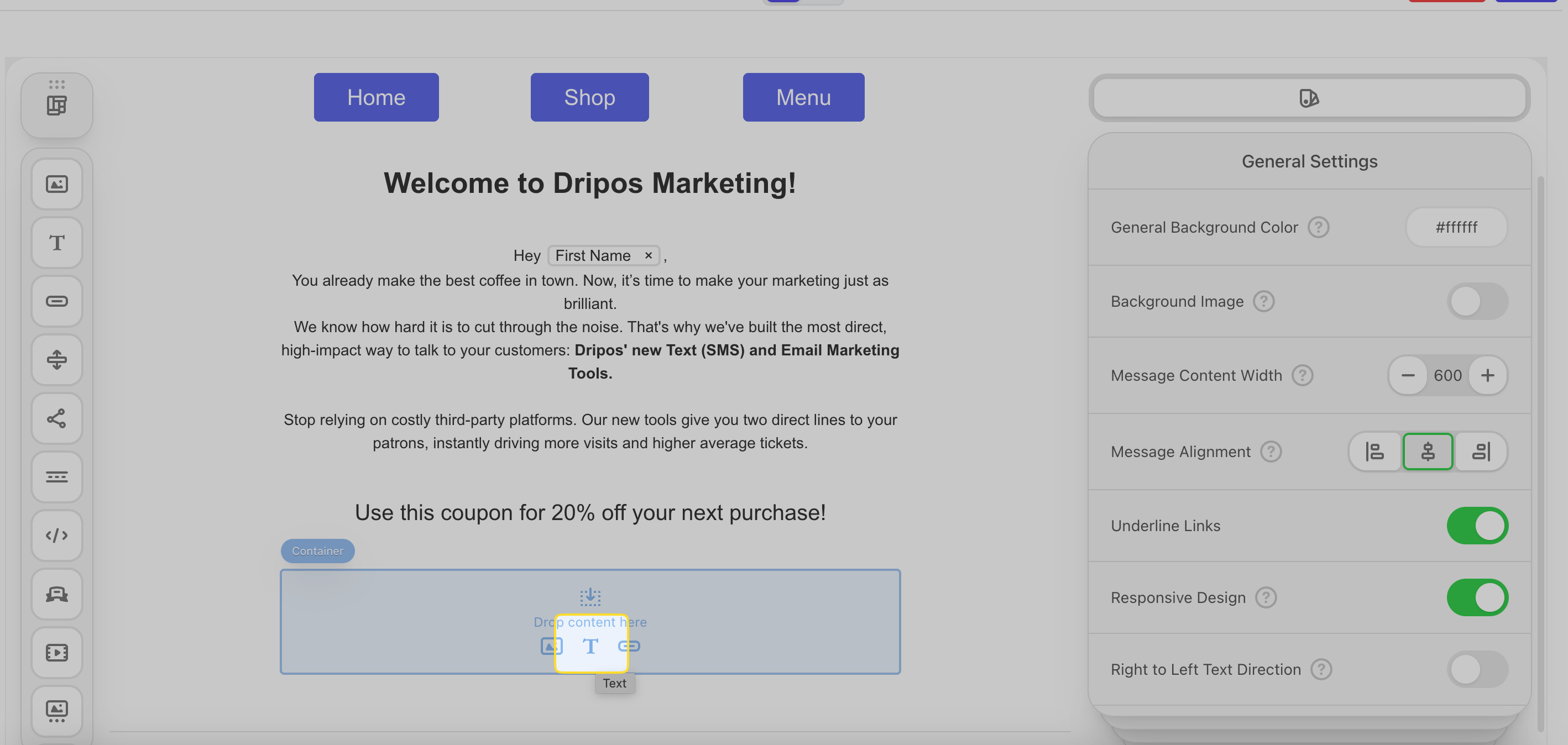 Send your customers coupon codes via email. Dripos offers two types of coupon codes: Generic Coupon Codes and Unique Coupon Codes.What’s the difference?Consider a few things before picking your coupon type:Click the text icon in an empty container to add a text box.