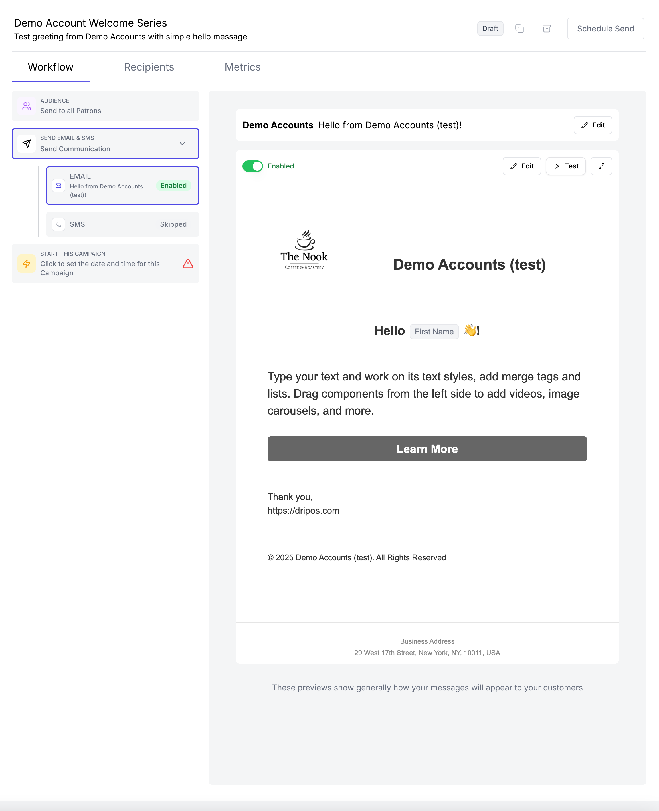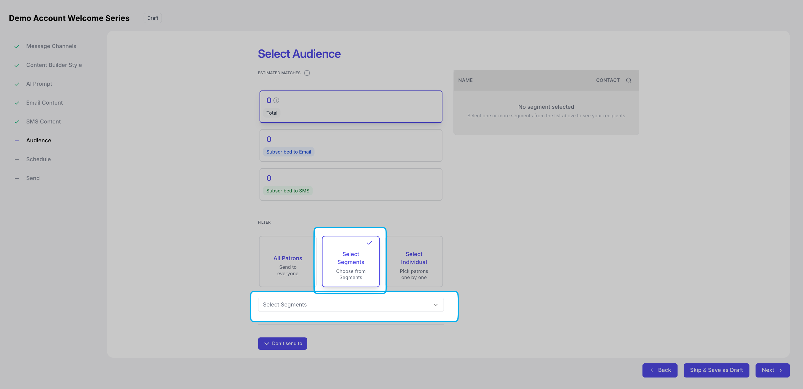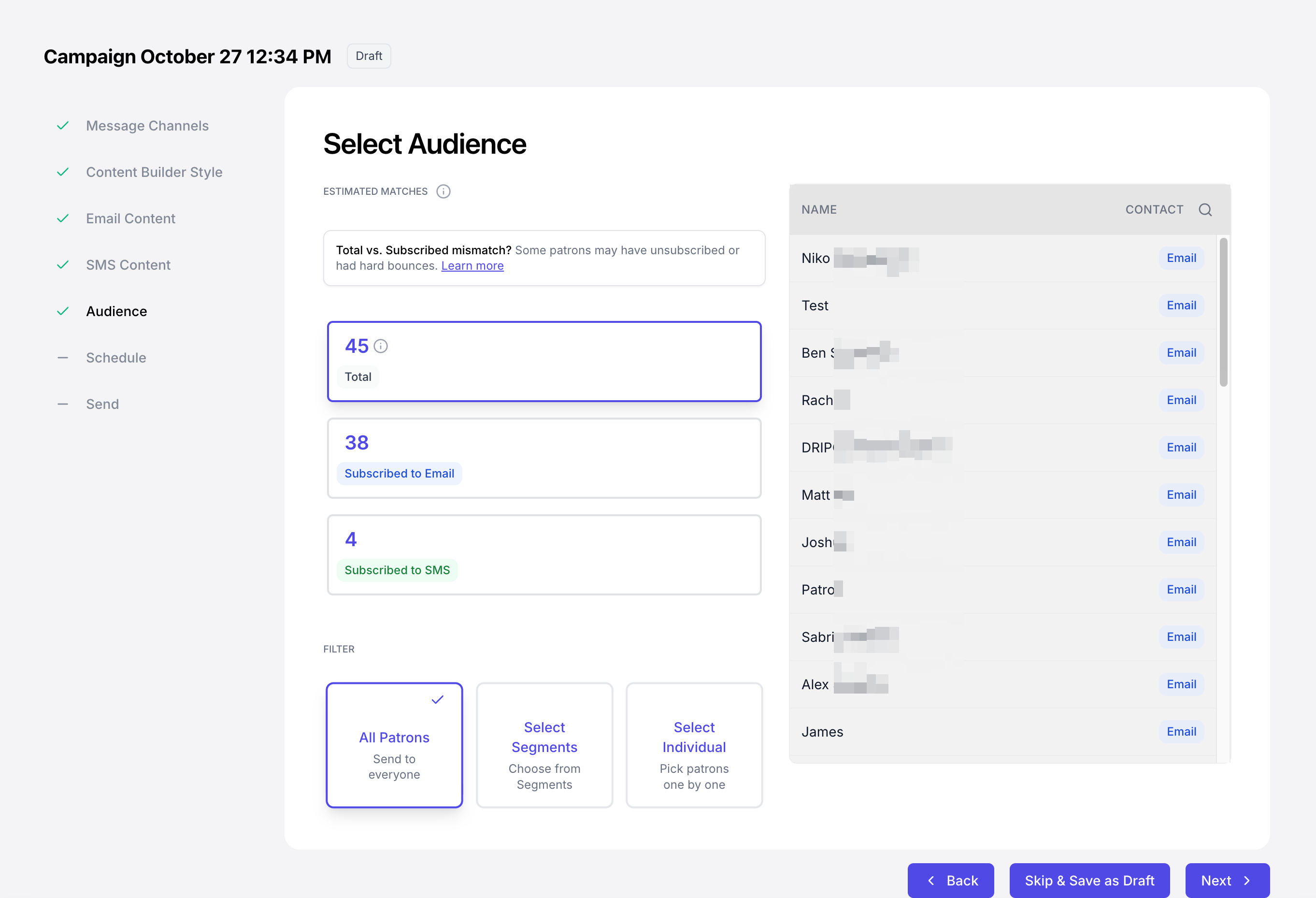 Determine who to send a campaign to, whether its all email and SMS subscribers or a specific segment of customers.All Patrons
