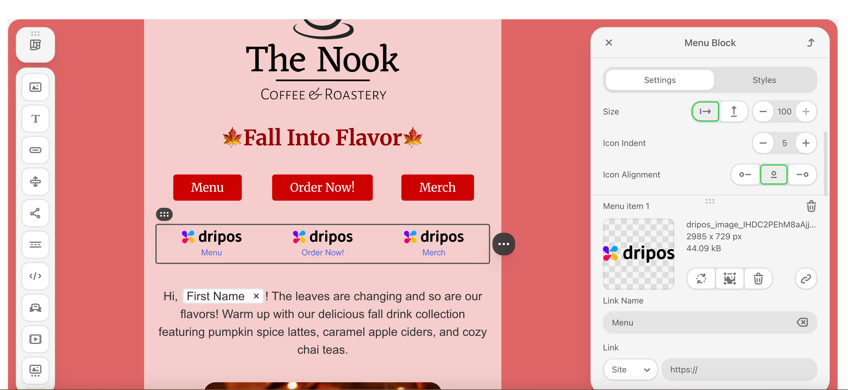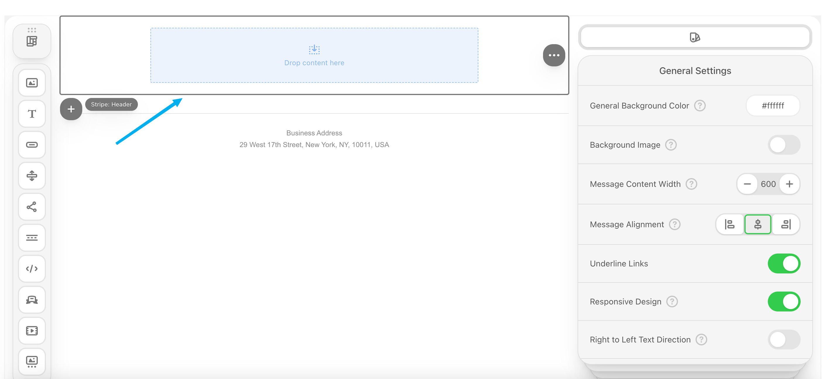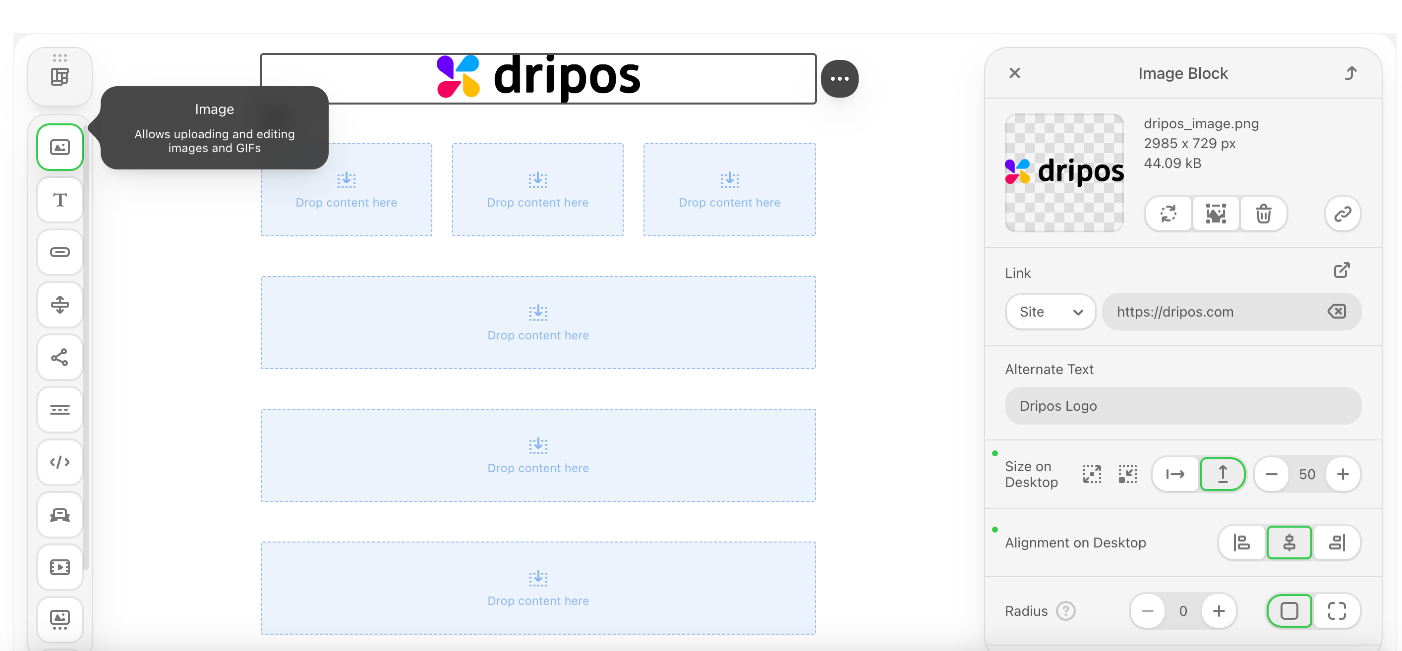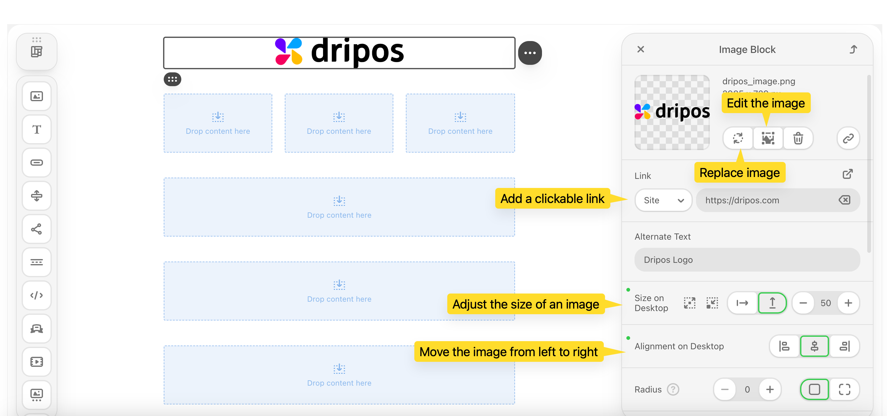 Add images to your emails, edit them in real time, add clickable links, and more!Drag and drop the image icon into a container.