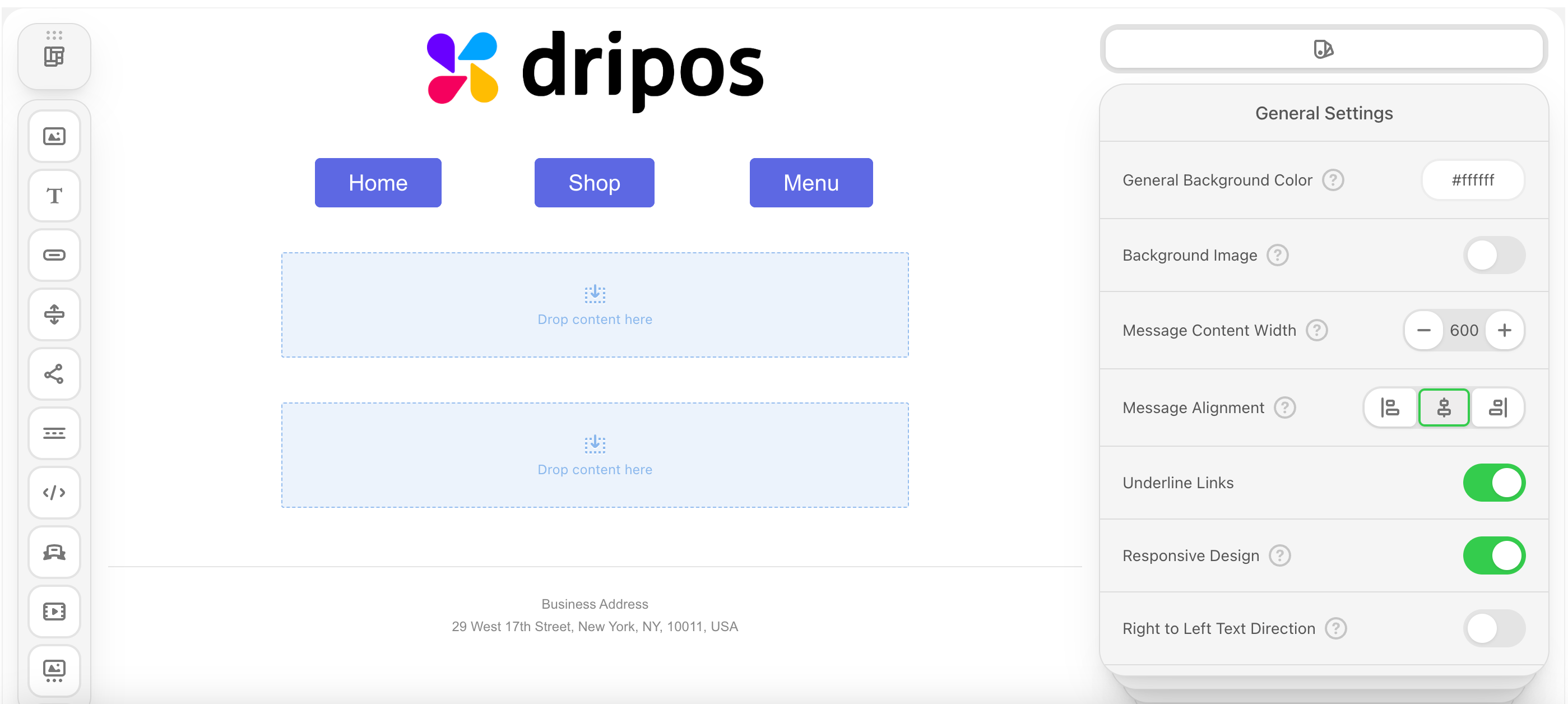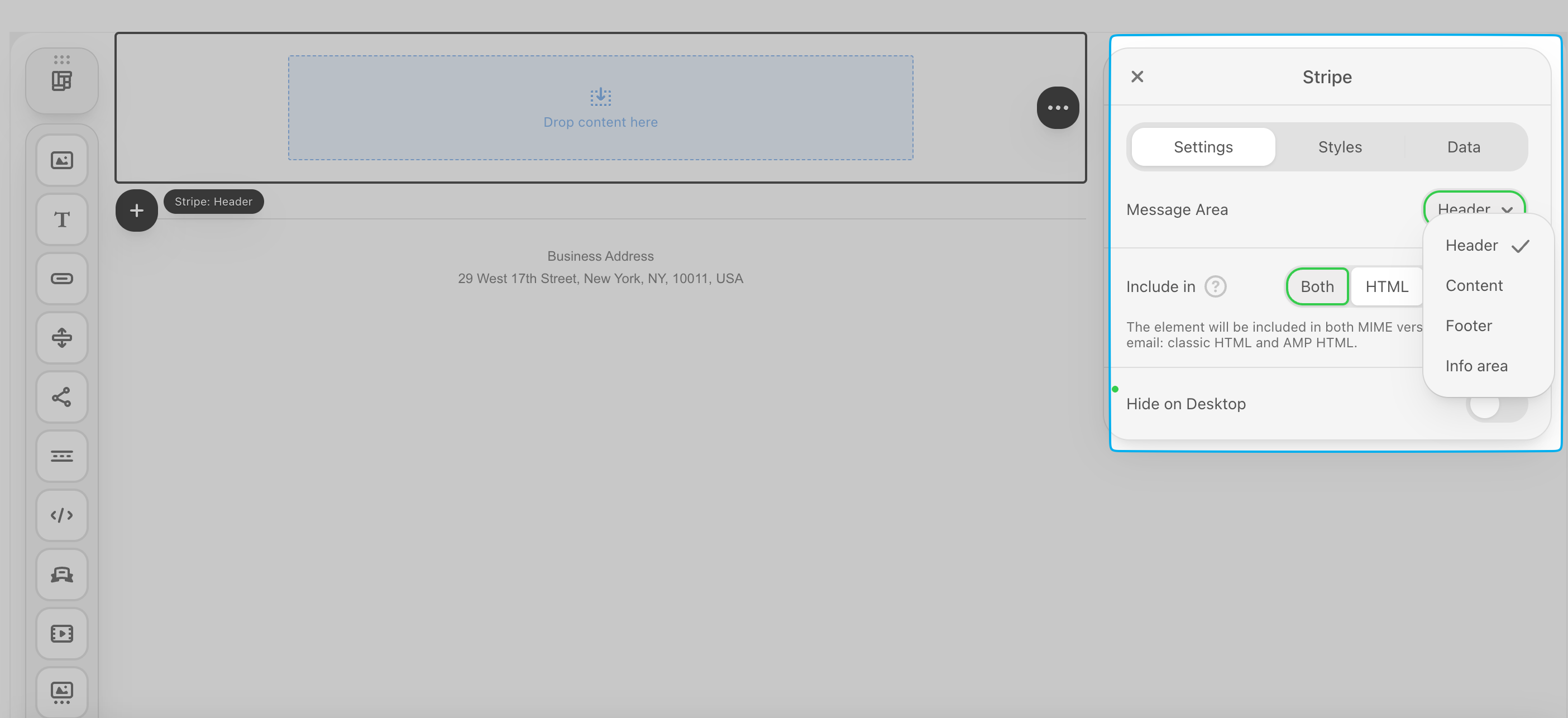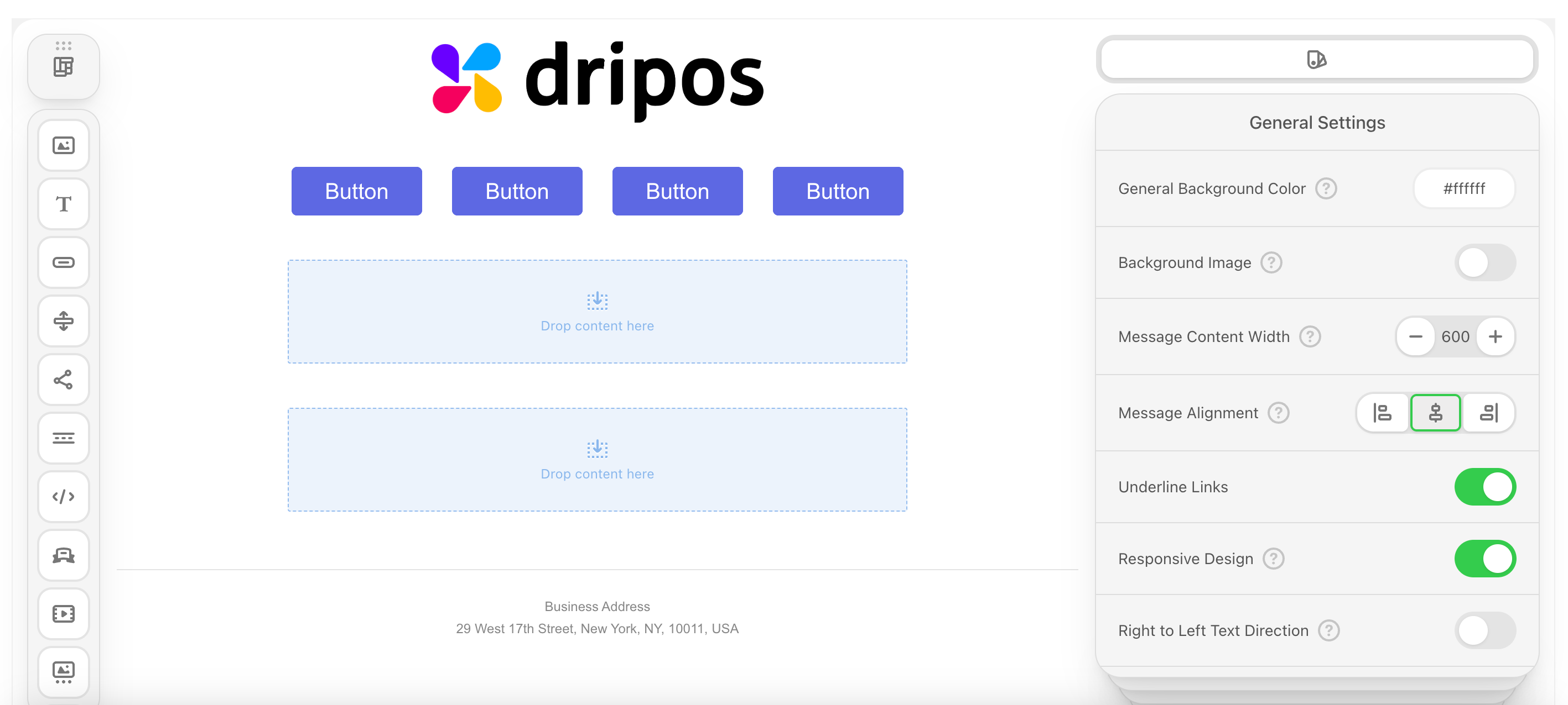 - Info: The info area is typically set at the bottom of the email. It may contain unsubscribe links, terms of use, privacy policy, etc.