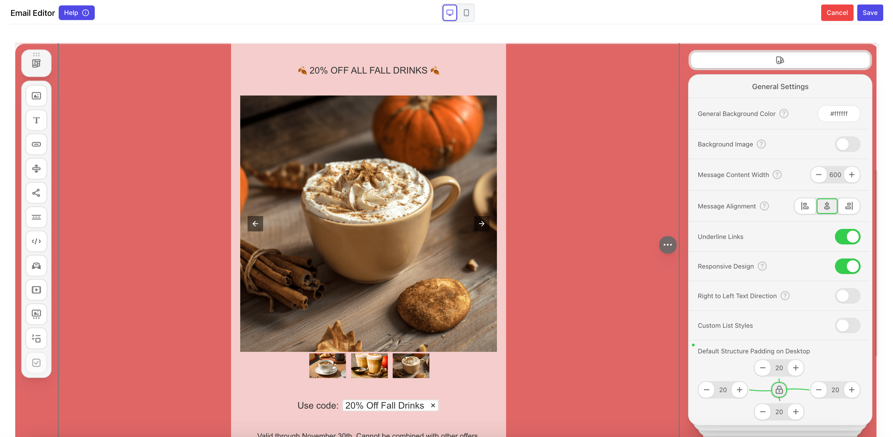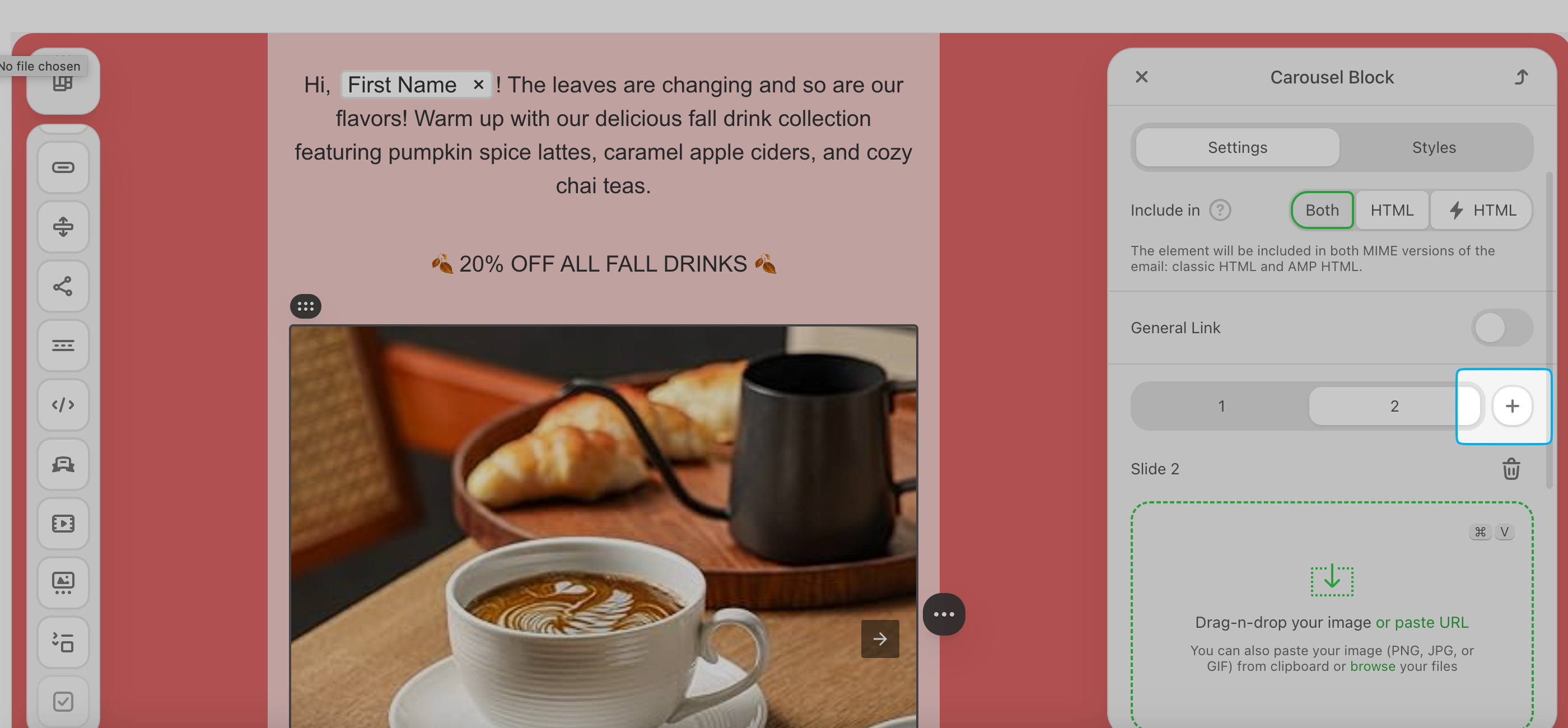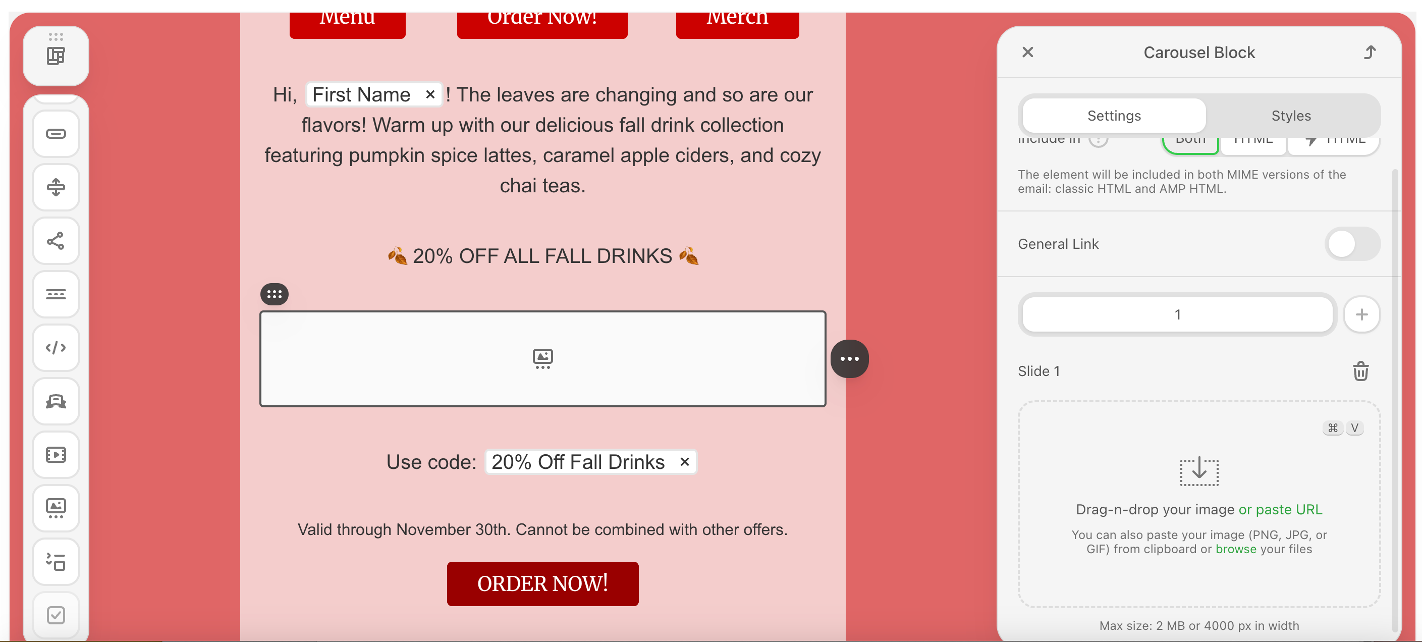 Add a rotating image carousel and add automated rotation effects.Add a structure to your email body and drag & drop the carousel icon into the structure.