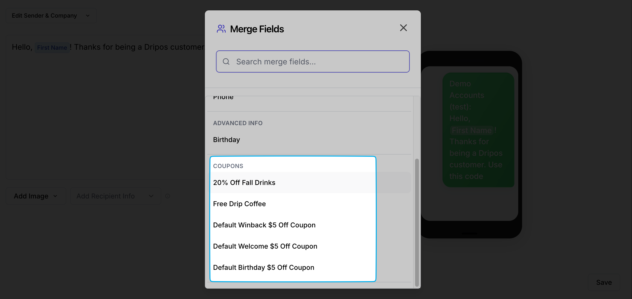 Send your customers coupon codes via SMS. Dripos offers two types of coupon codes: Generic Coupon Codes and Unique Coupon Codes.What’s the difference?Consider a few things before picking your coupon type:Click Add Recipient Info. All coupons you’ve created will appear under Coupons. Select one coupon placeholder to insert.A Generic Coupon Code placeholder will send the same code to every customer.A Unique Coupon Code placeholder will send a different, one-time-use code for every individual customer. Dripos will generate these individual codes so you don’t have to!