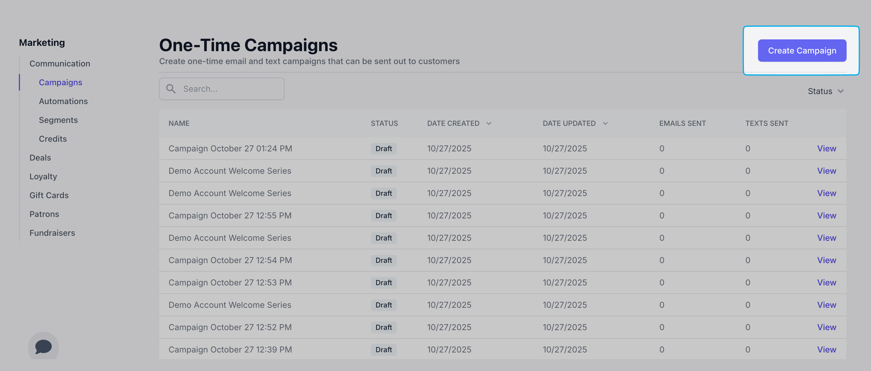 Campaigns can be created on any location Dashboard, as all locations share the same text marketing number and email.