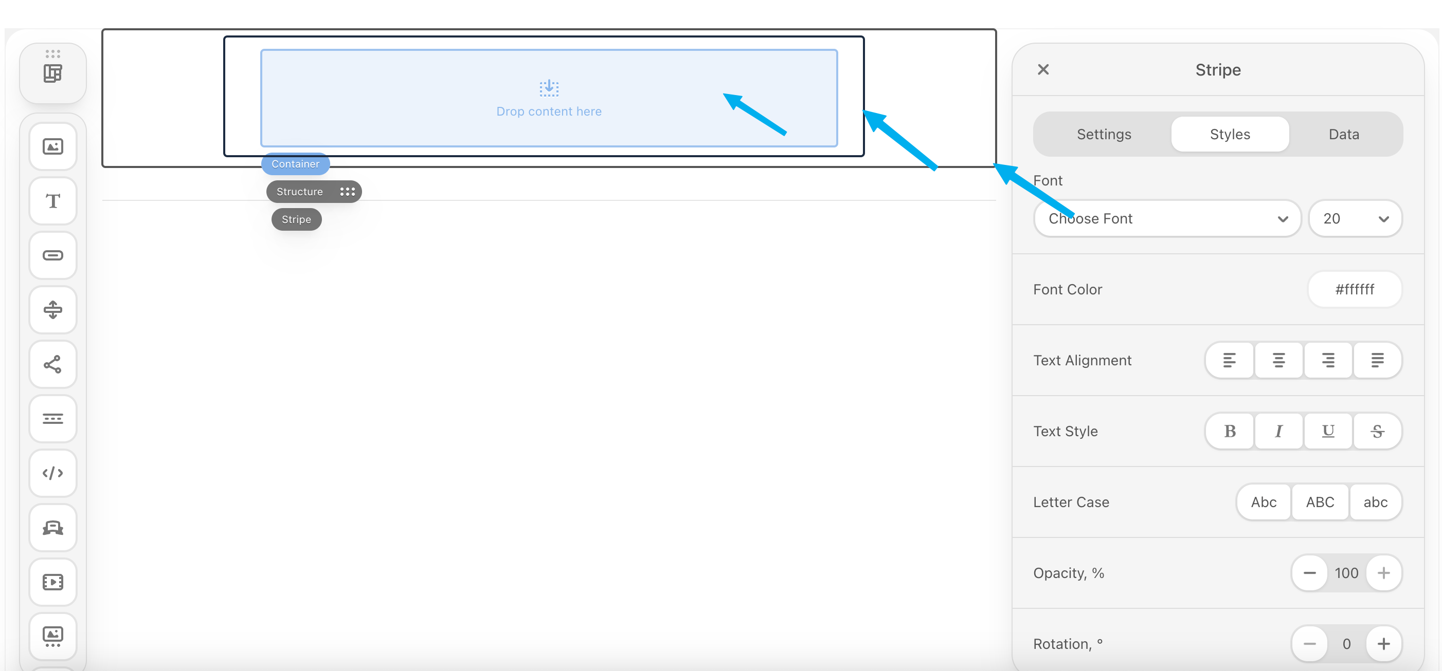 Stripes will contain one or more structures. A single structure can be divided into multiple containers (columns).Example: To display a product image next to a description, you use a two-container structure (Container A: 40% width for image | Container B: 60% width for text).Add a structure to a stripe by clicking the structure icon in the left hand corner