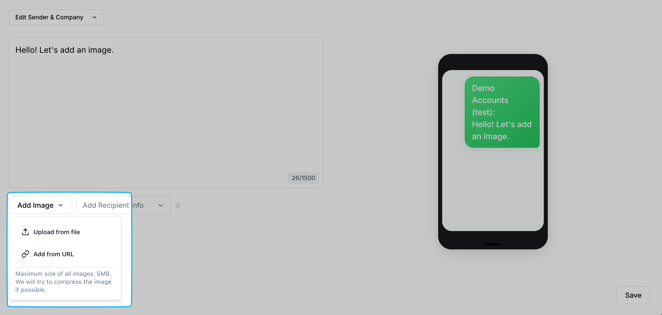 One image may be added to an SMS campaign.Click Add Image to upload a file or add from a URL.