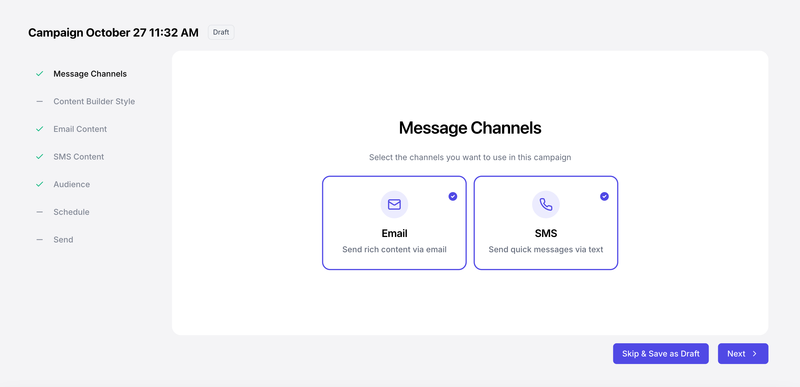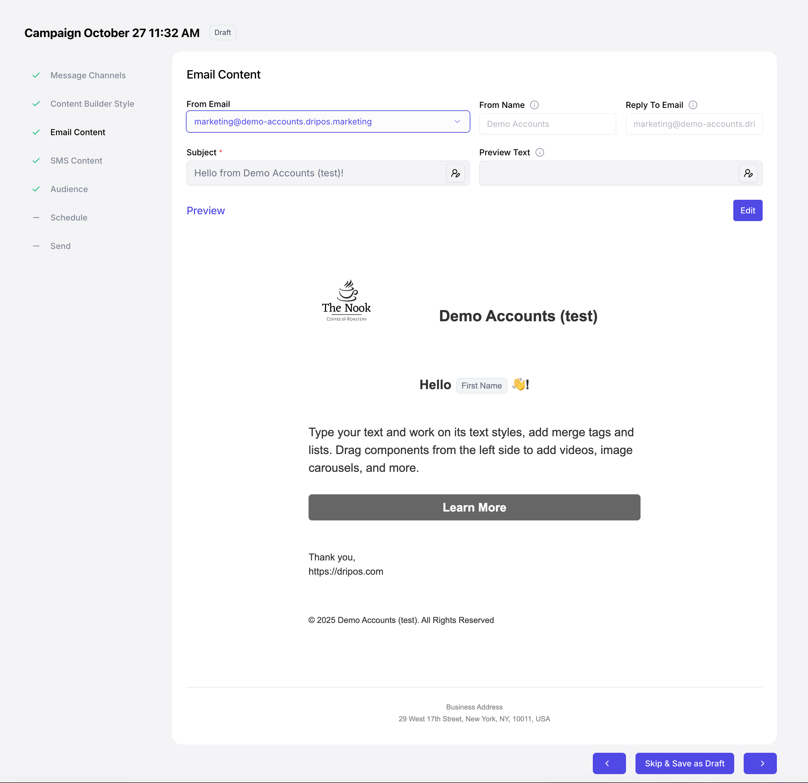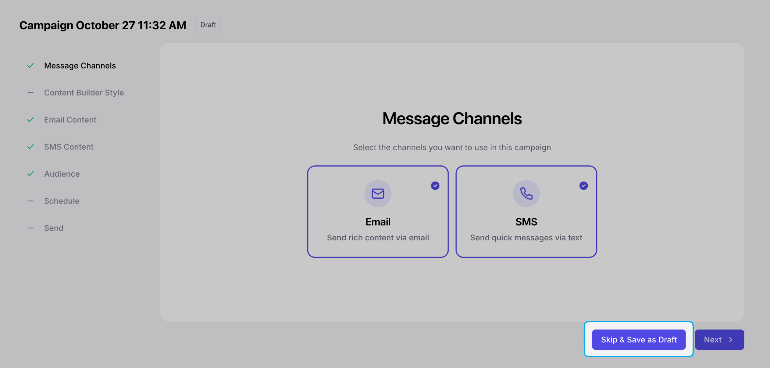 At any point in the campaign creation process, click Skip & Save as Draft to view the campaign draft in a full-page view.