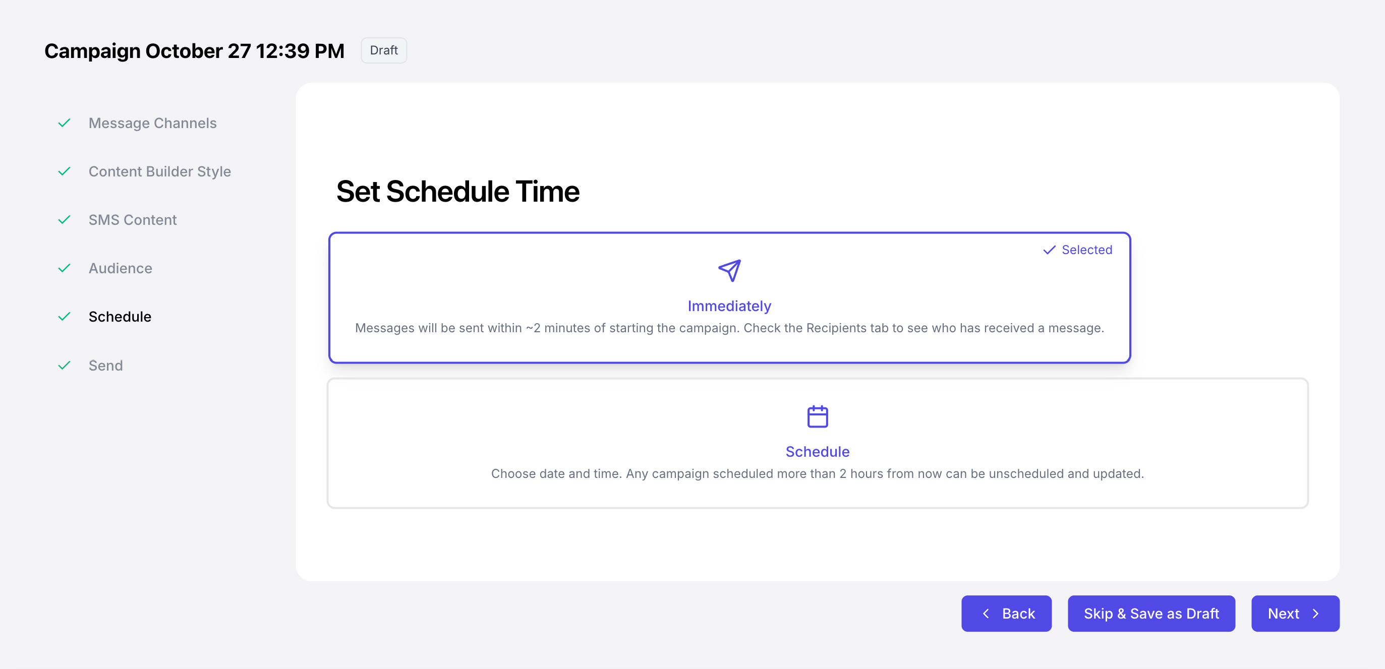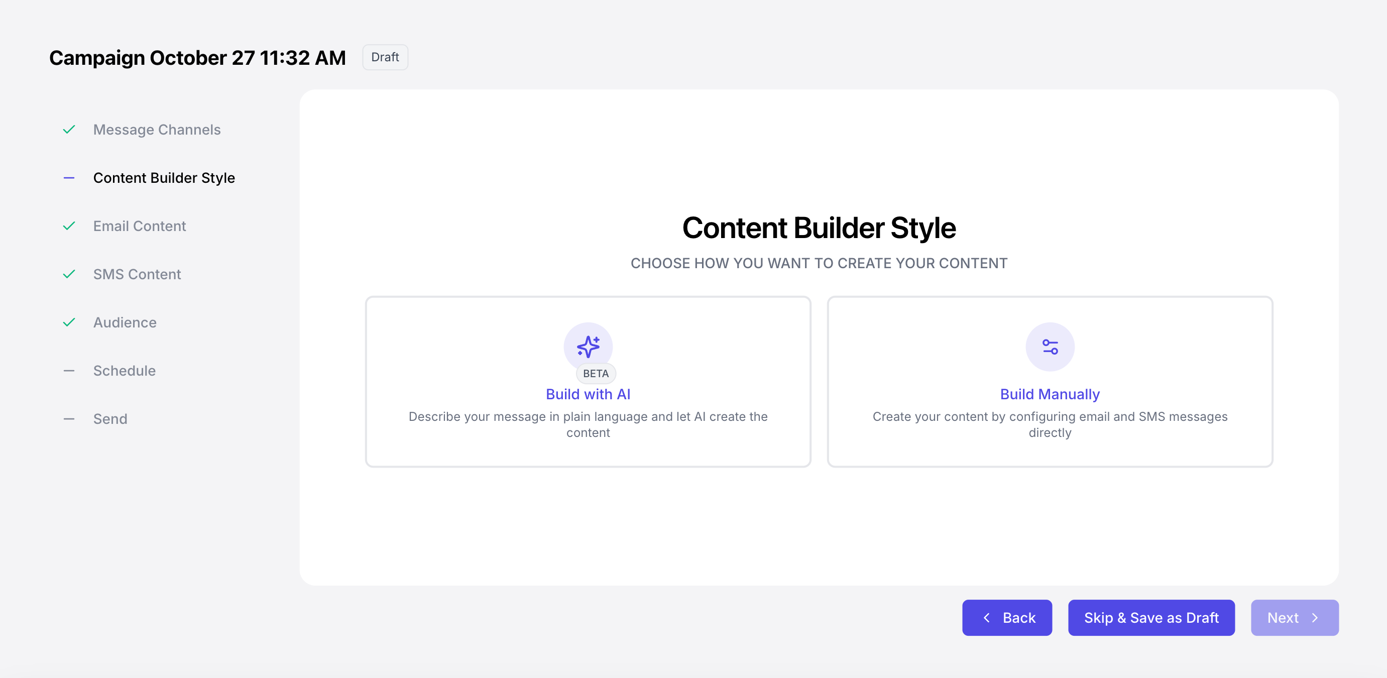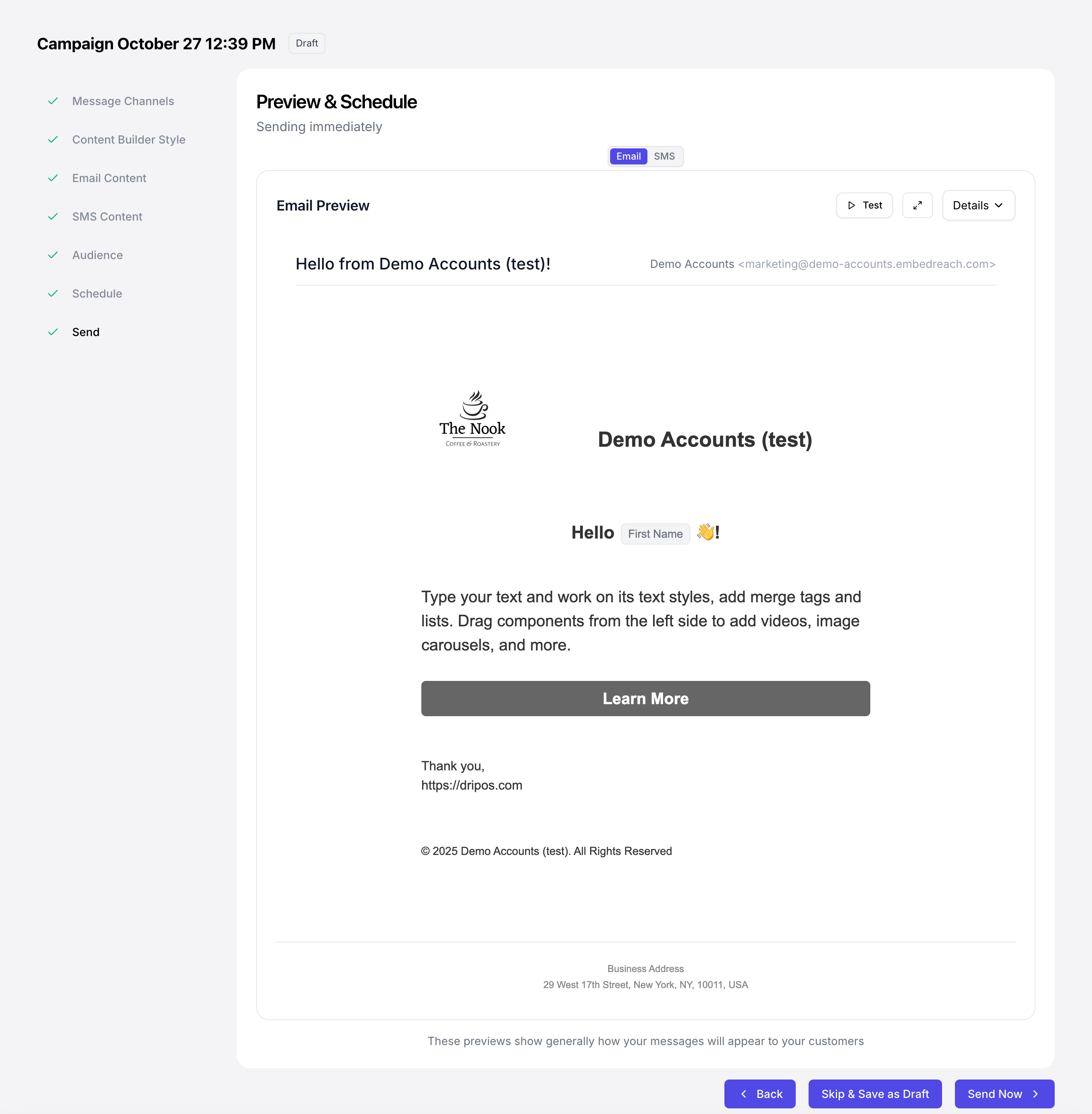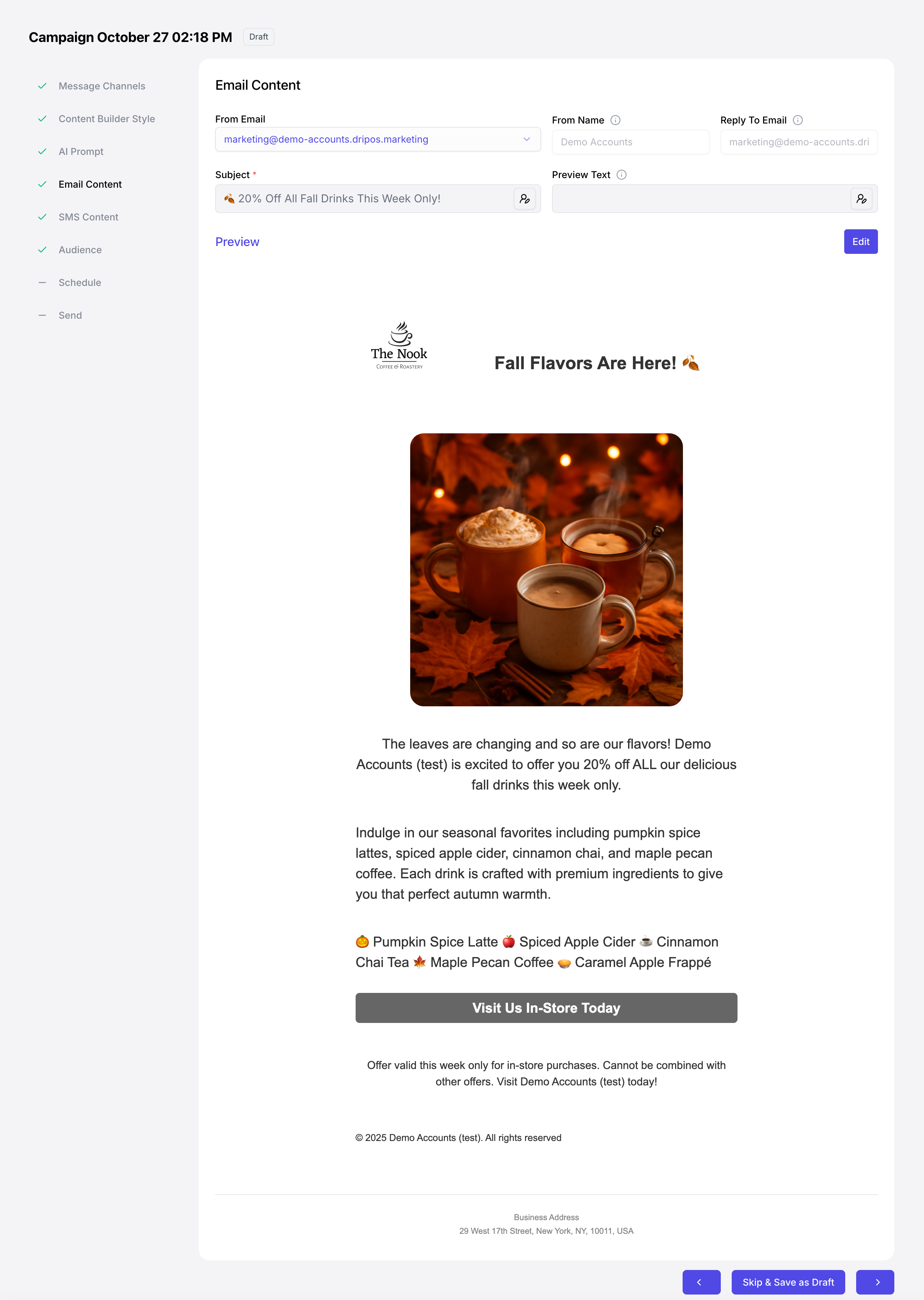 At any point in the campaign creation process, click Skip & Save as Draft to view the campaign draft in a full-page view.