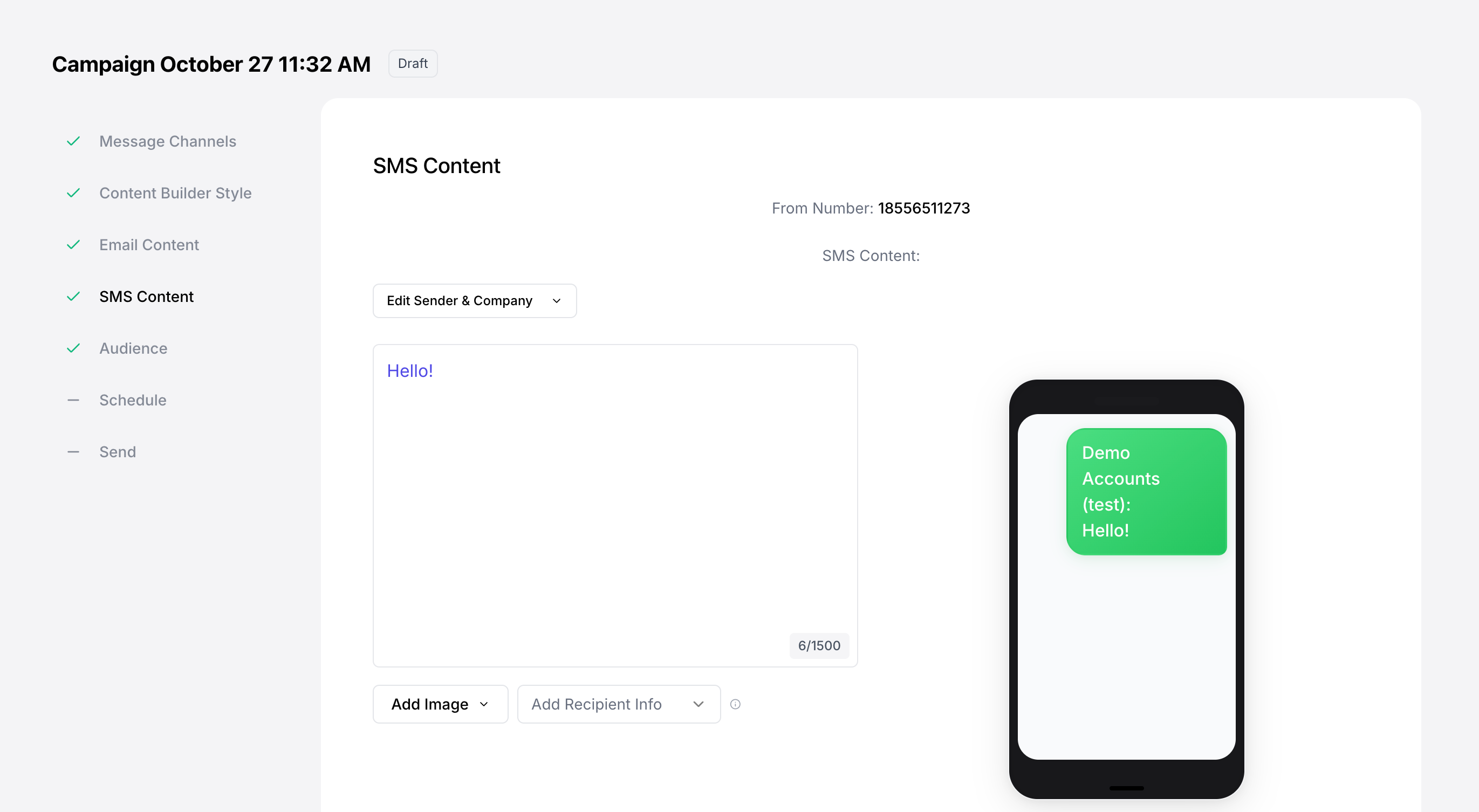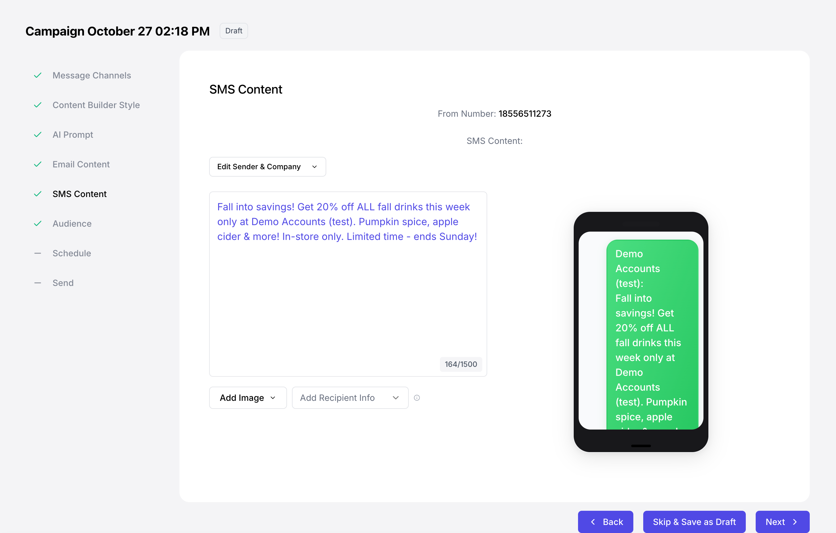 Create your SMS content directly on the Campaign Builder or save the campaign as a draft and edit later!