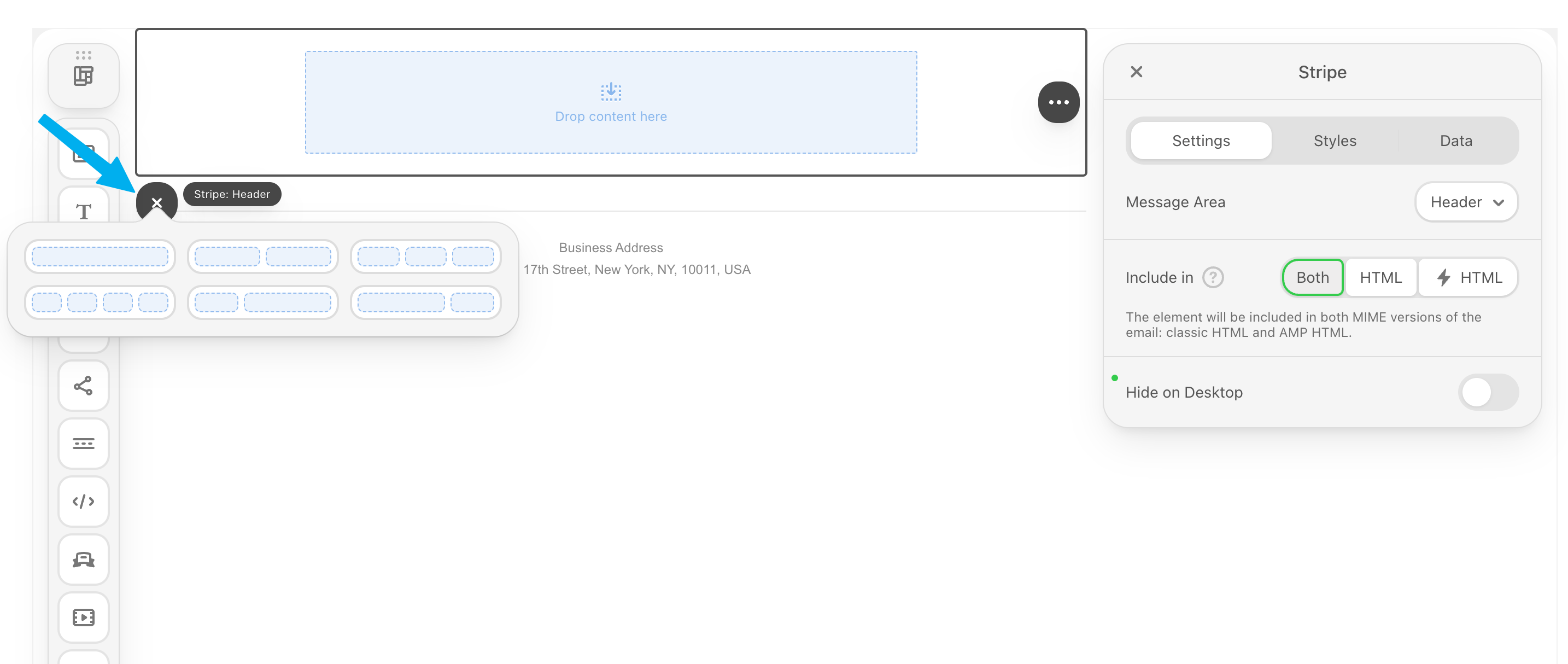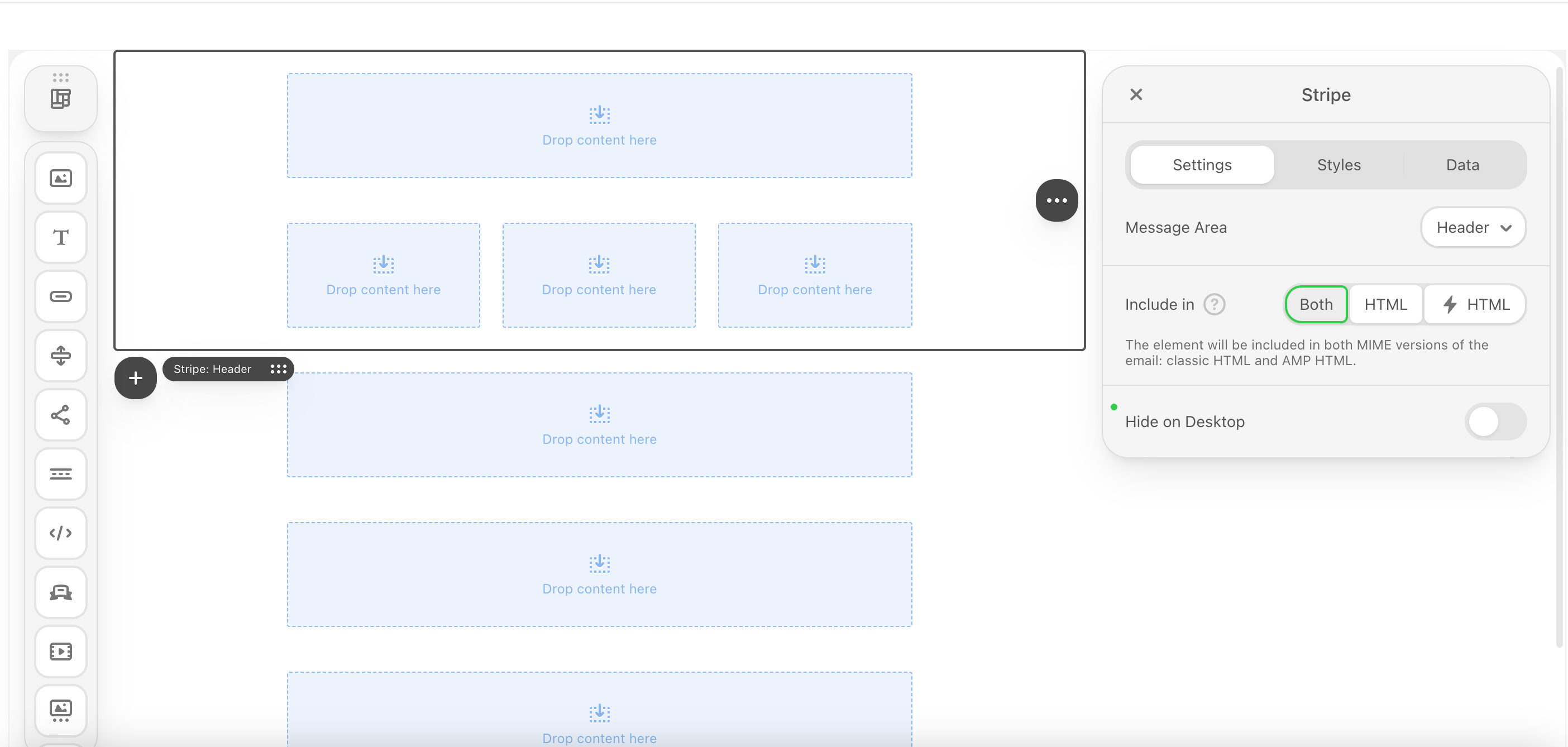An email body is made up of stripe blocks, structures, and containers.A stripe (the wrapper/section) is the largest, outermost element. It controls the background color or image for that entire section of the email, including the areas outside the main content columns.The structures are the elements inside the stripe. It defines the column layout for the content. Its primary purpose is to hold the main content and specify how many columns there will be (e.g., one large column, two equal columns, a sidebar, etc.).A stripe can contain multiple structures (rows). This is the element that typically handles responsive stacking on mobile. For example, a two-column structure on a desktop will collapse into two stacked single-column structures on a phone.The containers (content blocks) are the smallest, most functional elements placed inside the structures. This is where the actual user-facing content lives. This includes: