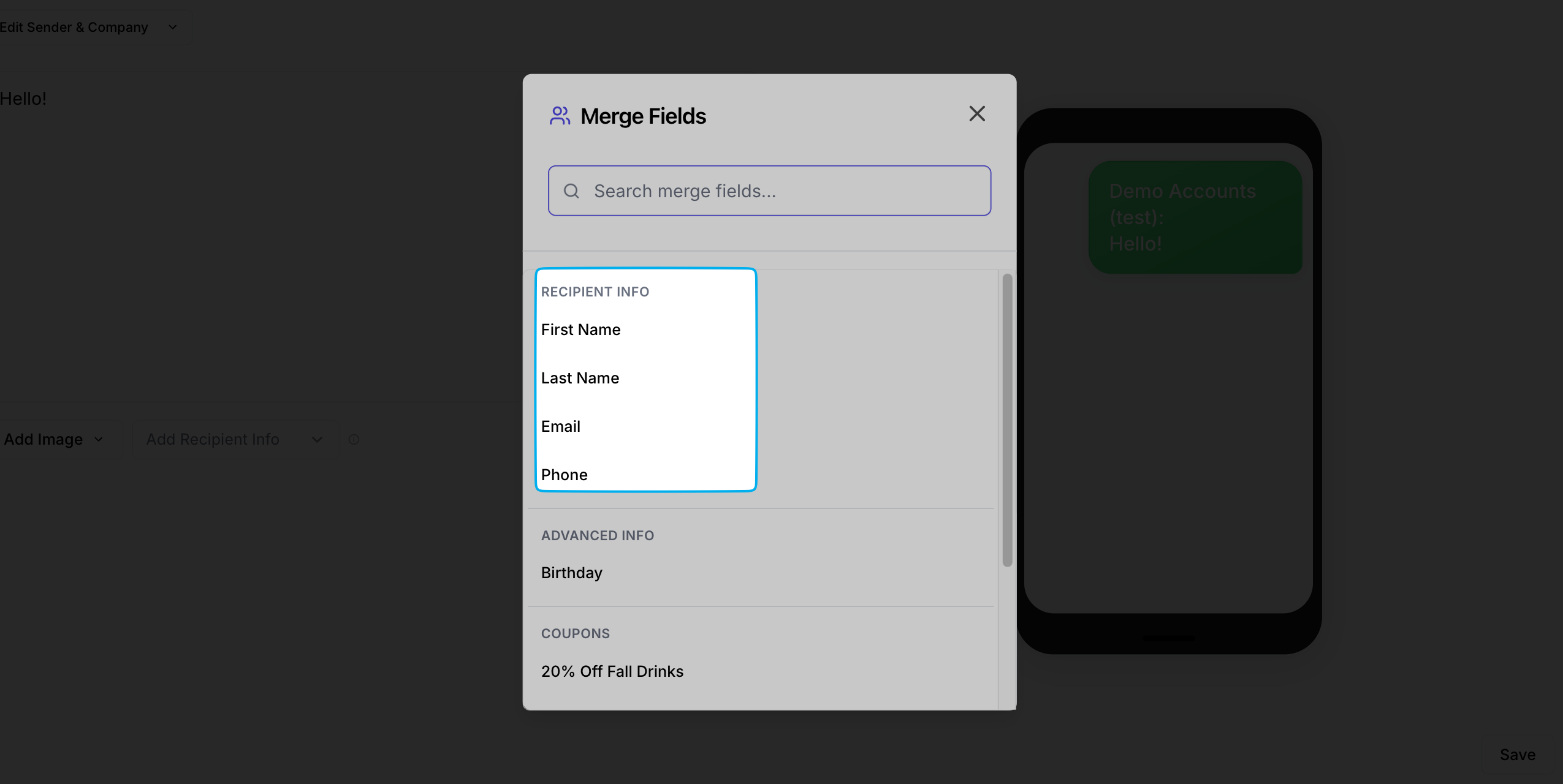 Sending a generic text can feel… generic. Instead, you can use placeholders (like [First Name]) to automatically insert each patron’s name into your message. This makes the text feel like a one-on-one conversation, not a mass blast.Click Add Recipient Info and select a placeholder of either First Name, Last Name, Email or Phone for each patron who receives this campaign.