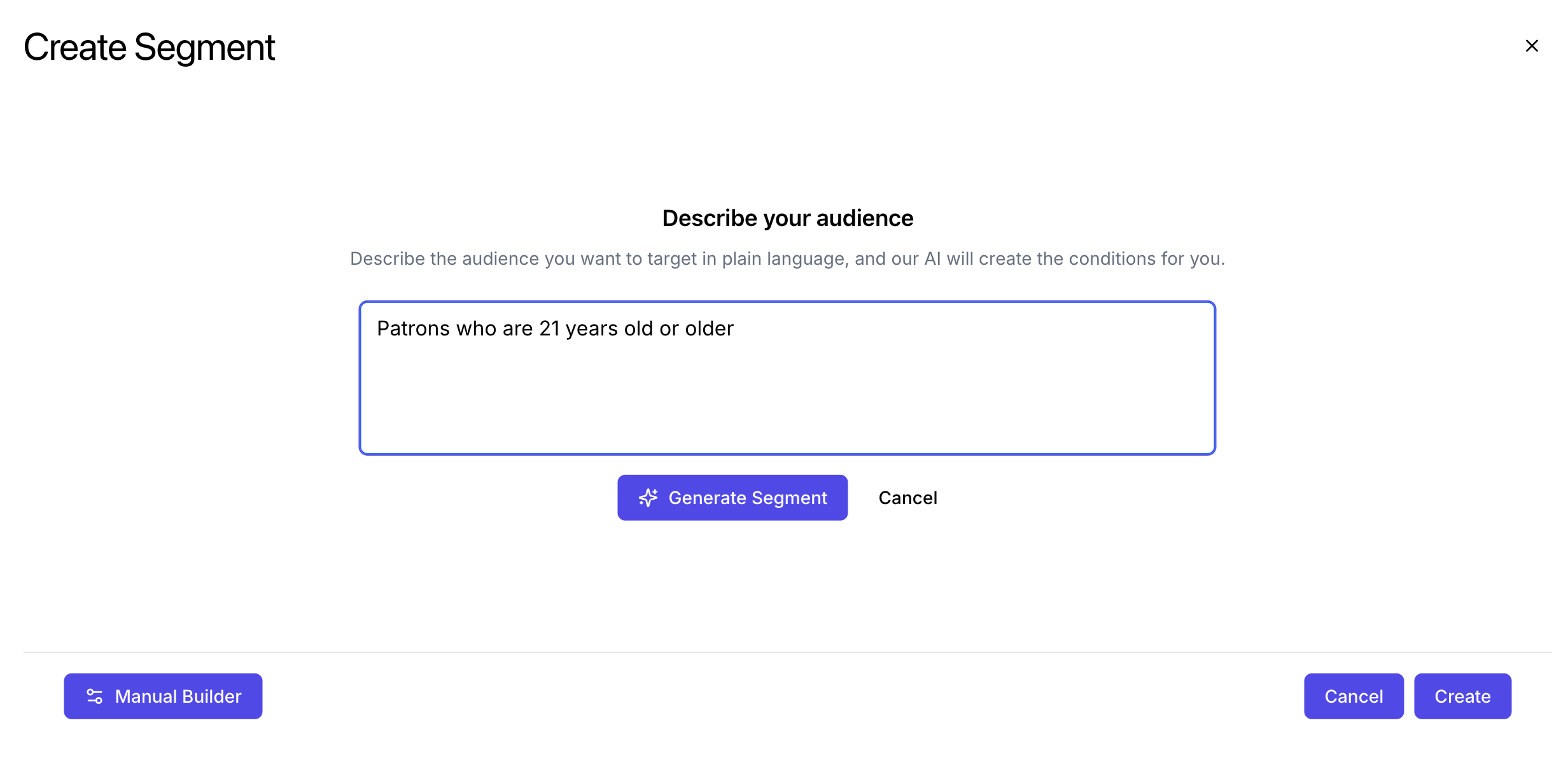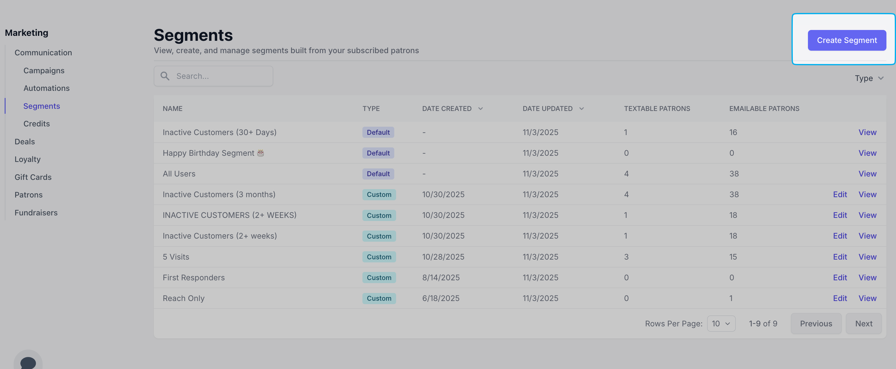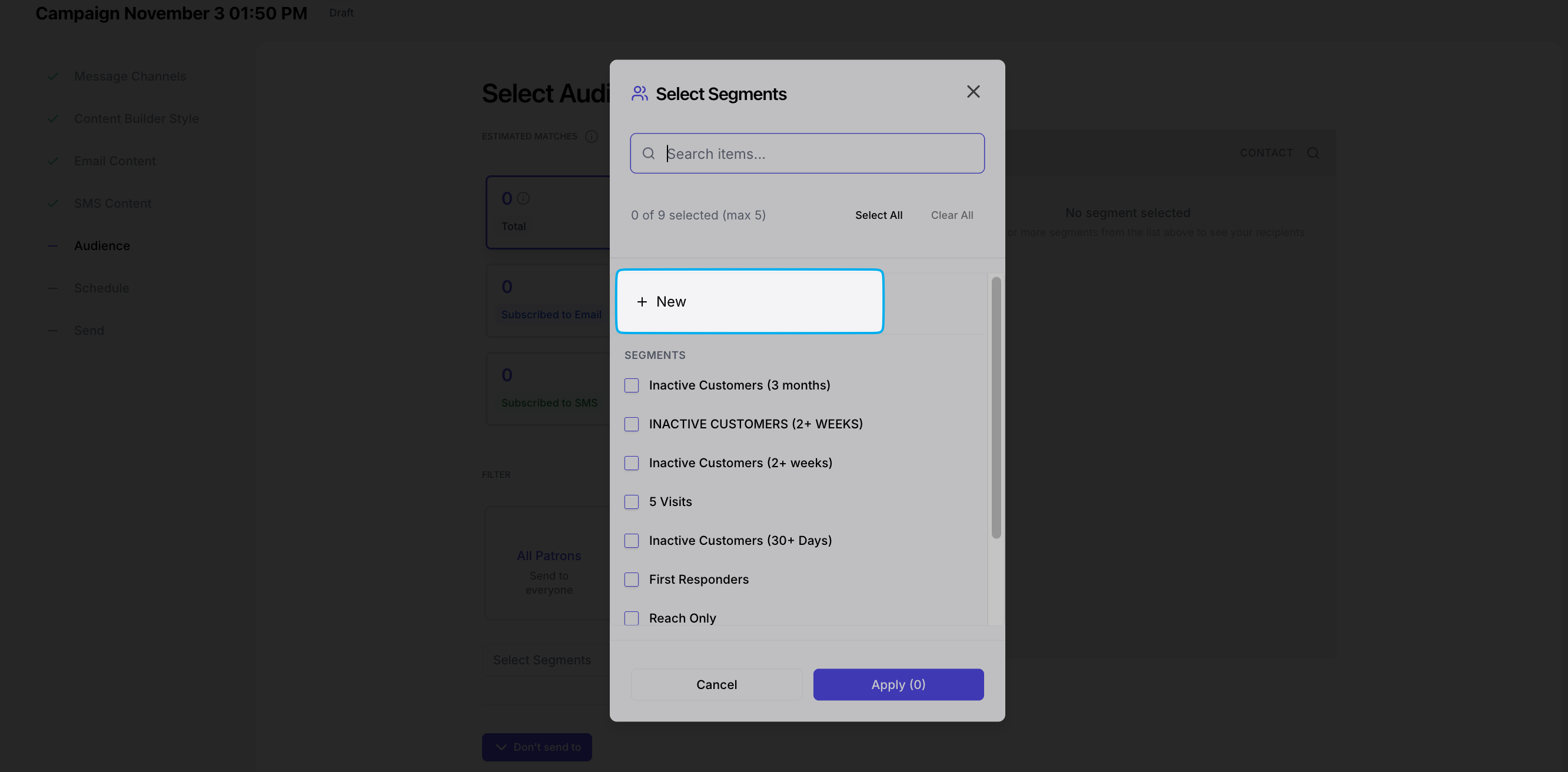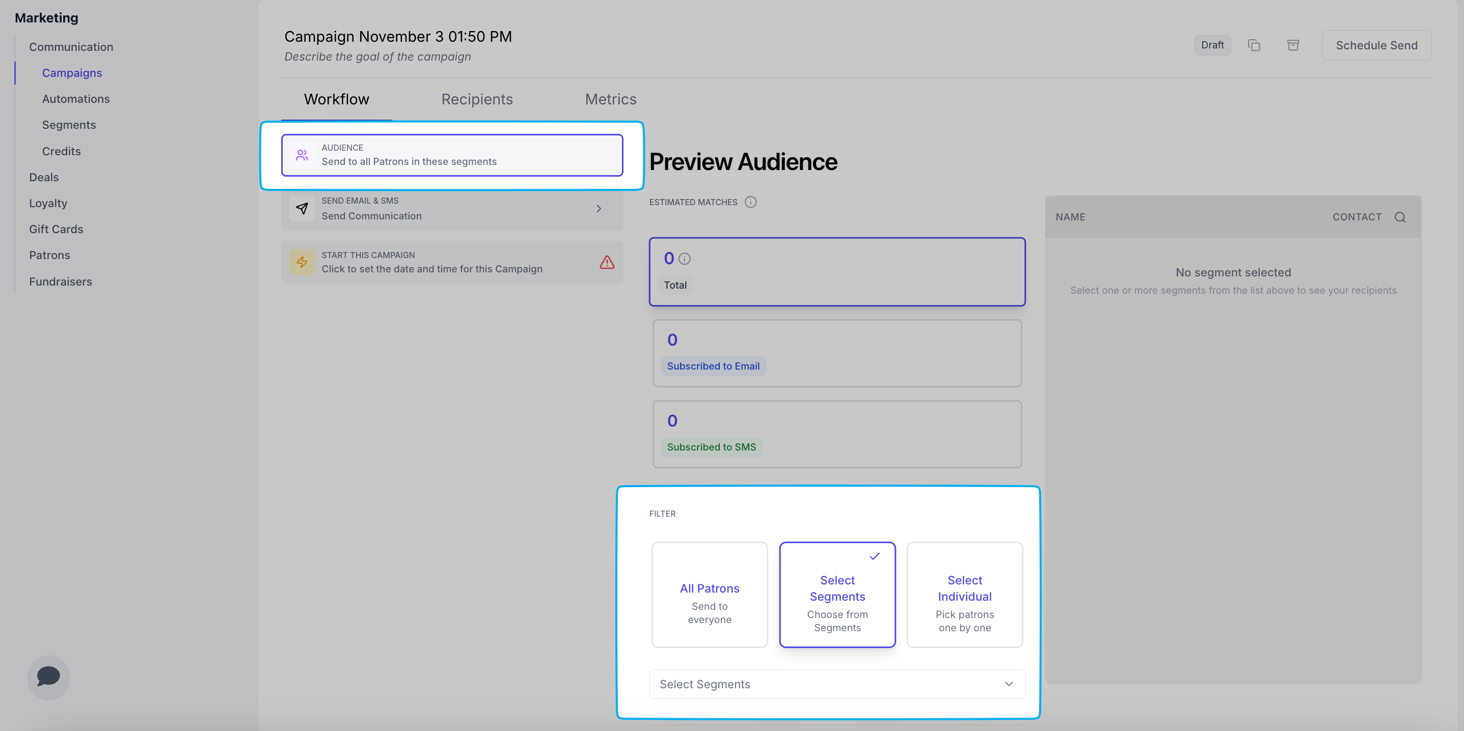 Audience segments can be built before or during the creation of an SMS or email campaign.Navigate to the Dashboard > Marketing > Communications > Segments > Create to build prior to campaign creation