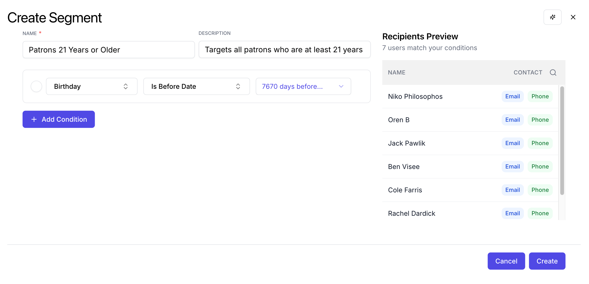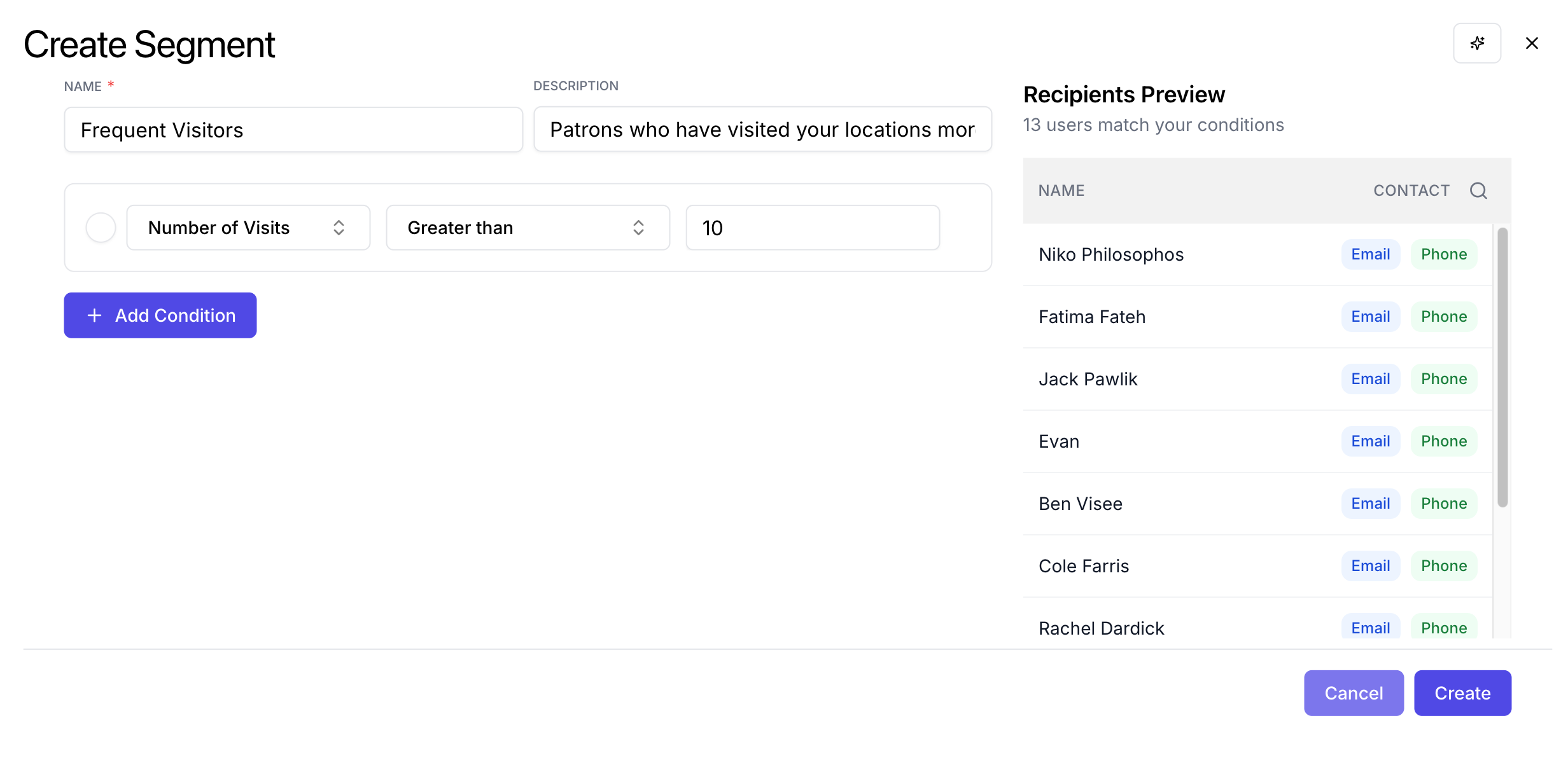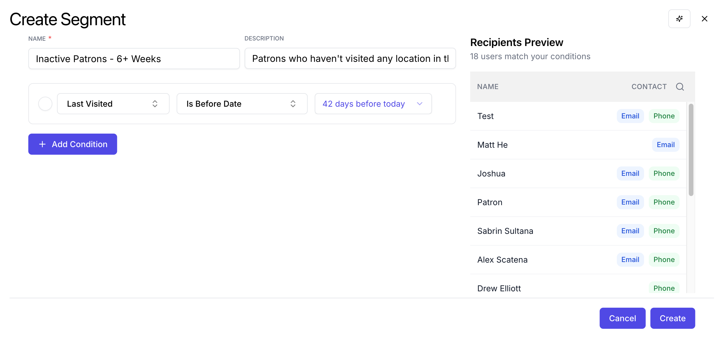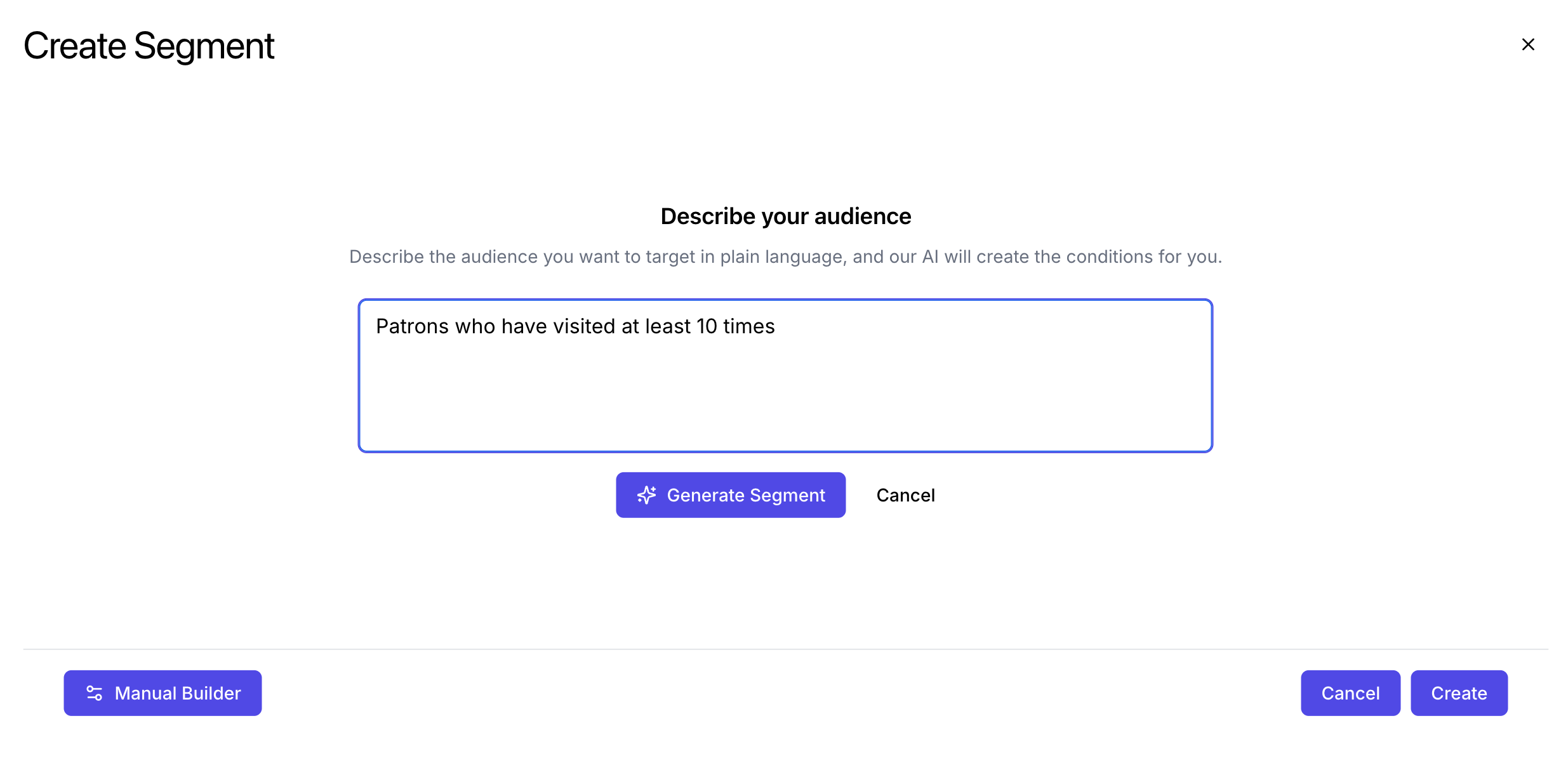 Audience segments can be built before or during the creation of an SMS or email campaign.Navigate to the Dashboard > Marketing > Communications > Segments > Create to build prior to campaign creation