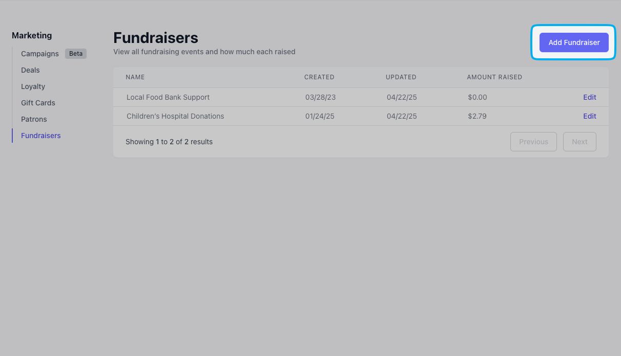 Create fundraisers from the Dashboard to be utilized on the Point of Sale.Create a Fundraiser