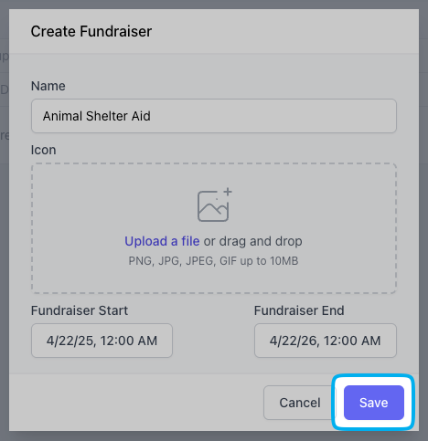 Input the fundraiser’s Name, Start Date and End Date. Optionally attach an image to display on the fundraiser pop up. Click Save.