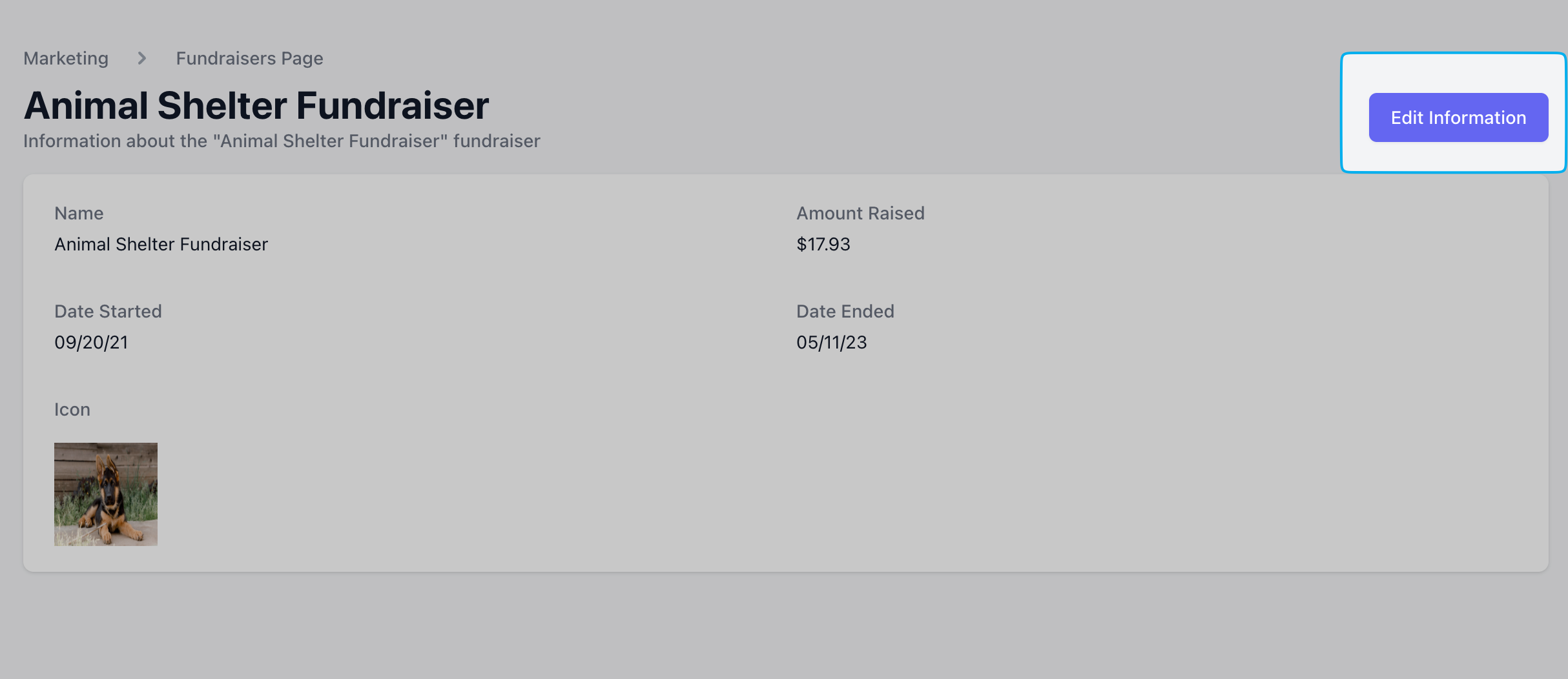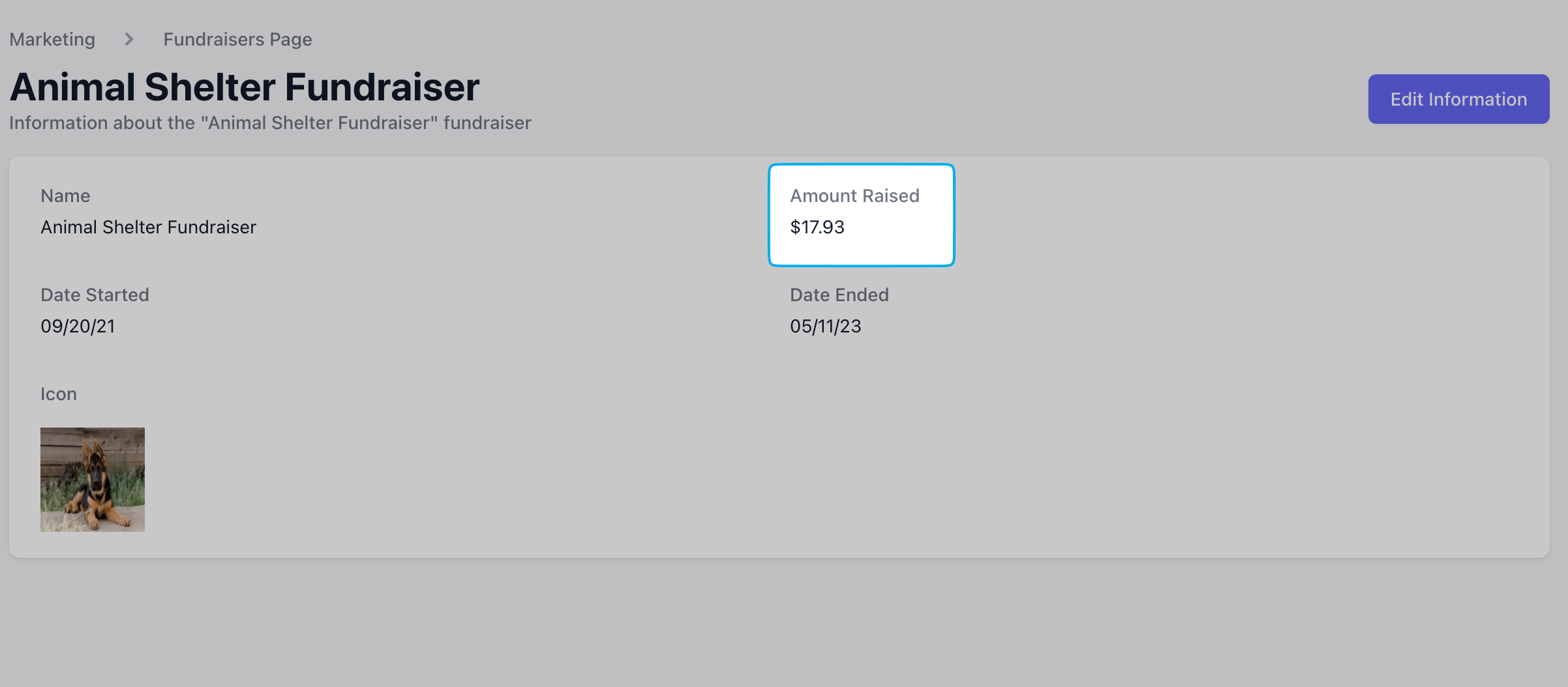 Donations collected from fundraisers are paid out through your daily Stripe payouts. To view a fundraiser’s progress, on the Dashboard navigate to Marketing > Fundraisers and click into a specific fundraiser. The Amount Raised from a Fundraiser is displayed on its page.