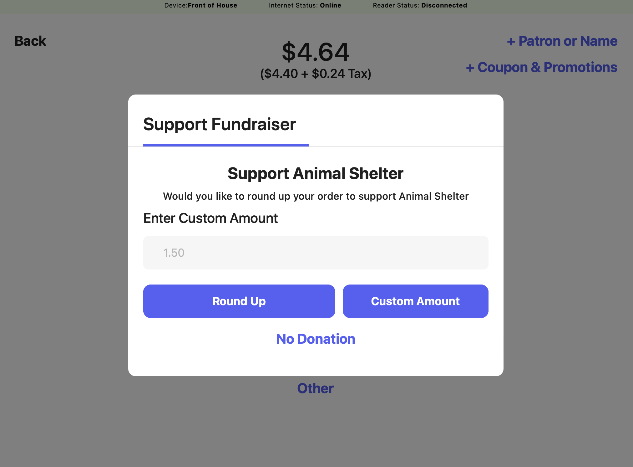 When a checkout occurs during an active fundraiser date range, the fundraiser prompt will automatically appear as part of the checkout process on the Point of Sale. Customers will see the fundraiser pop-up just before selecting their payment method.The fundraiser pop-up displays on the Point of Sale screen only at this time. Employees should ask customers which donation option they would like to select.