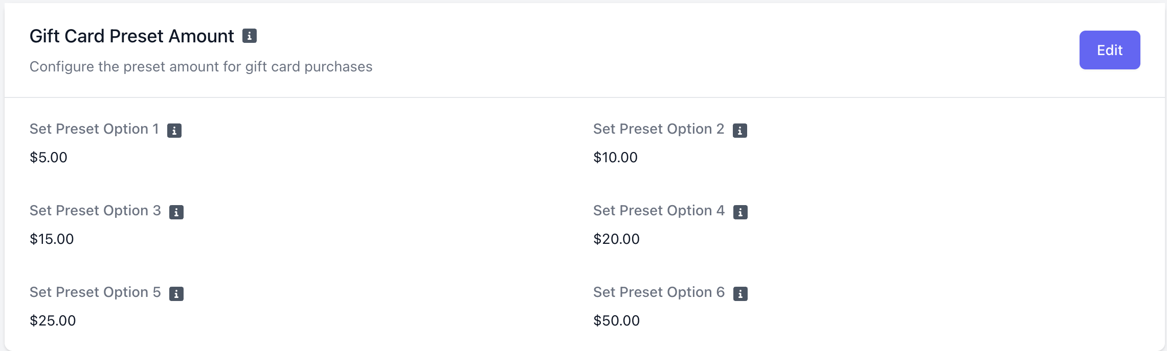Choose default gift card amounts to be presented in the gift card purchasing menu on the POS. The cashier will be able to input a custom amount as well.