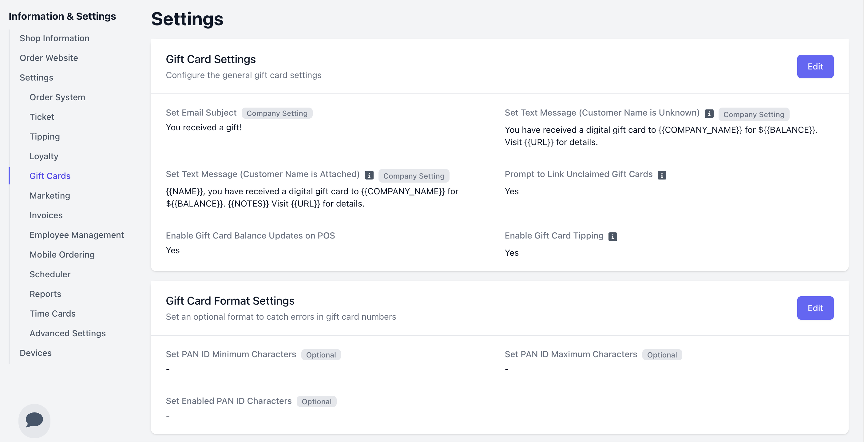 Gift Card Settings