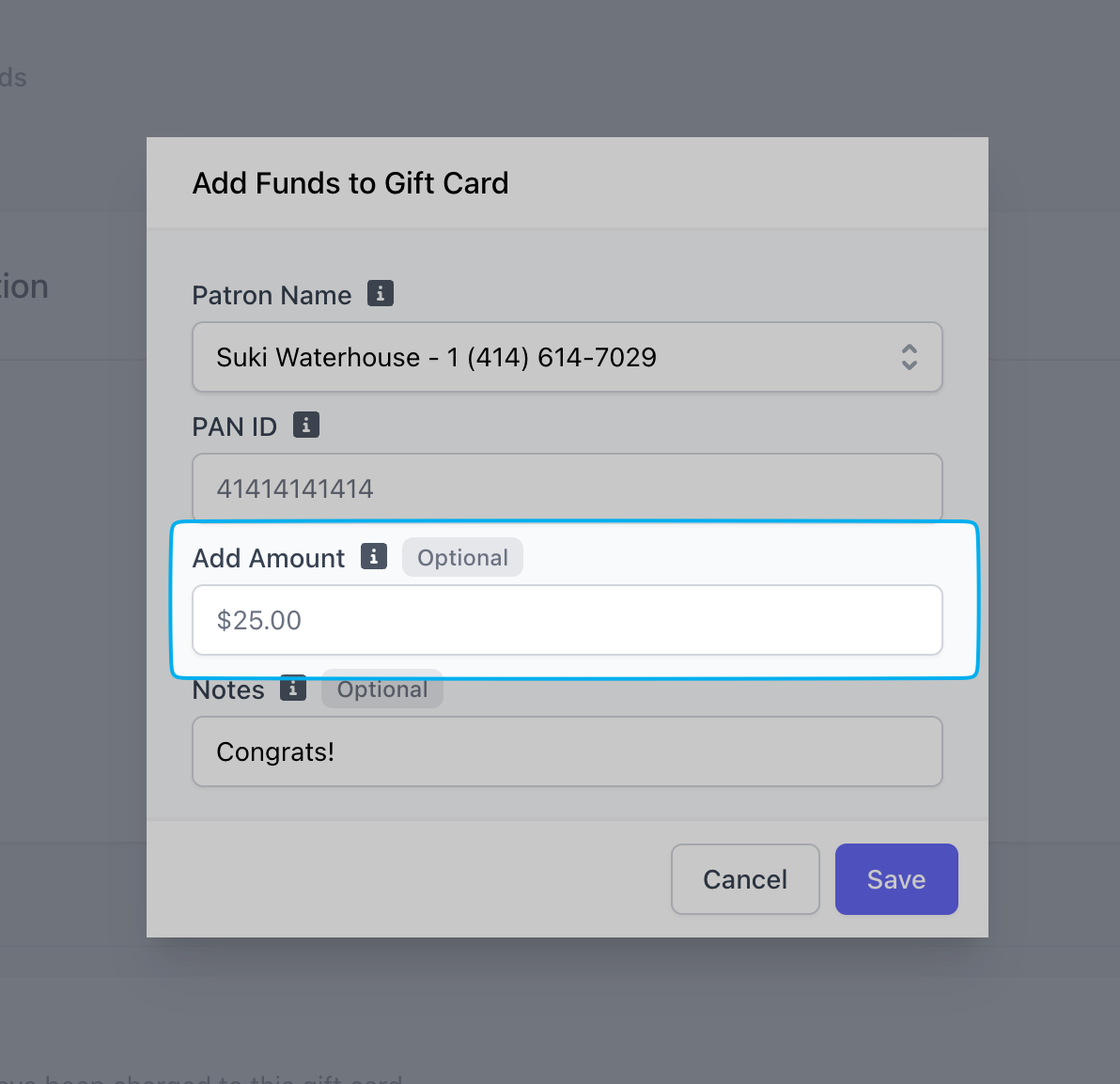 Digital gift cards can be redeemed upon checkout by clicking Gift Card on the payment method screen and using one of these methods: Search for a gift card by the PAN ID number. If a patron is checked in, their linked gift cards will appear at the top of the list.