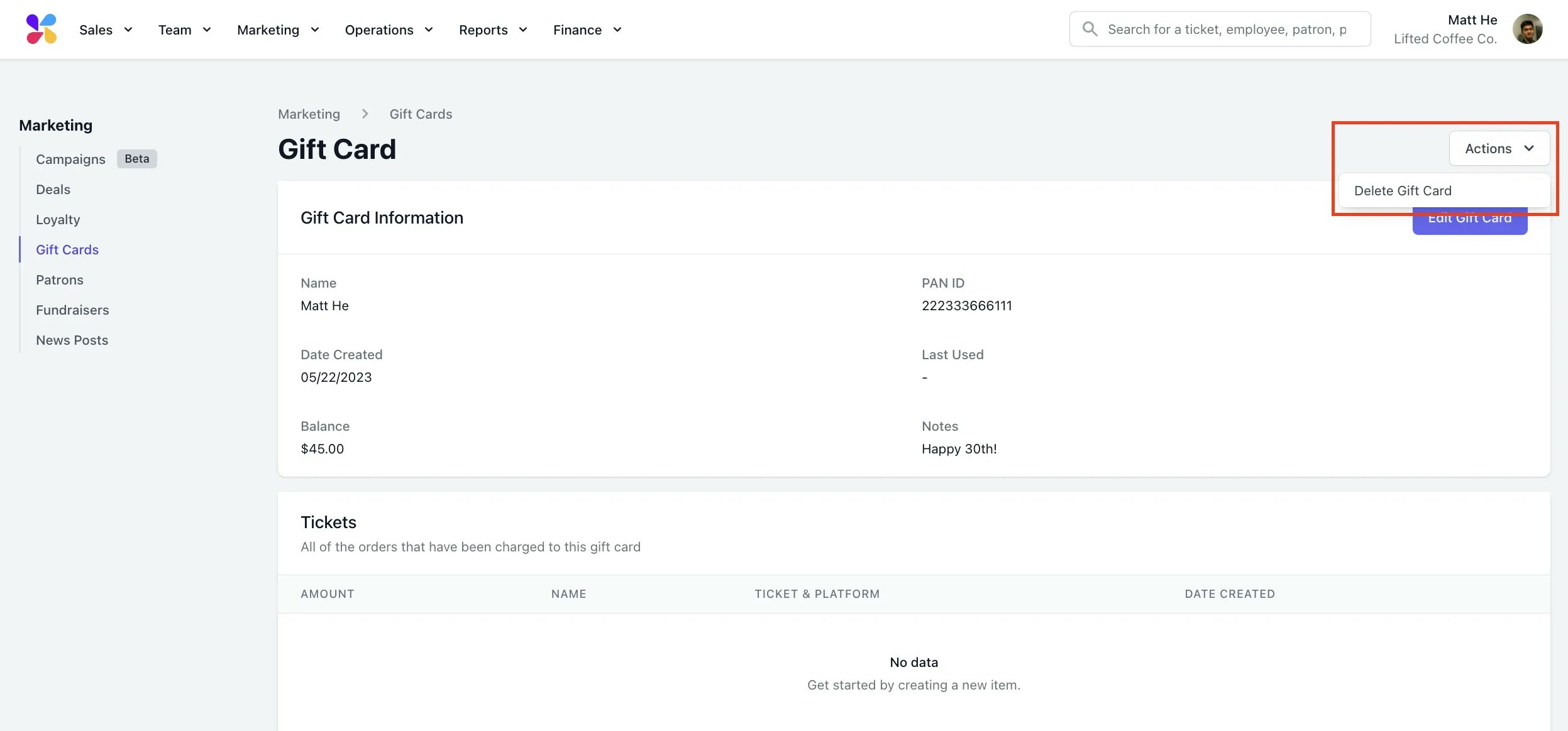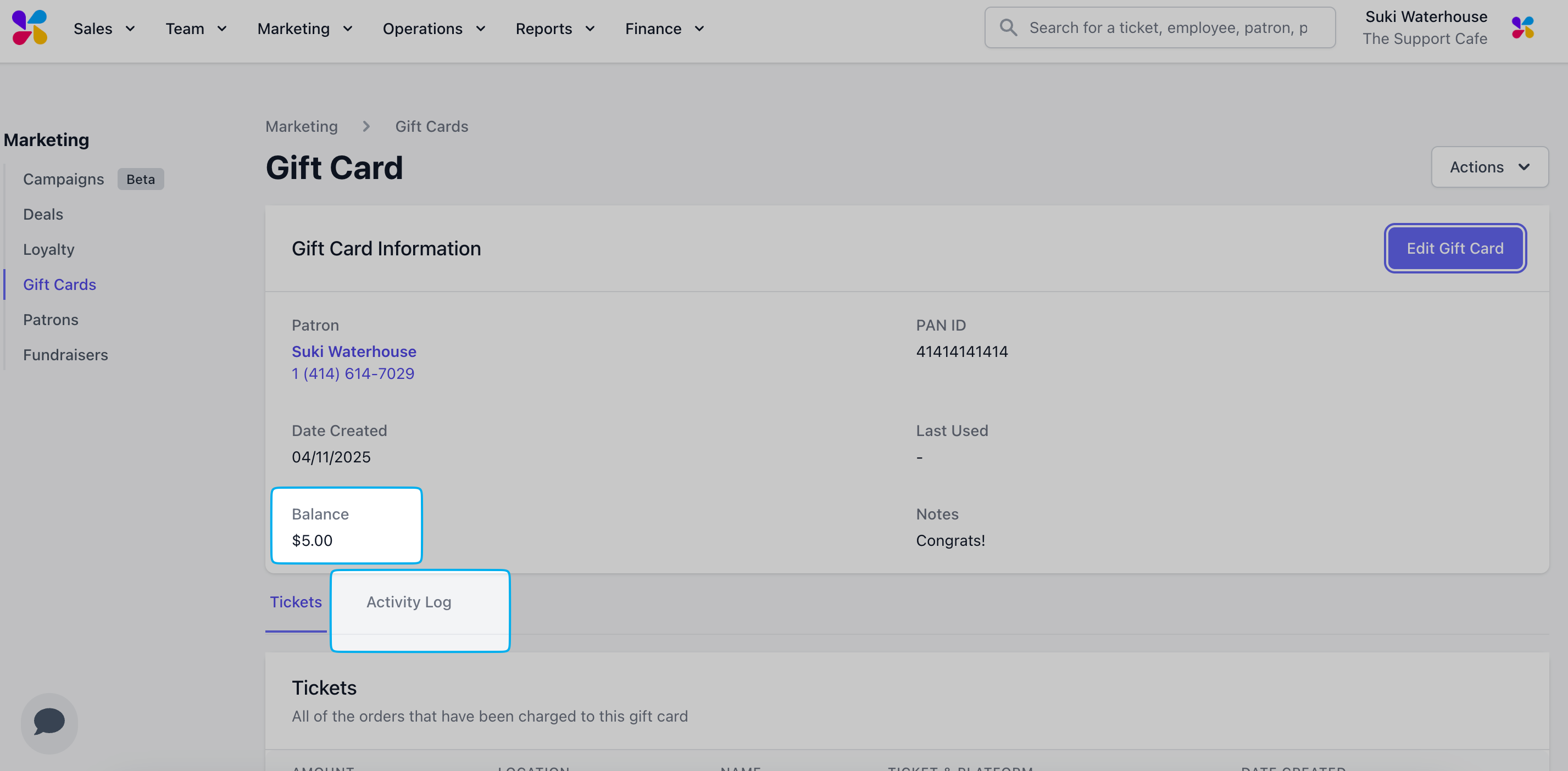 Adjust Gift Card Balance on the Web Dashboard
