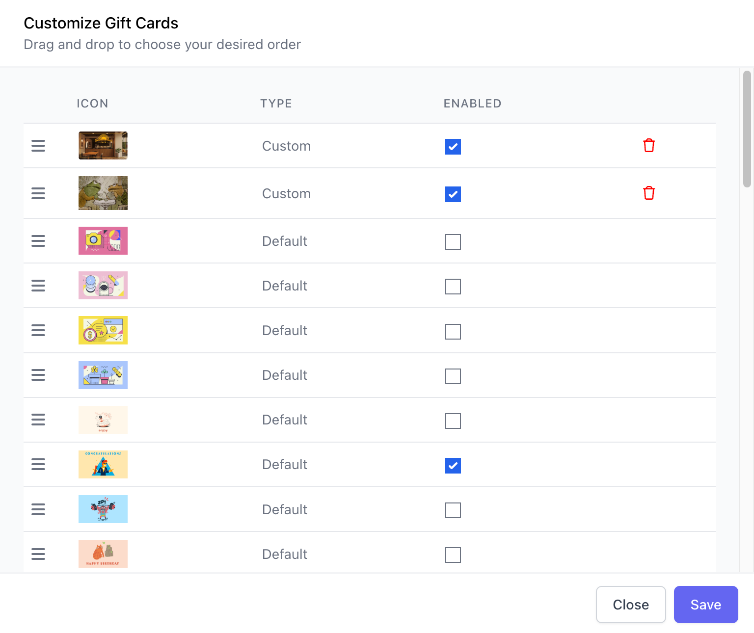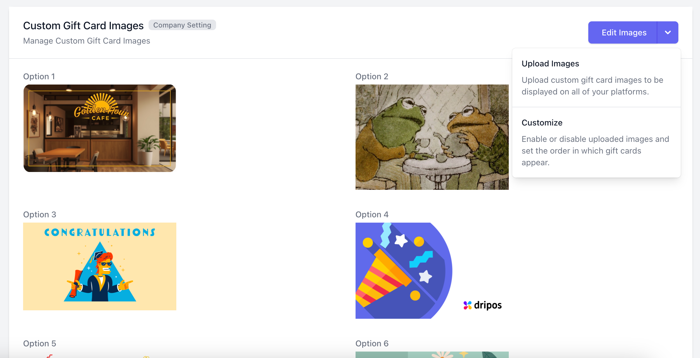 Customize Gift Cards: Reorder the display of gift cards and enable/disable specific gift cards. Click Edit Images > Customize.