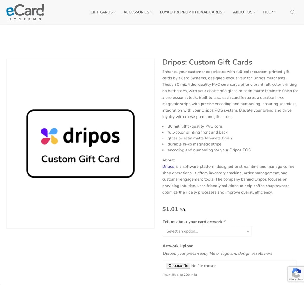 Dripos partners with eCard Systems to provide a full-service physical gift card solution compatible with our system. Obtain a quote and order gift cards here.