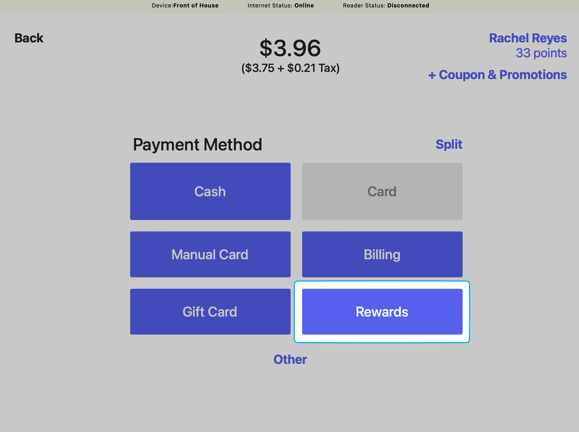 When a customer earns enough points for a reward, available rewards will automatically appear at checkout.- S700 Card Reader