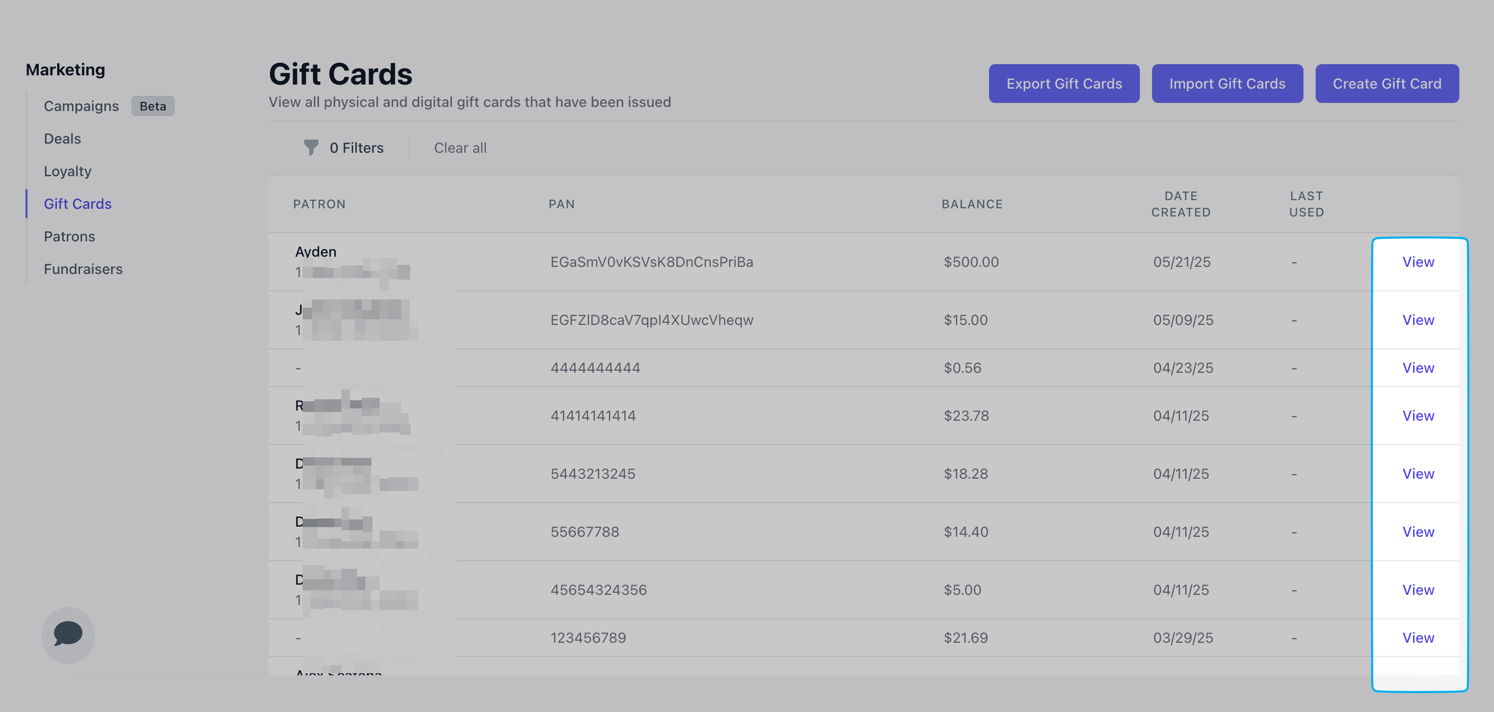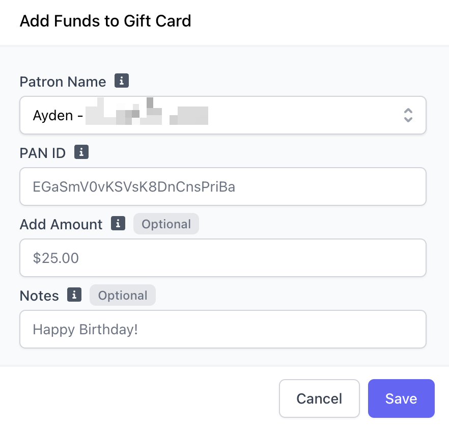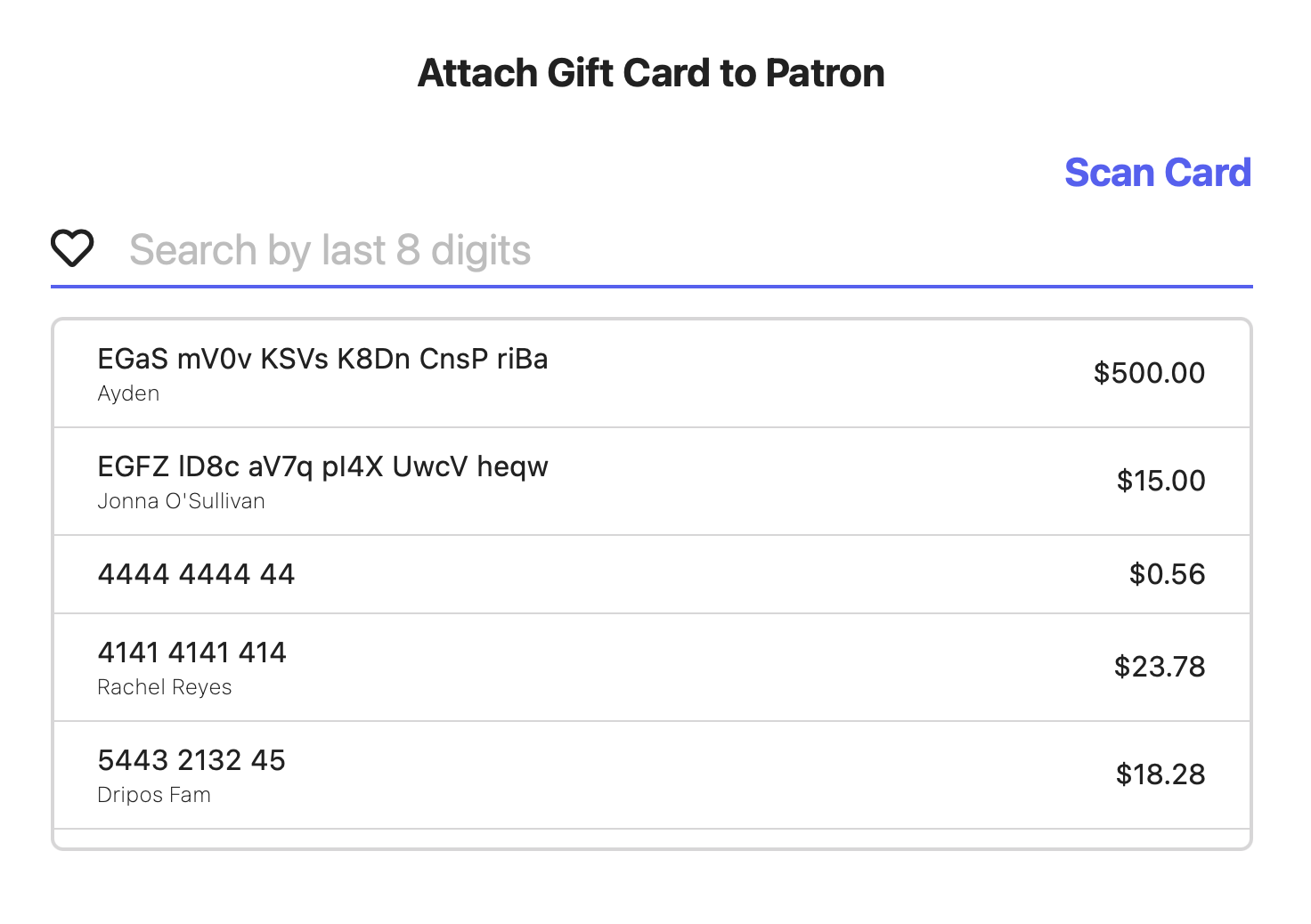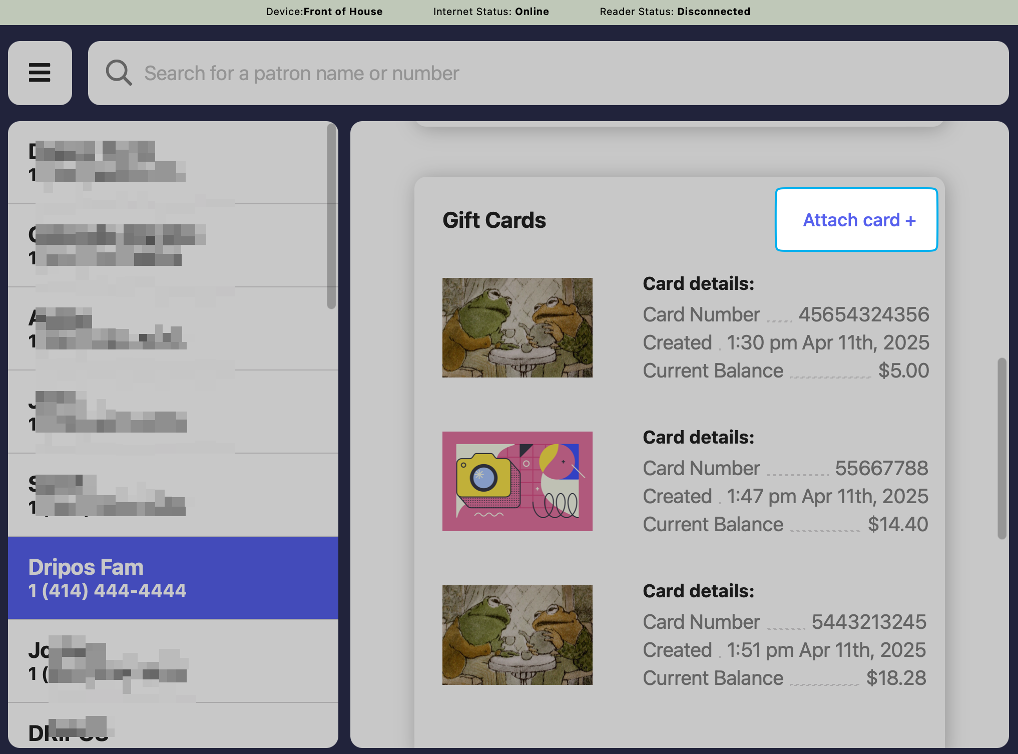 Link physical and digital gift cards to patron accounts. When a patron is attached to an order, their gift cards are automatically available as a payment option—no searching required.- Point of Sale