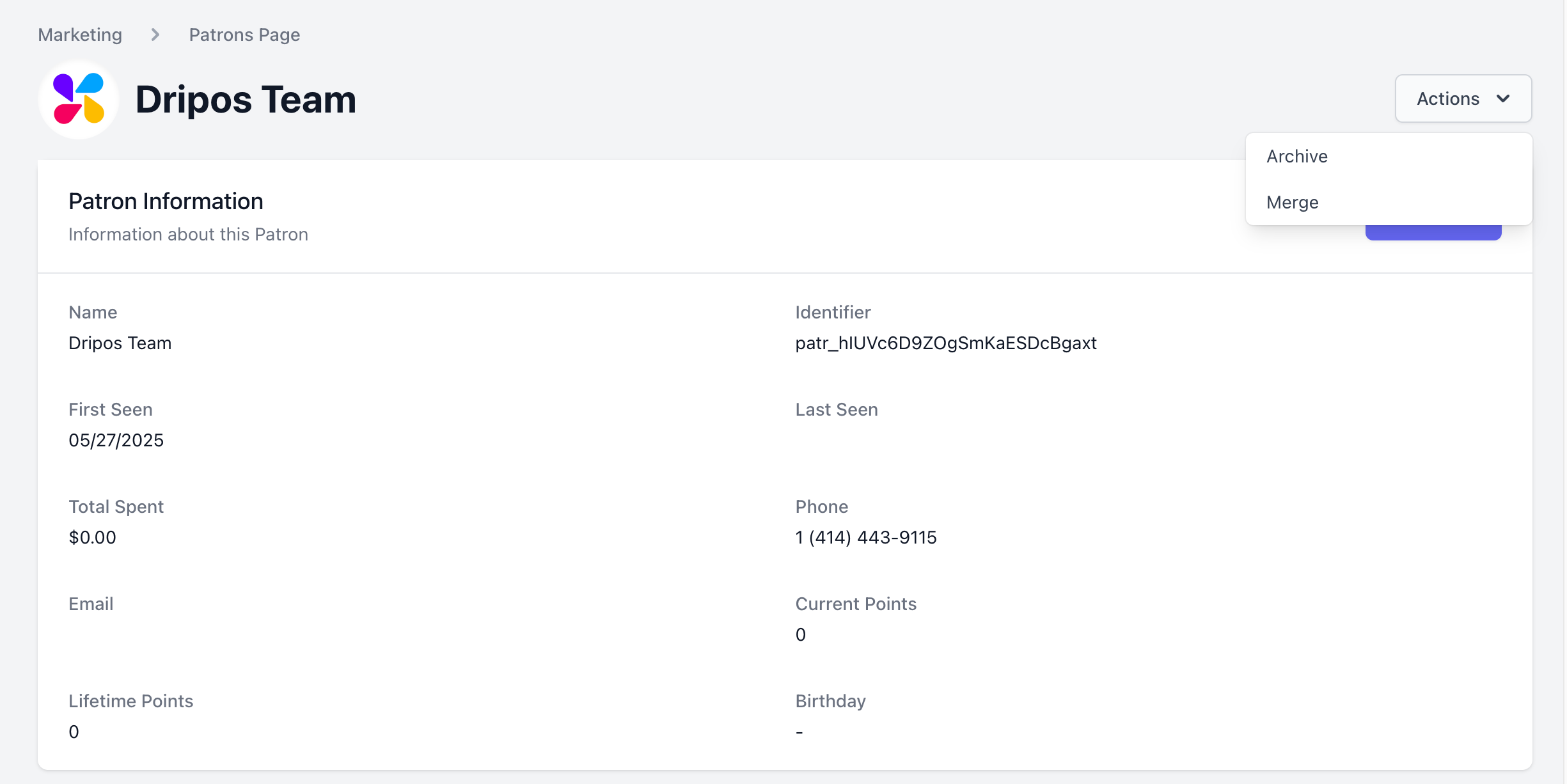 Merge two patrons’ loyalty points and transaction history into one patron account. To merge one patron account with another, Dripos will transfer all data and history from one patron to another and the original account will be archived.How to Merge Patron Accounts