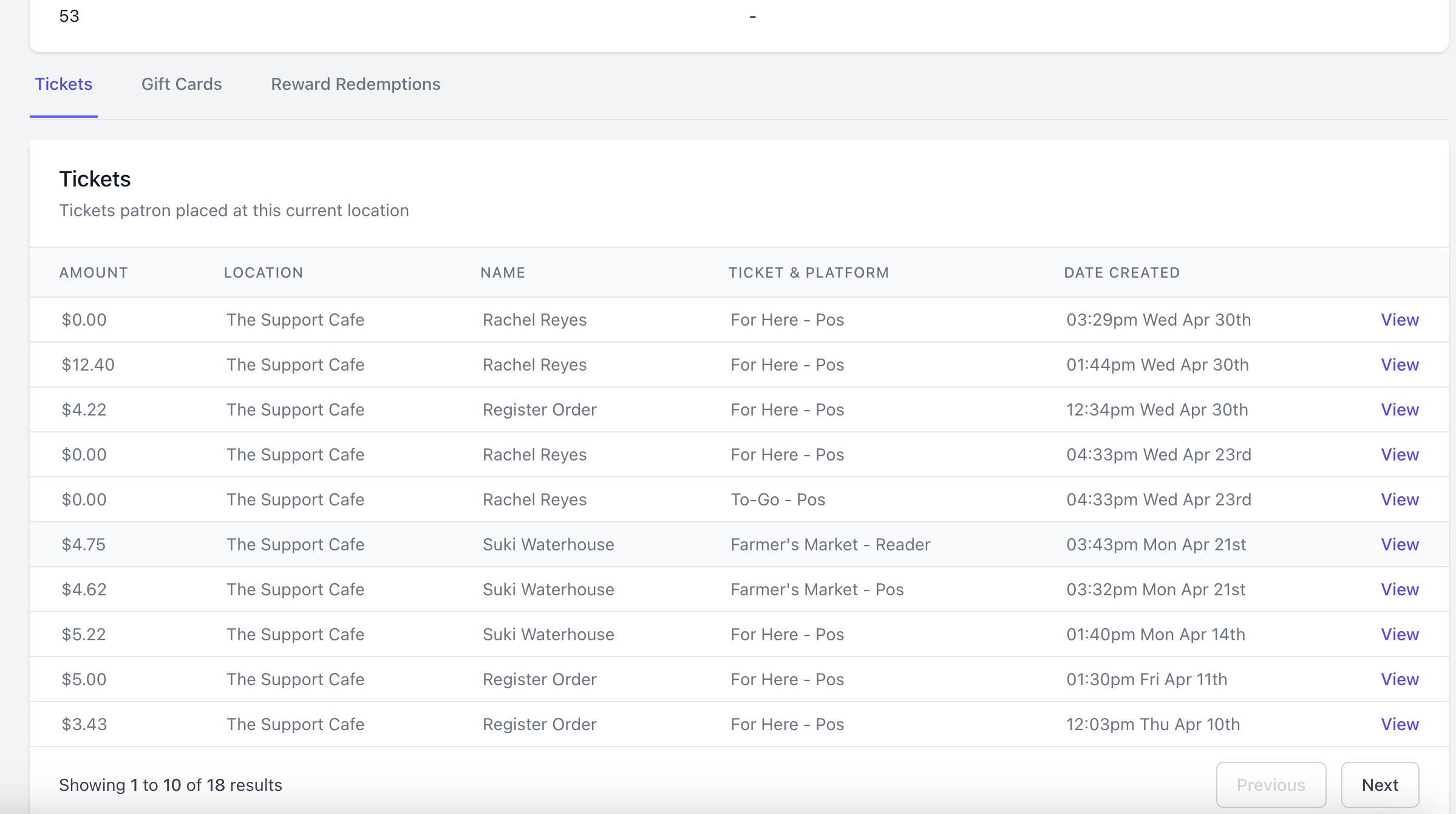 Scroll to the bottom of the patron profile > click Tickets to see all orders placed by this patron.Click View on an individual ticket to see its order details.