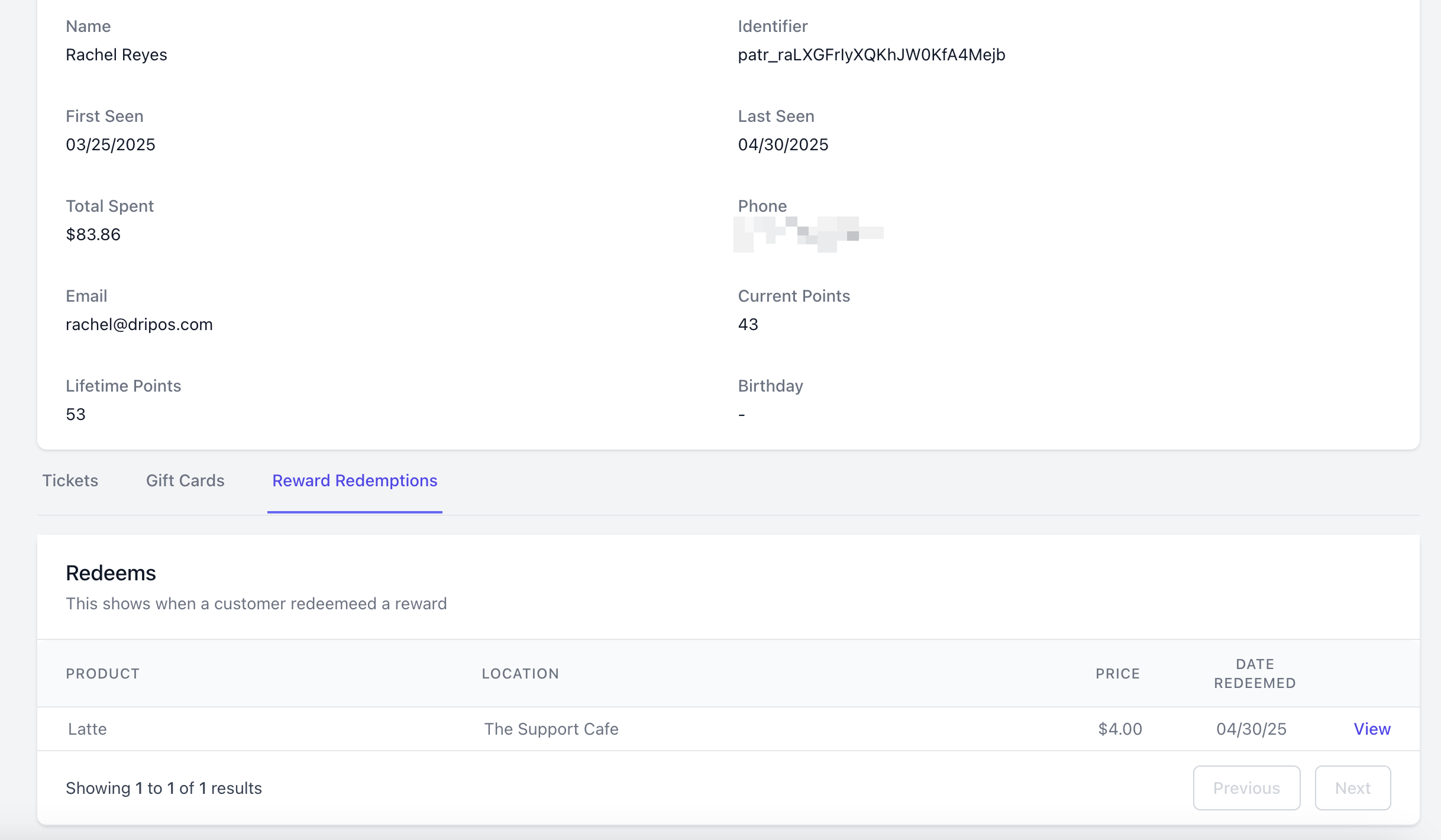 Scroll to the bottom of the patron profile > click Reward Redemptions to see all loyalty redemptions by this patronClick View on an individual redemption to see the order details.