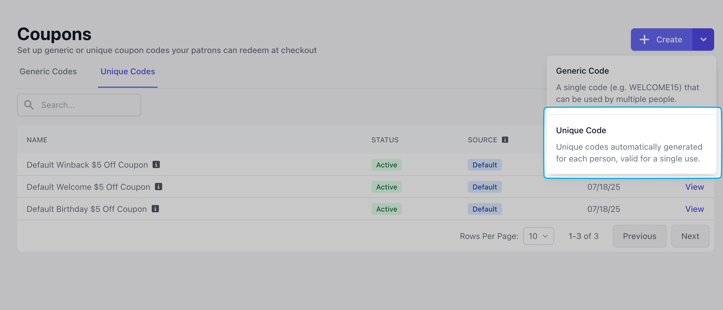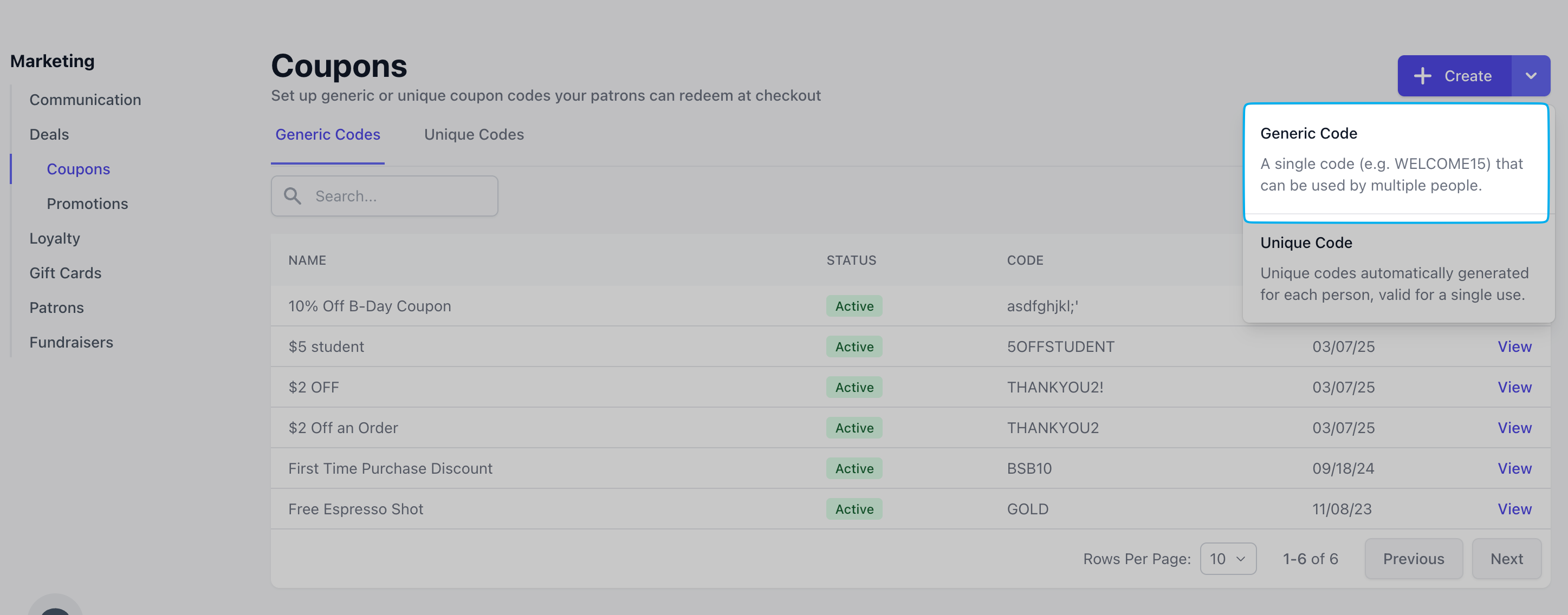 The intended use for a Unique Coupon Code is within Dripos’ Marketing Campaigns feature. Unique coupon codes are sent through automated text and email messages. When a message includes a coupon, a one-time code is generated for each customer, which can only be used once by that individual.If a customer has an email and phone number on file, and receives an email and text message for the same campaign, the same unique one-time coupon will be sent to both platforms.