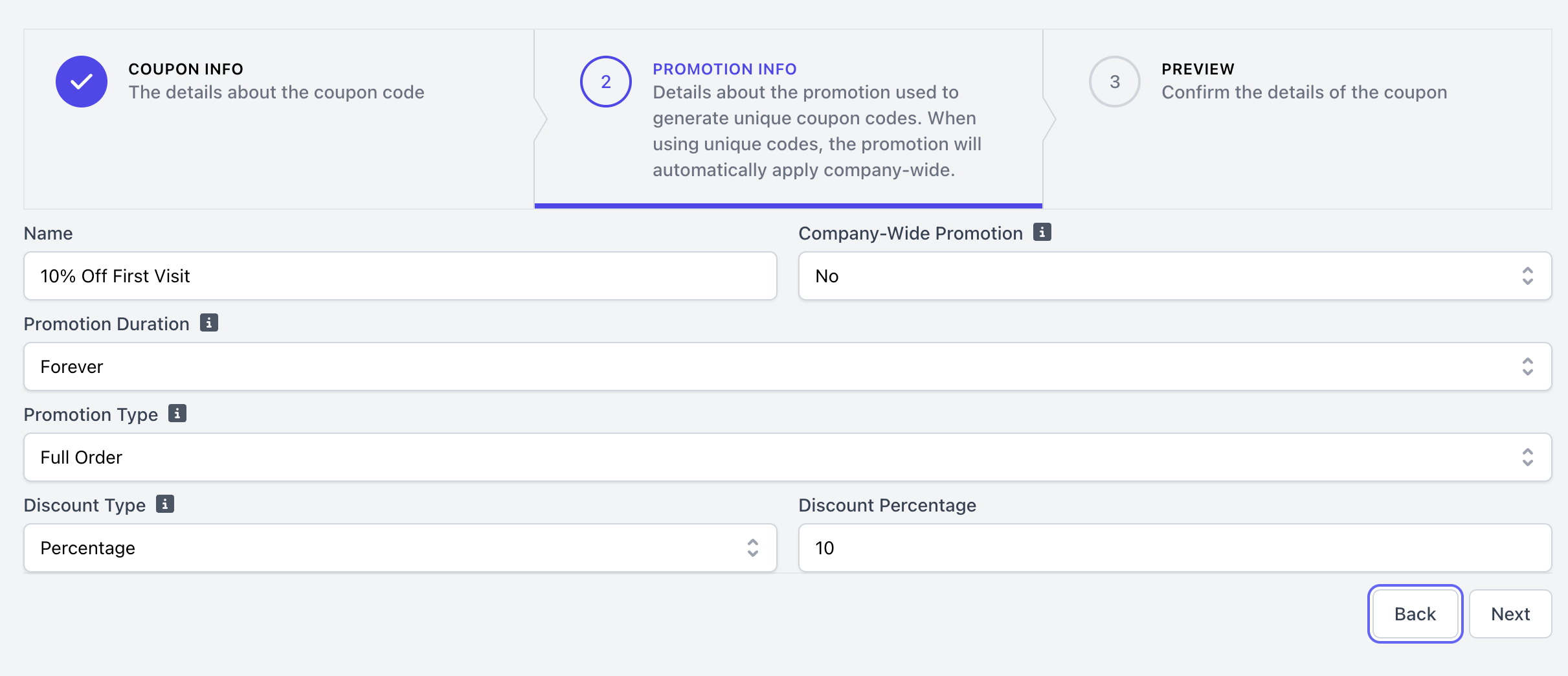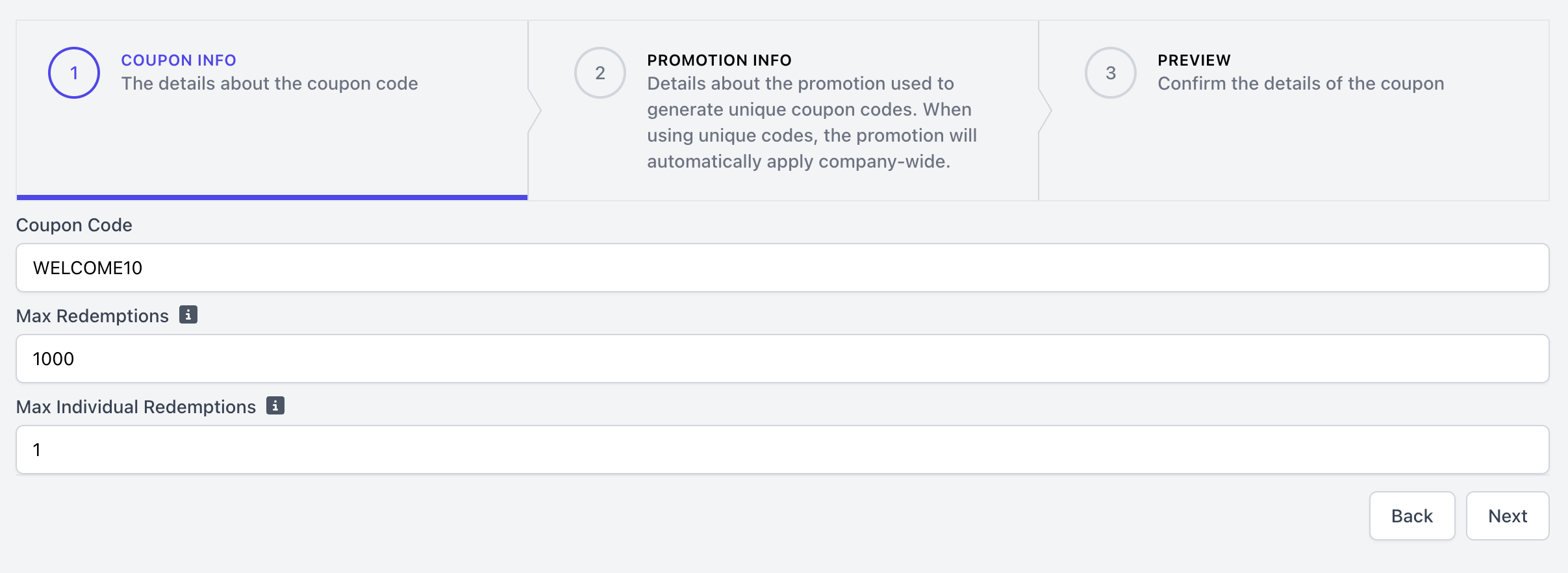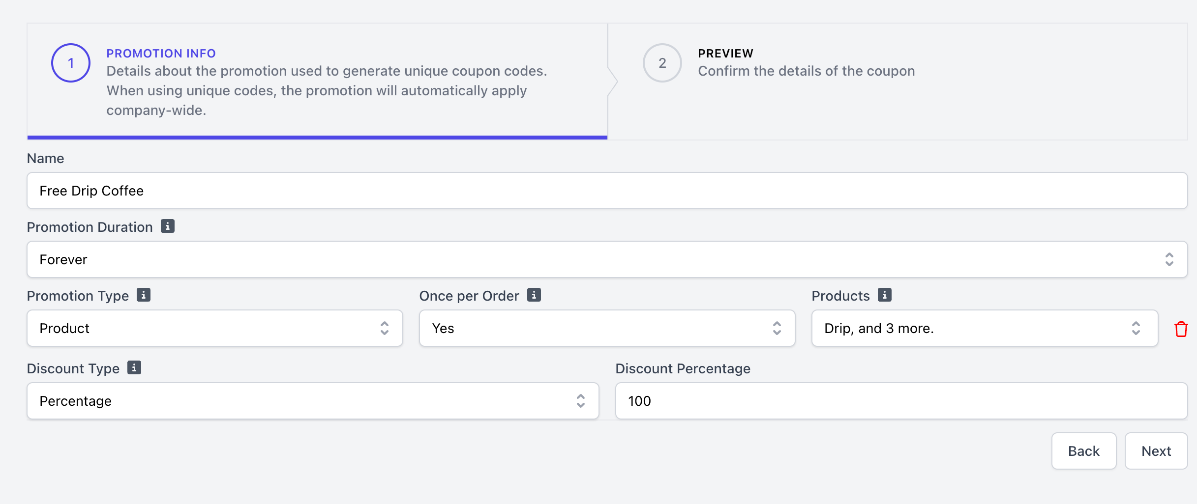 Preview all coupon details and click save to create. Coupons may be edited or deleted at any time.